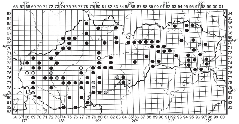 (n = 153). Biele krúžky – rok 2008, sivé – rok 2009, čierne – roky 2010 až 2012 (Panigaj et al. 2014).
