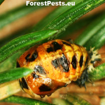 Podstatne lepšie možnosti determinácie poskytujú larvy. U prvého a druhého instaru sú pomerne homogénne tmavé – šedočierne, s dvoj- až trojhrotovými tŕňovitými výbežkami na hrudi a zadnej časti tela. Larvy druhého instaru majú pár žltkastých bodiek na prvom brušnom článku. Larvy tretieho instaru charakterizujú oranžové rady výbežkov na 1. až 5. brušnom článku. Larvy štvrtého instaru majú oranžovú aj kutikulu okolo týchto výbežkov a tiež žltooranžové prostredné výbežky na 1., 4. a 5. článku.