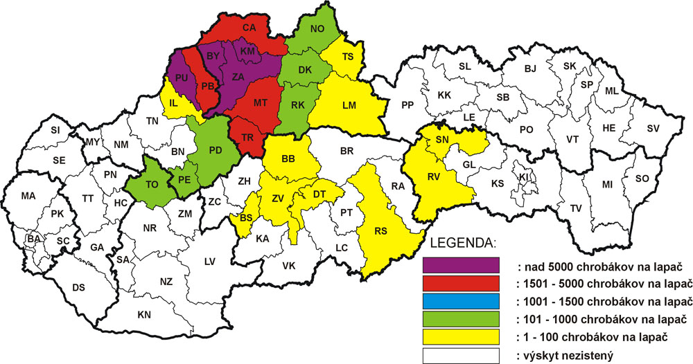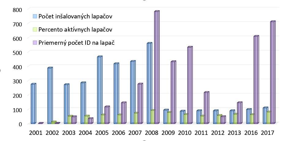 | Počet inštalovaných lapačov, percento aktívnych lapačov a priemerný odchyt lykožrúta severského za roky 2001-2017. | Mapa maximálnych odchytov do feromónových lapačov v r. 2017 |