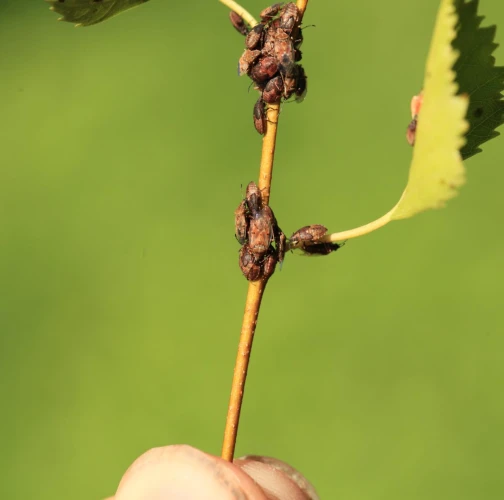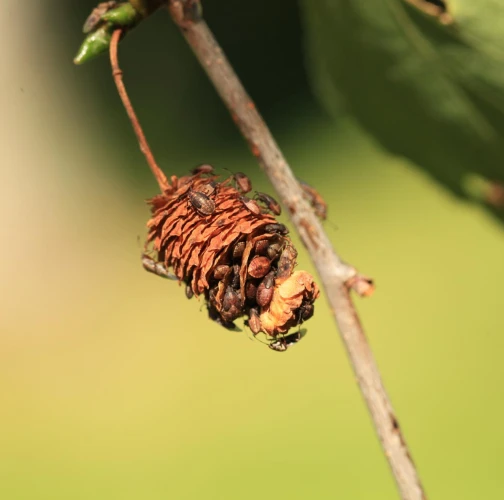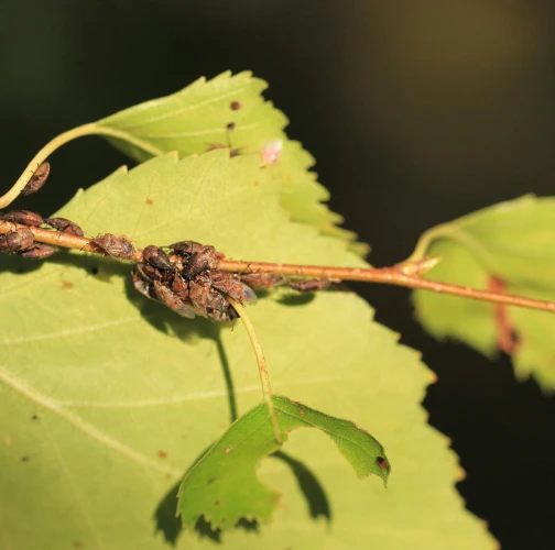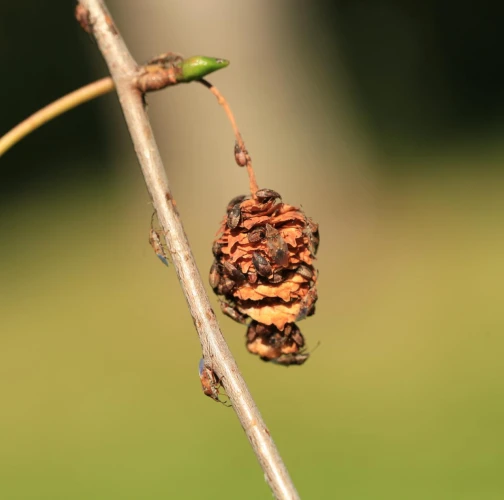 Malé, hnedé bzdochy na jahňadách brezy, ale aj na listoch, kôre a prípadne aj v okolí briez.