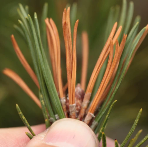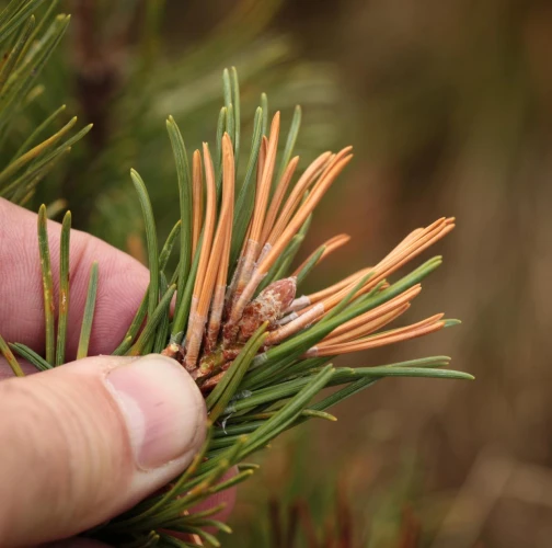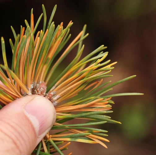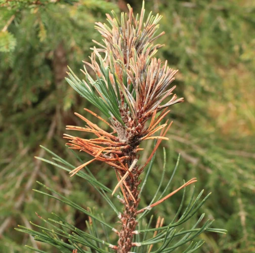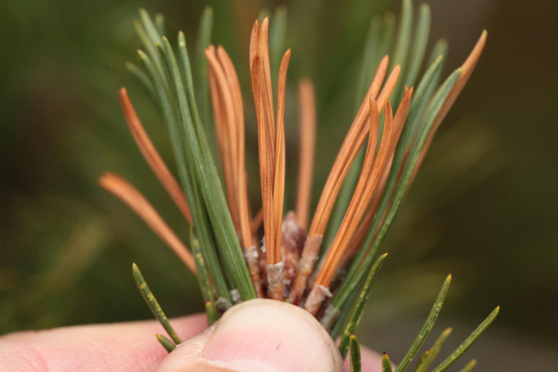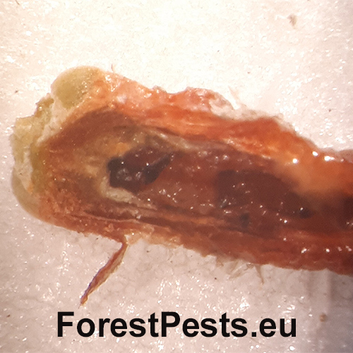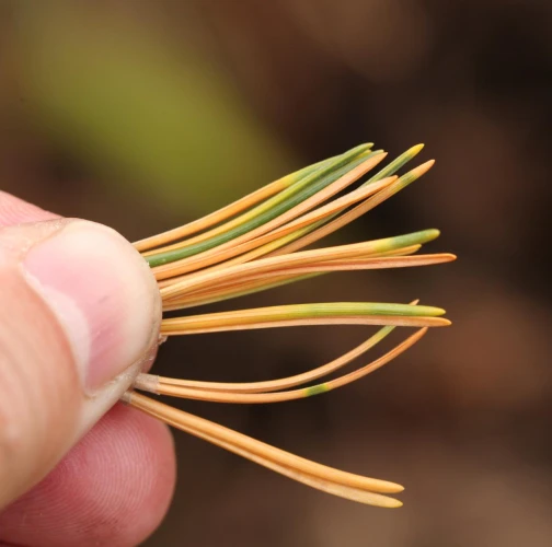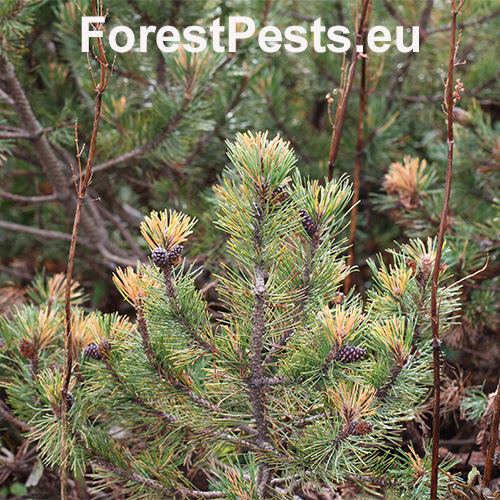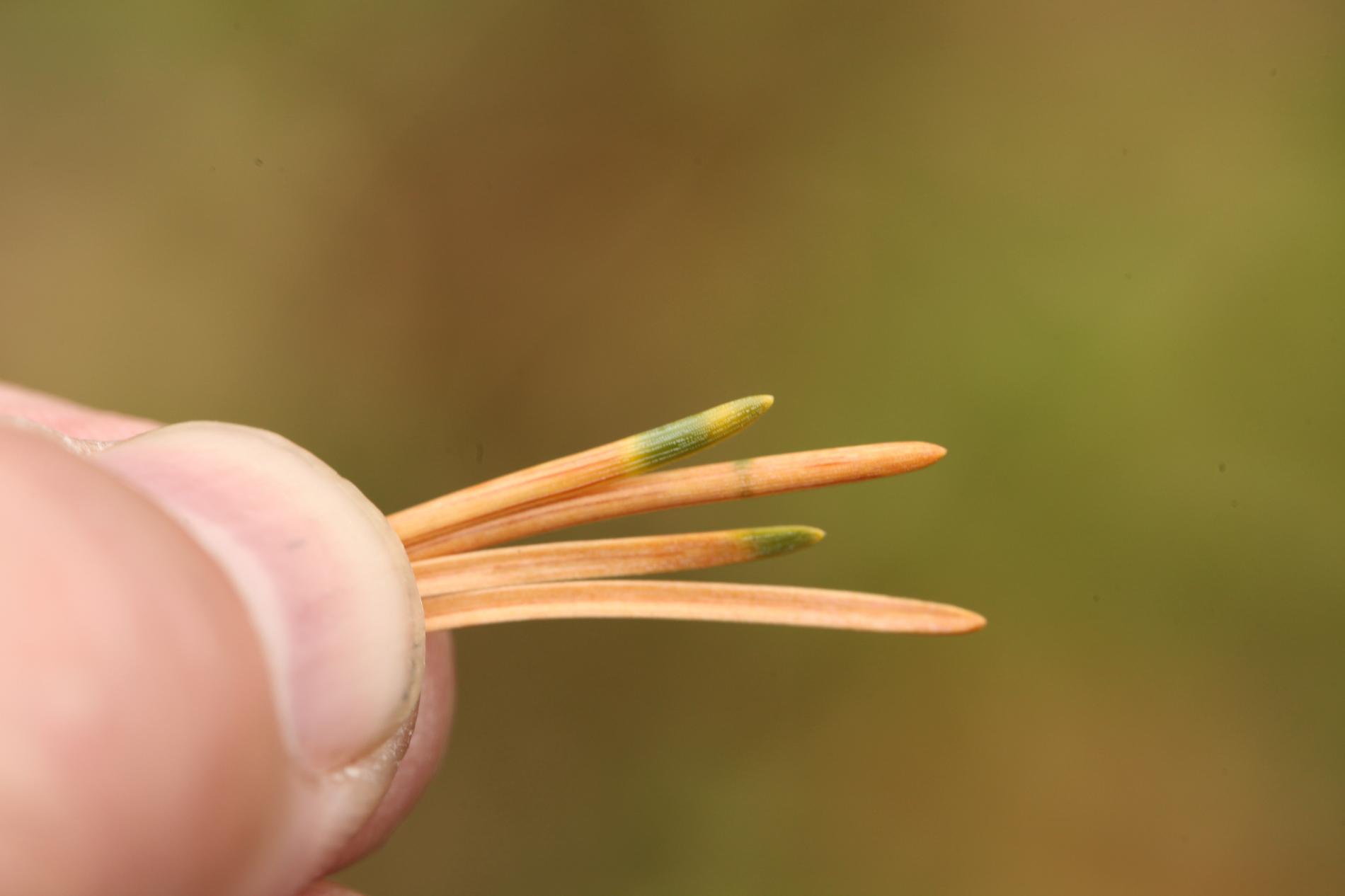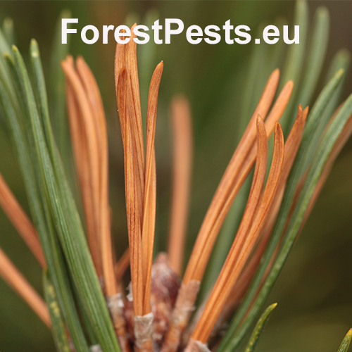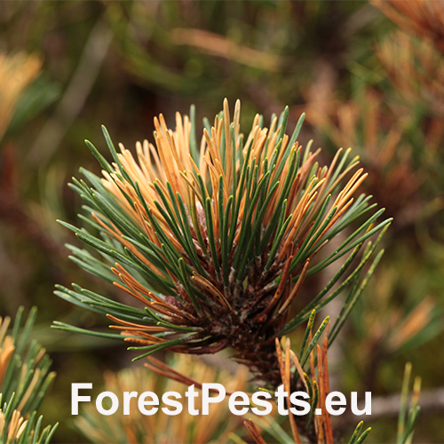 Hrdzavá farba ihlíc a celých porastov. Niekedy skracovanie ihlíc. V pazuche ihlice žije drobná, oranžová larva.