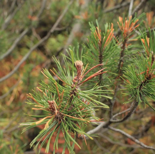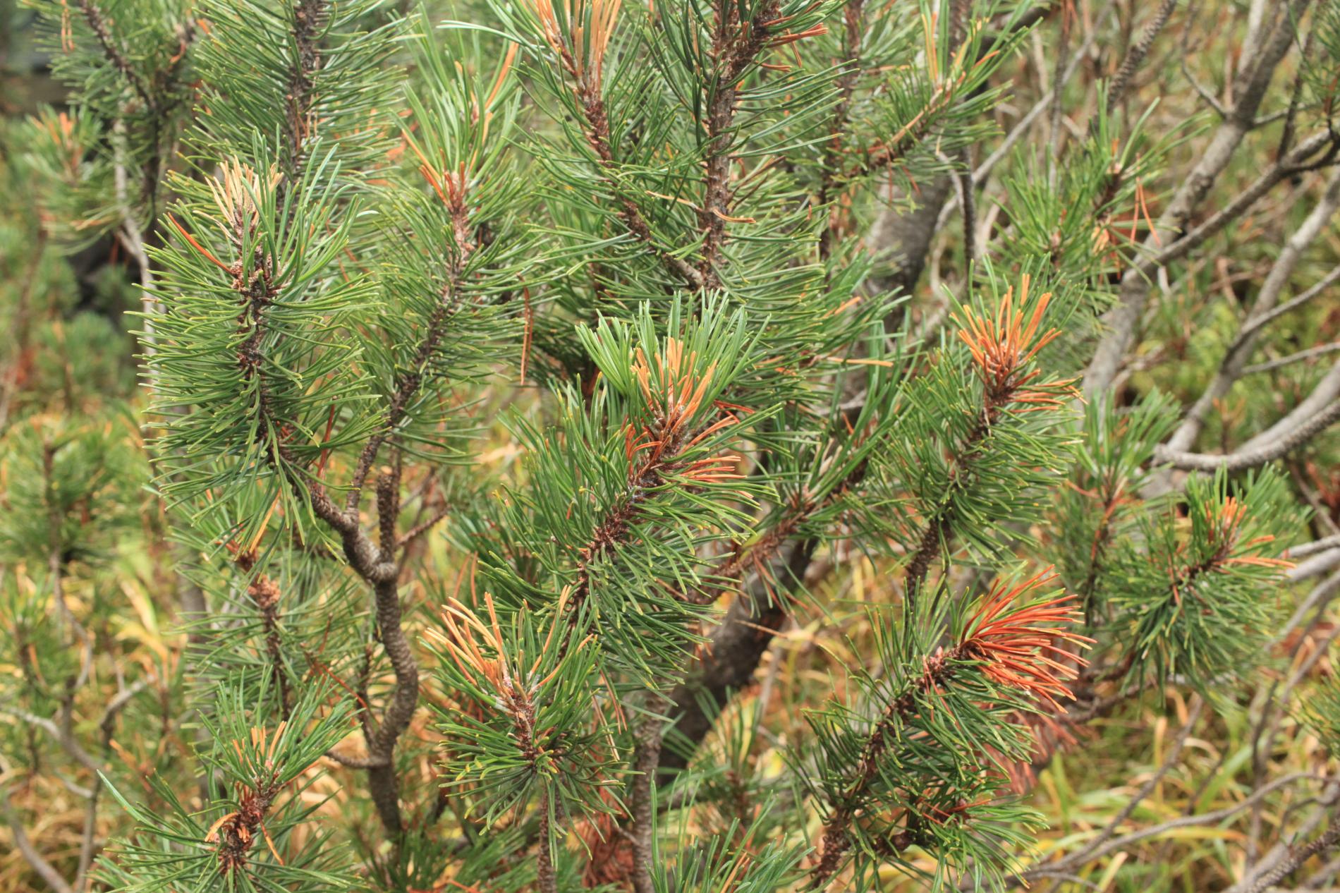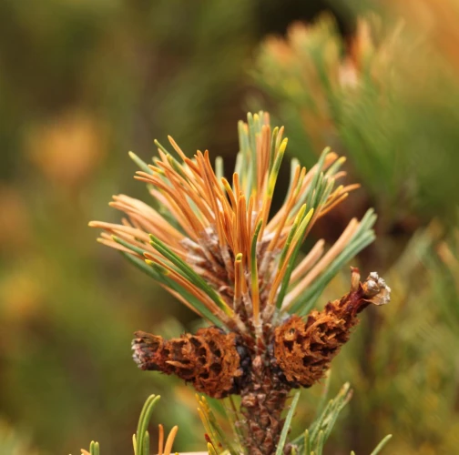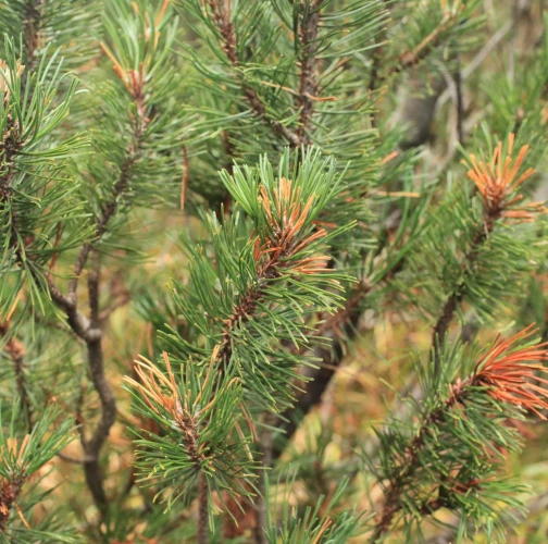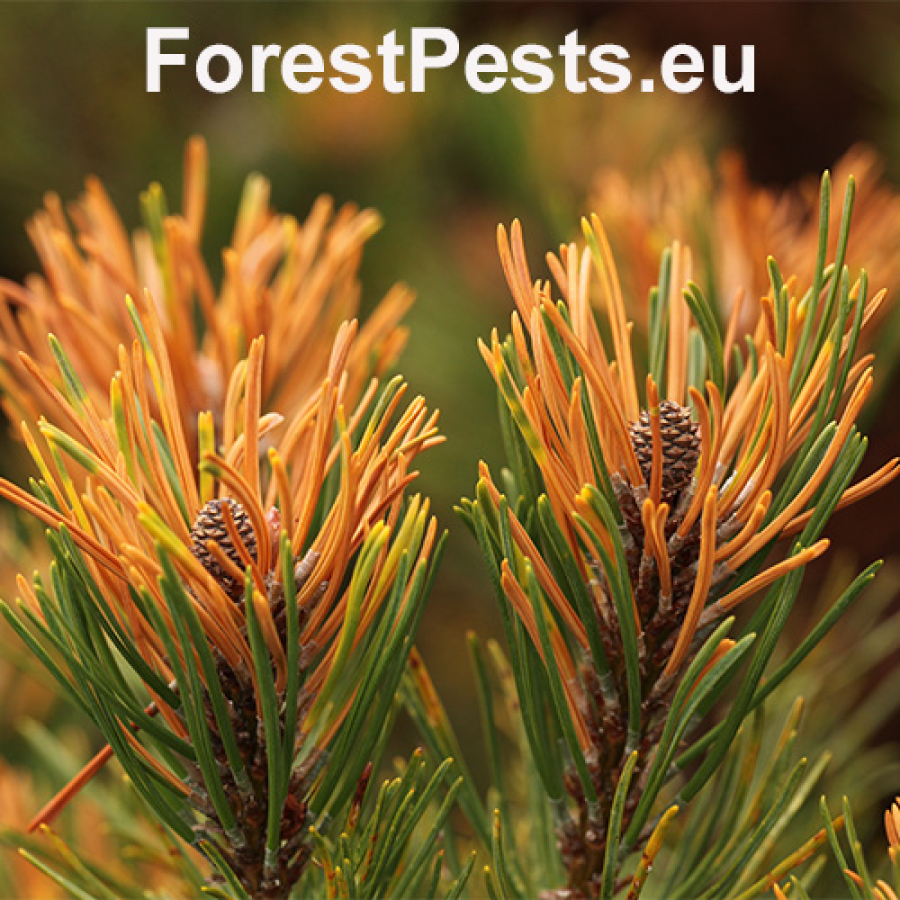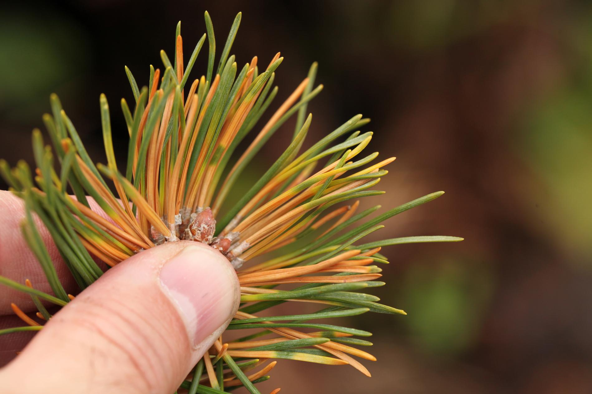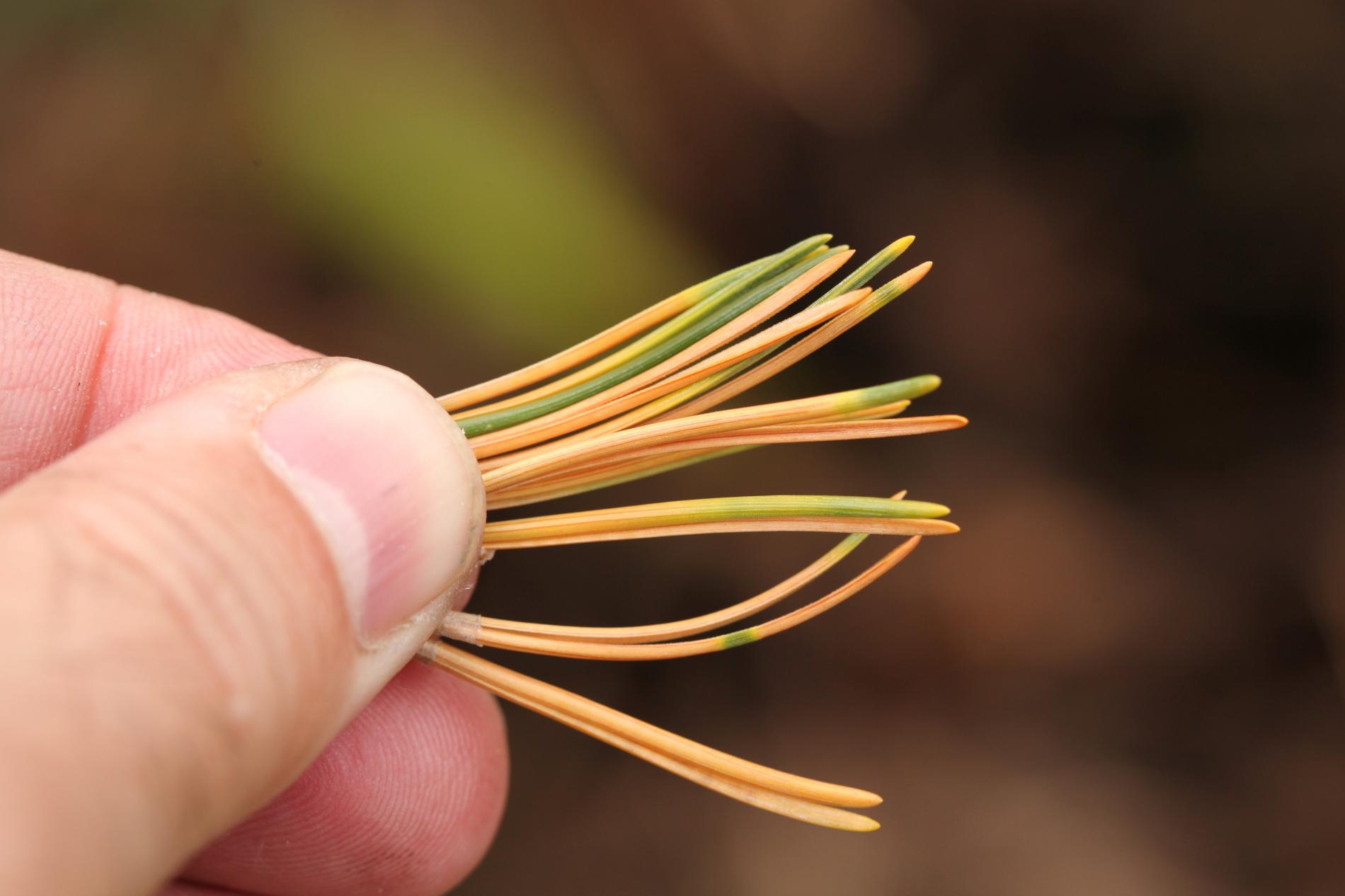 Hrdzavá farba ihlíc a celých porastov. Niekedy skracovanie ihlíc. V pazuche ihlice žije drobná, oranžová larva.