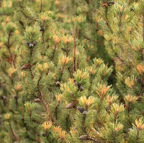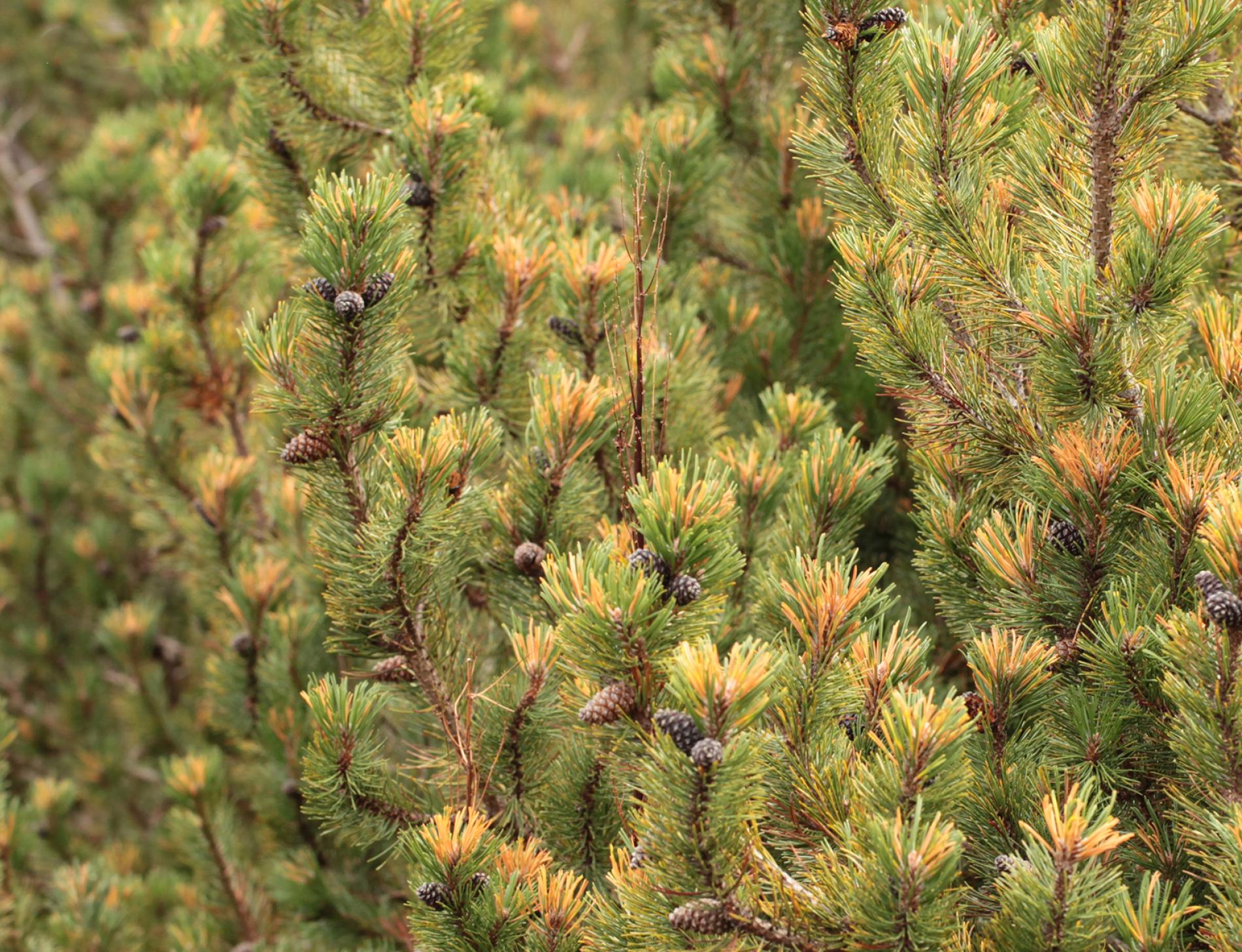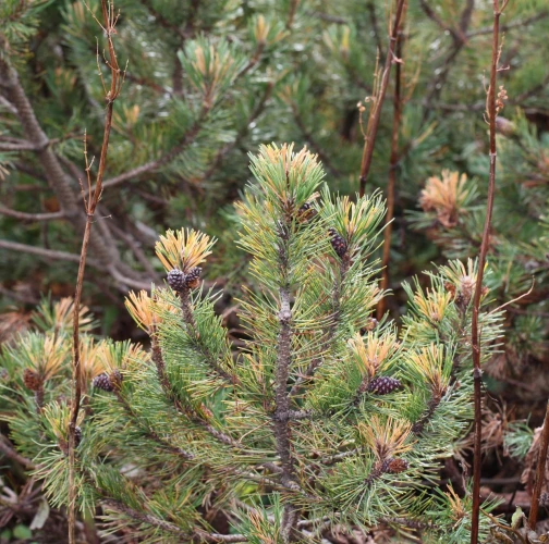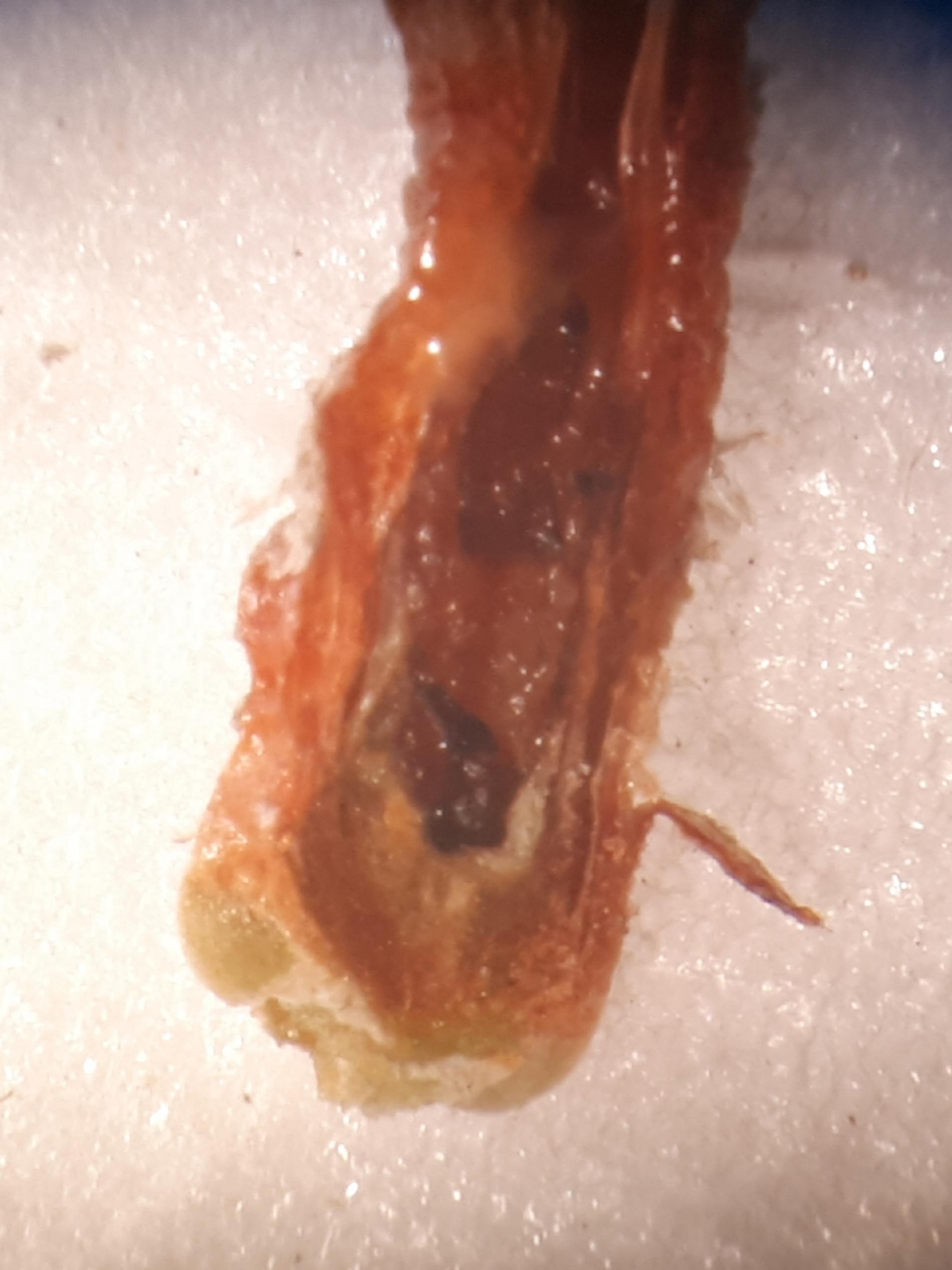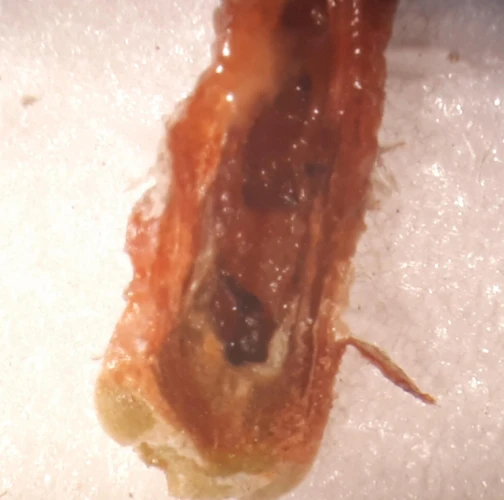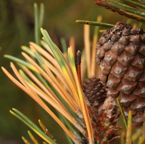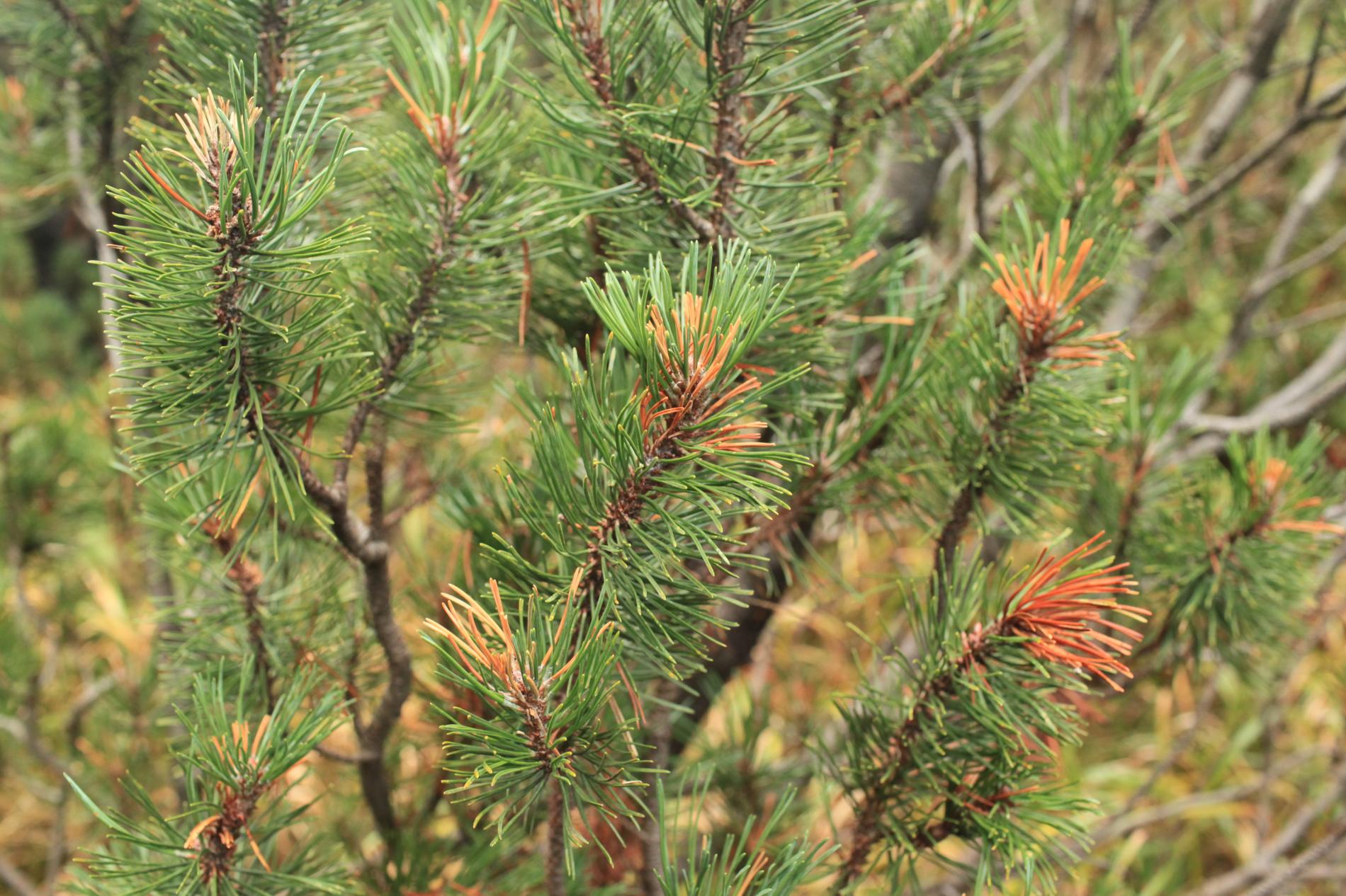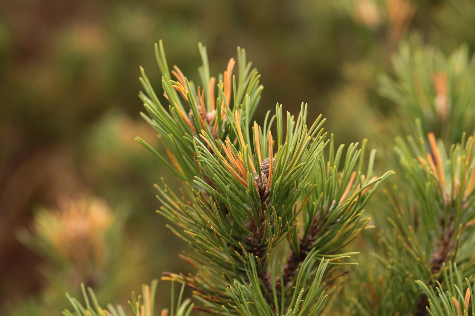 Hrdzavá farba ihlíc a celých porastov. Niekedy skracovanie ihlíc. V pazuche ihlice žije drobná, oranžová larva.