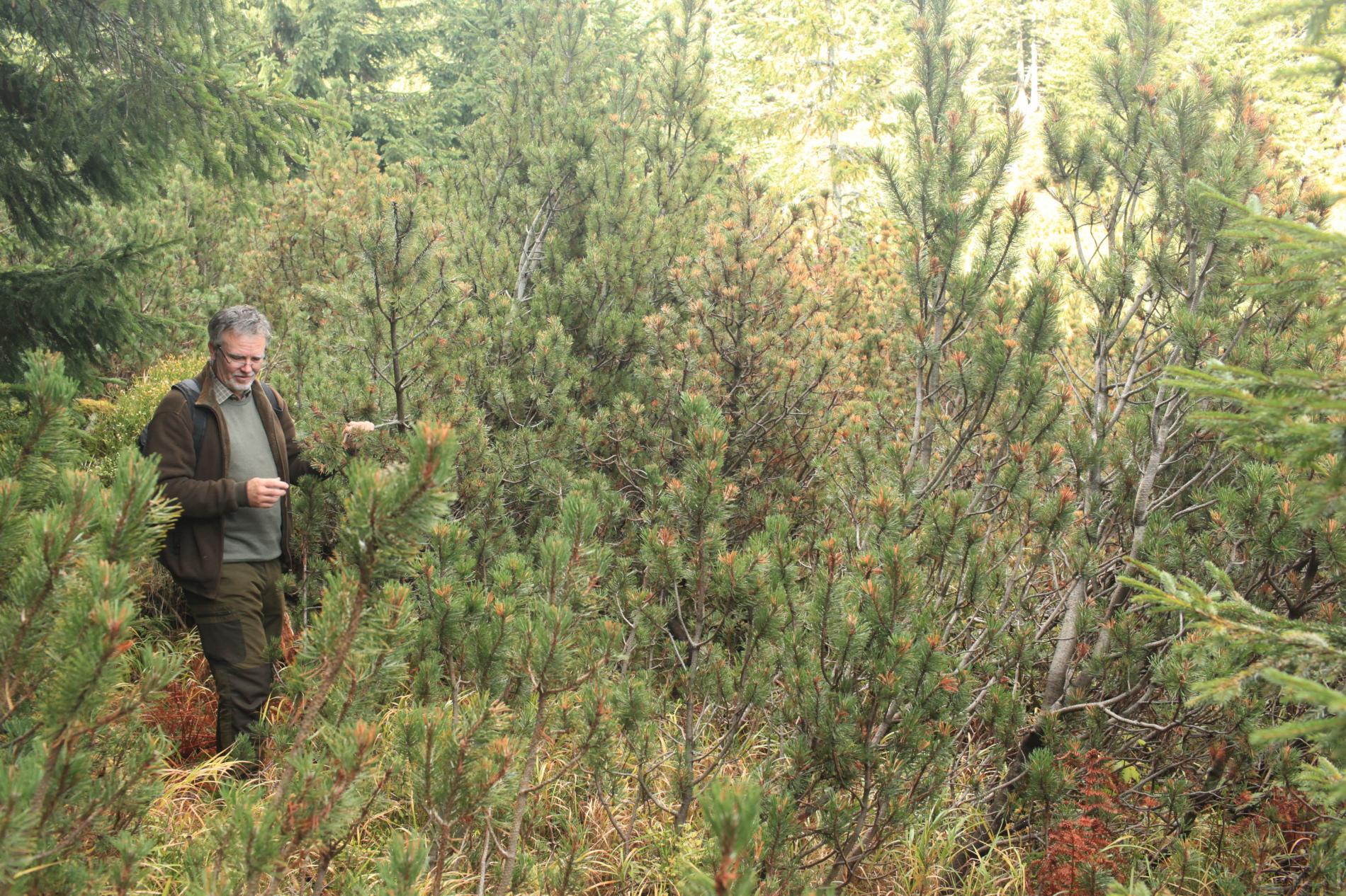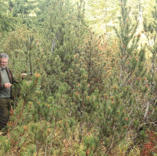 Poškodenie sa navonok prejavuje hrdzavou farbou ihlíc a celých porastov. Byľomor borovicový Thecodiplosis brachyntera je drobný hmyz z čeľade Cecidomyiinae. Zástupcovia tejto čeľade robia háky na rôznych drevinách. Larvy tohto druhy žijú na báze ihlíc borovice, žerom ich poškodzujú takže ihlice následne hynú – hrdzavejú a hnednú. Druh žije aj na iných druhoch borovíc, pričom uprednostňuje kosodrevinu. Môže sa premnožovať na rozsiahlych výmerách. Napáda najmä tohtoročné ihlice ale nevyhýba sa ani starším. Imága lietajú hojne počas teplých májových dní. Kladú vajíčka na ihlice. Larvy žijú do jesene v ihlici, prezimujú v zámotku na vetvičke alebo v pôde a na jar sa kuklia.
