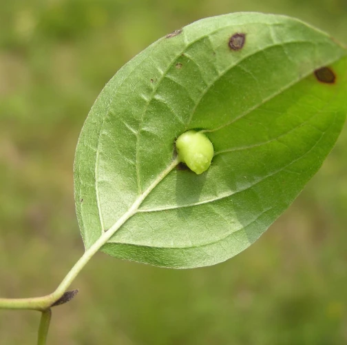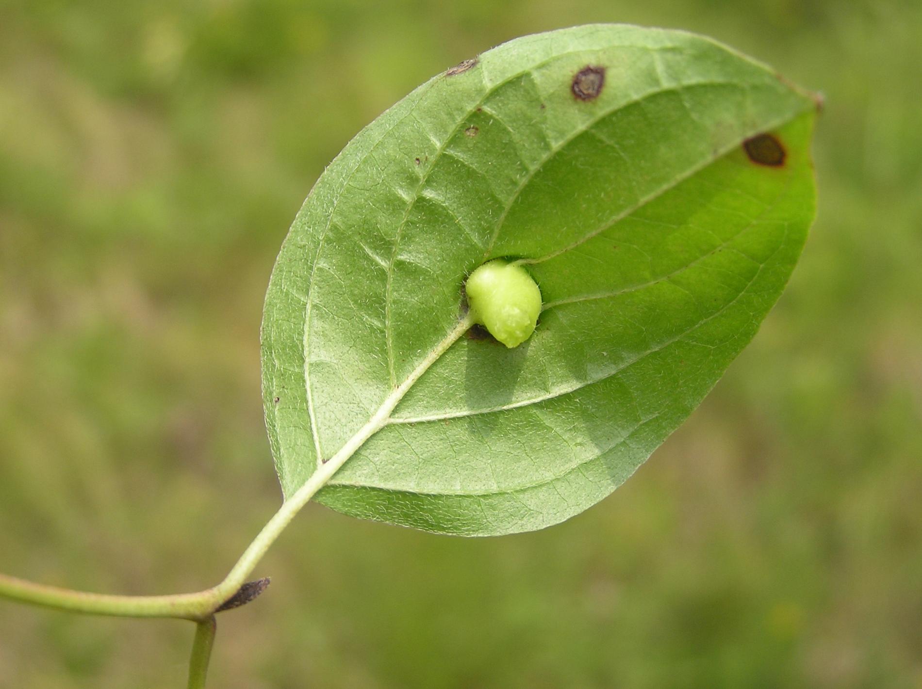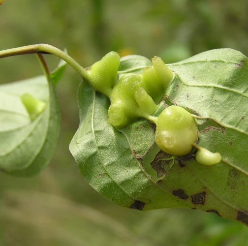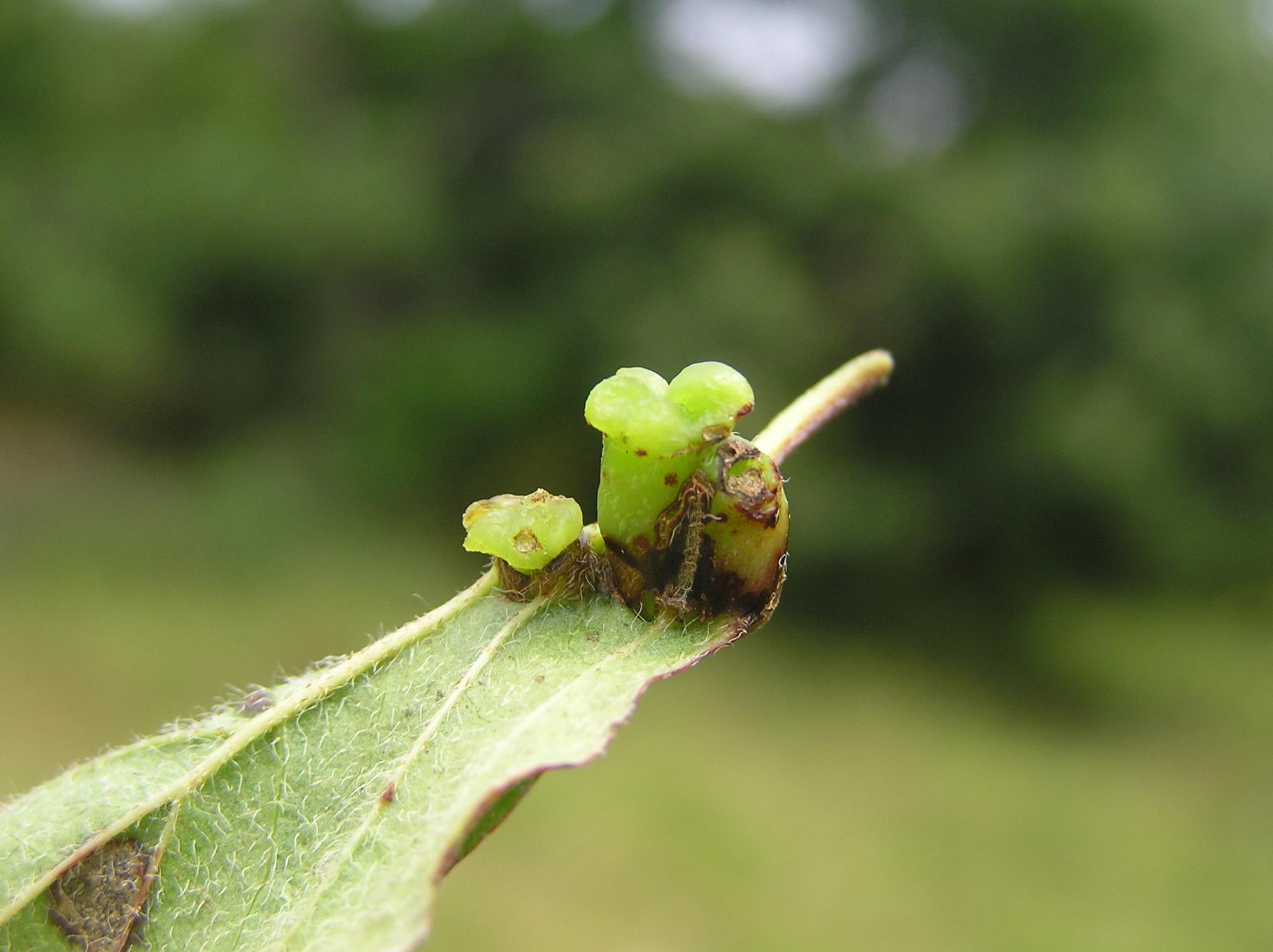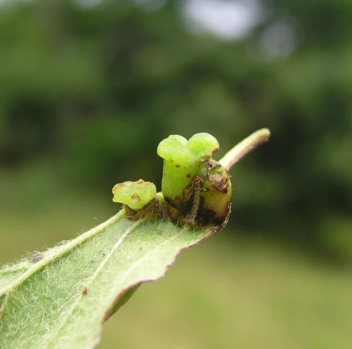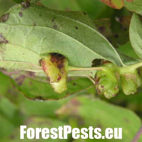 Na listoch sa vyskytujú masívne hálky. Z vrchnej strany vyzerajú ako relatívne pravidelné, hladké, kónické výrastky vysoké asi 5 – 6 mm a na spodnej strane listu ako nepravidelné „korene“ toho istého útvaru, veľké 8 – 15 mm. Farba hálok je zelená až červenohnedá.