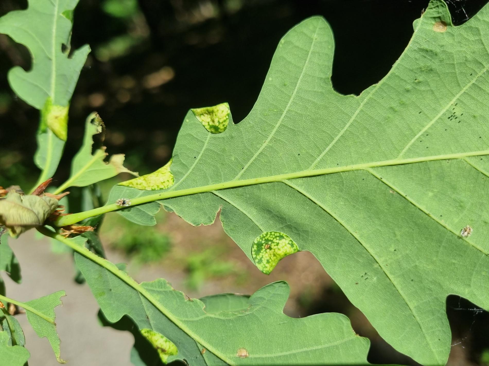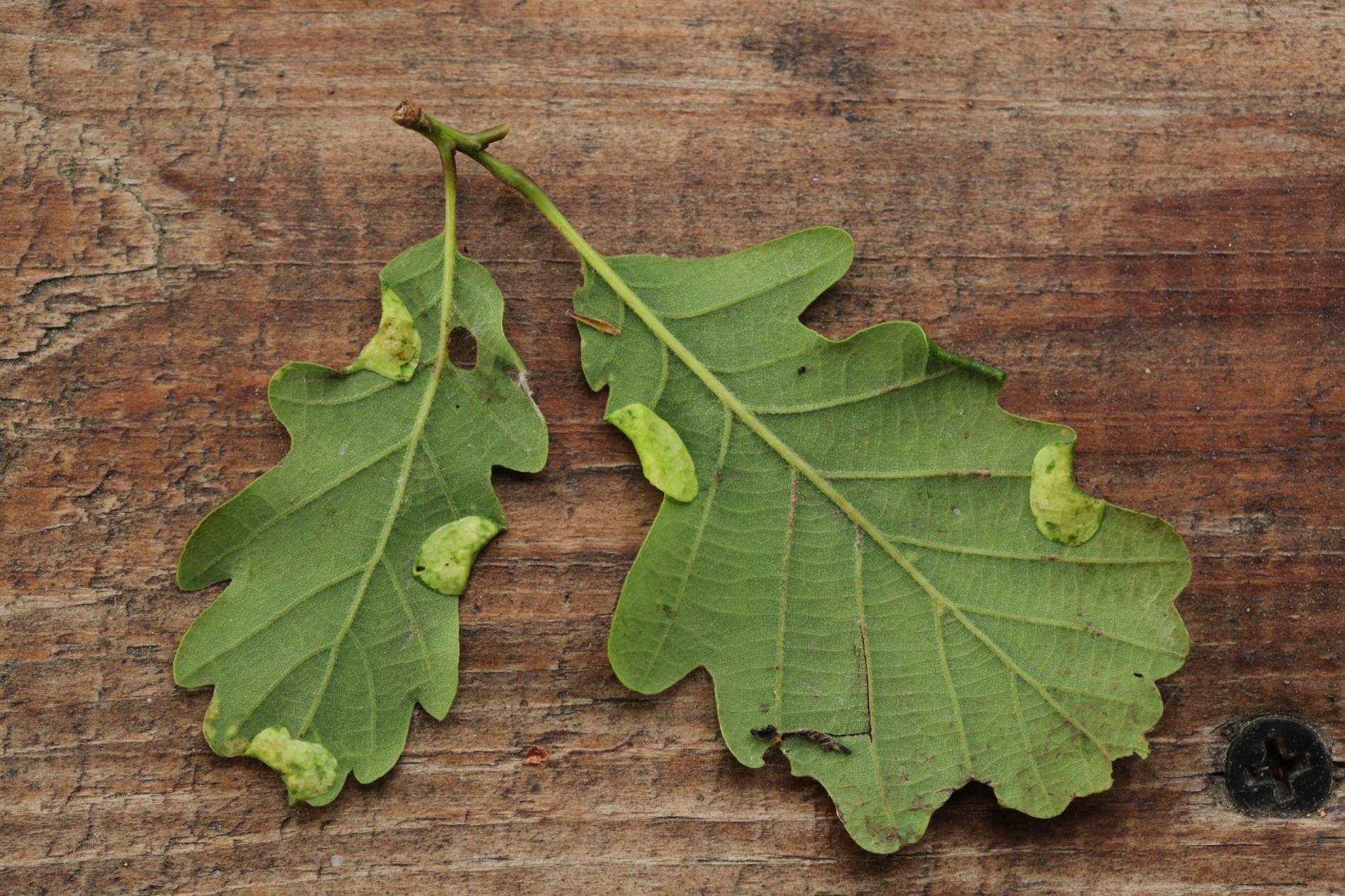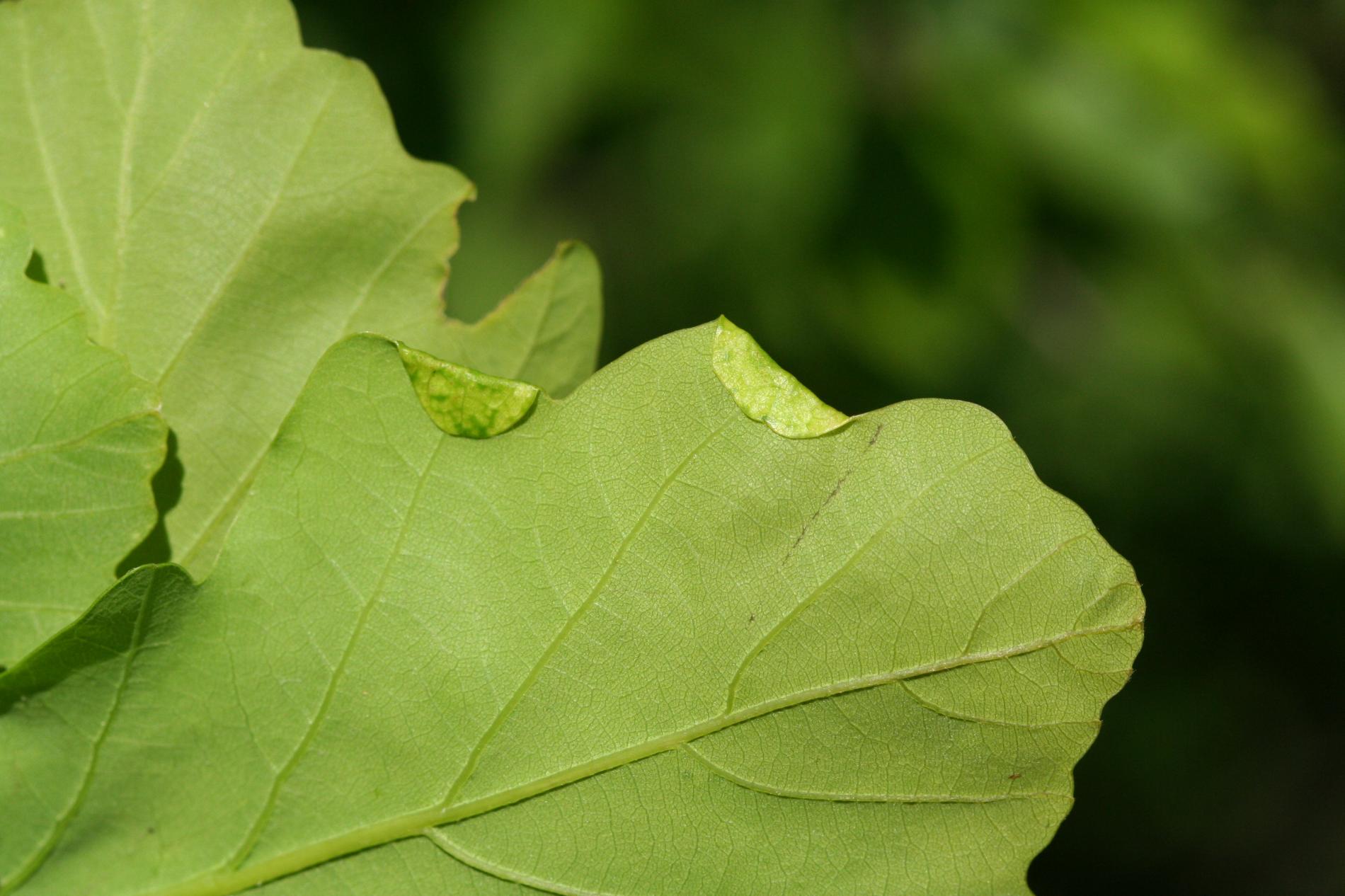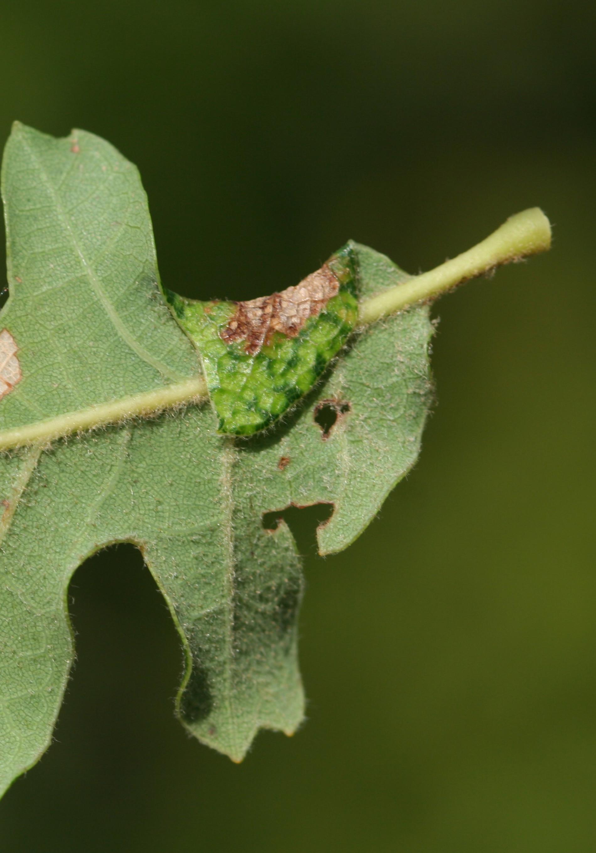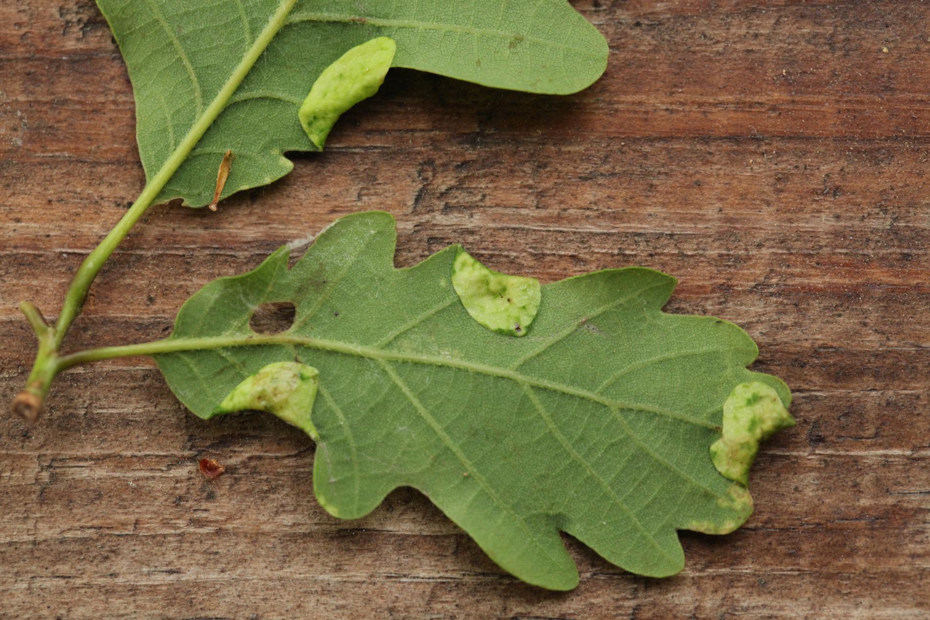 Hálky sa nachádzajú na vonkajšom okraji listového laloka. Zložená časť listu sa mierne zdurí a ohýba sa nadol. Je pokrytá škvrnitým vzorom. Vo vnútri zloženého listu sa často nachádza viac lariev. Larvy žijú v liste až do júna alebo júla, keď sa zakuklia a spadnú na zem.