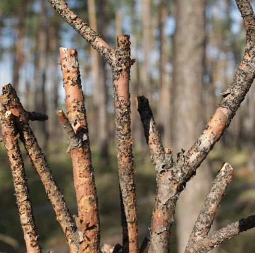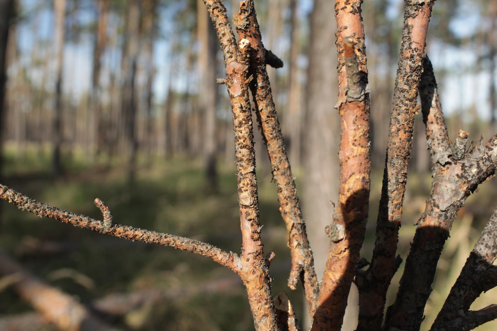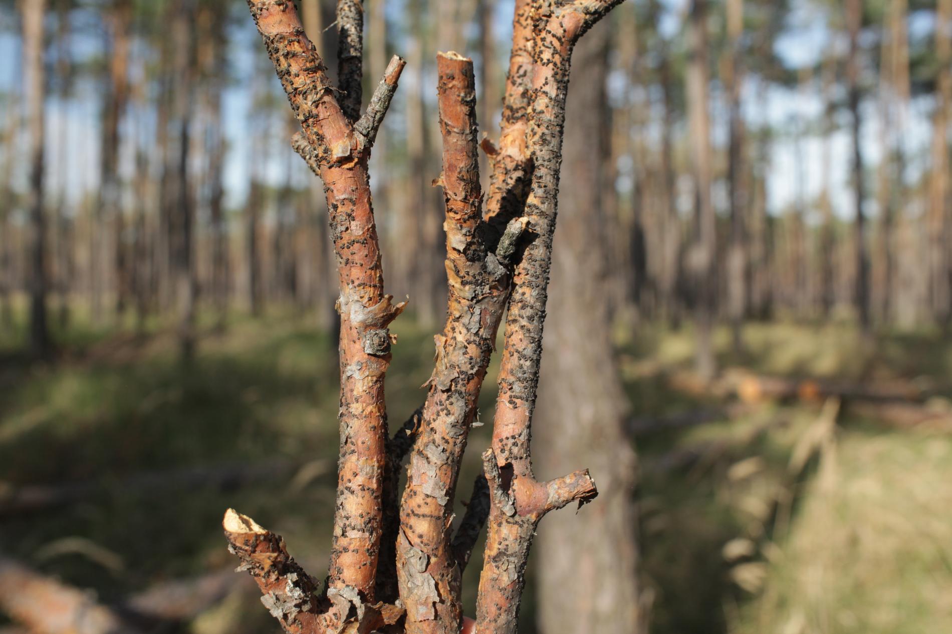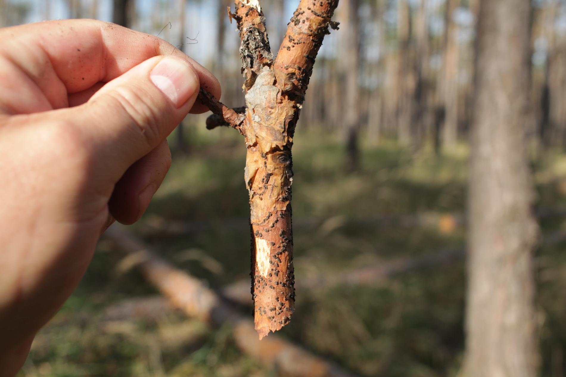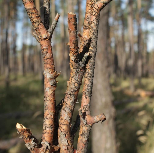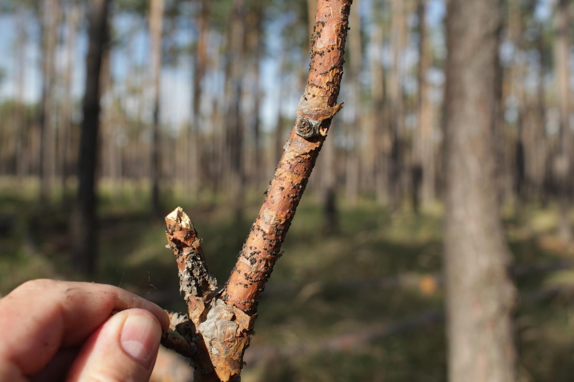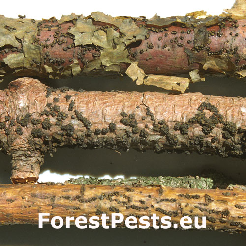 Ide o nekrotické ochorenie kôry vetiev rôznych druhov borovíc. K infekcii dochádza od polovice júla do polovice septembra cez rôzne poranenia vetiev. Ihlice hnednú od svojej bázy k hrotu, podkôrne pletivá pod ihlicami pritom odumierajú ešte pred objavením sa príznakov na ihliciach. Stále sú to však príznaky, ktoré pripomínajú aj infekciu hubami Sphaeropsis sapinea (Fr.) Dyko et Sutton alebo Gremmeniella abietina (Lagerb.)Morelet. Dôkazom cenangiózy sú plodnice, ktoré sa vytvárajú v štrbinách kôry odumretých vetiev typicky husto v riadkoch vedľa seba, prípadne v menších skupinkách. Za vlhka sú tieto plodnice tanierovito roztvorené, 1 – 2 mm široké, svetlohnedé. Za sucha sú sivé až čierne, lístkovito zložené.