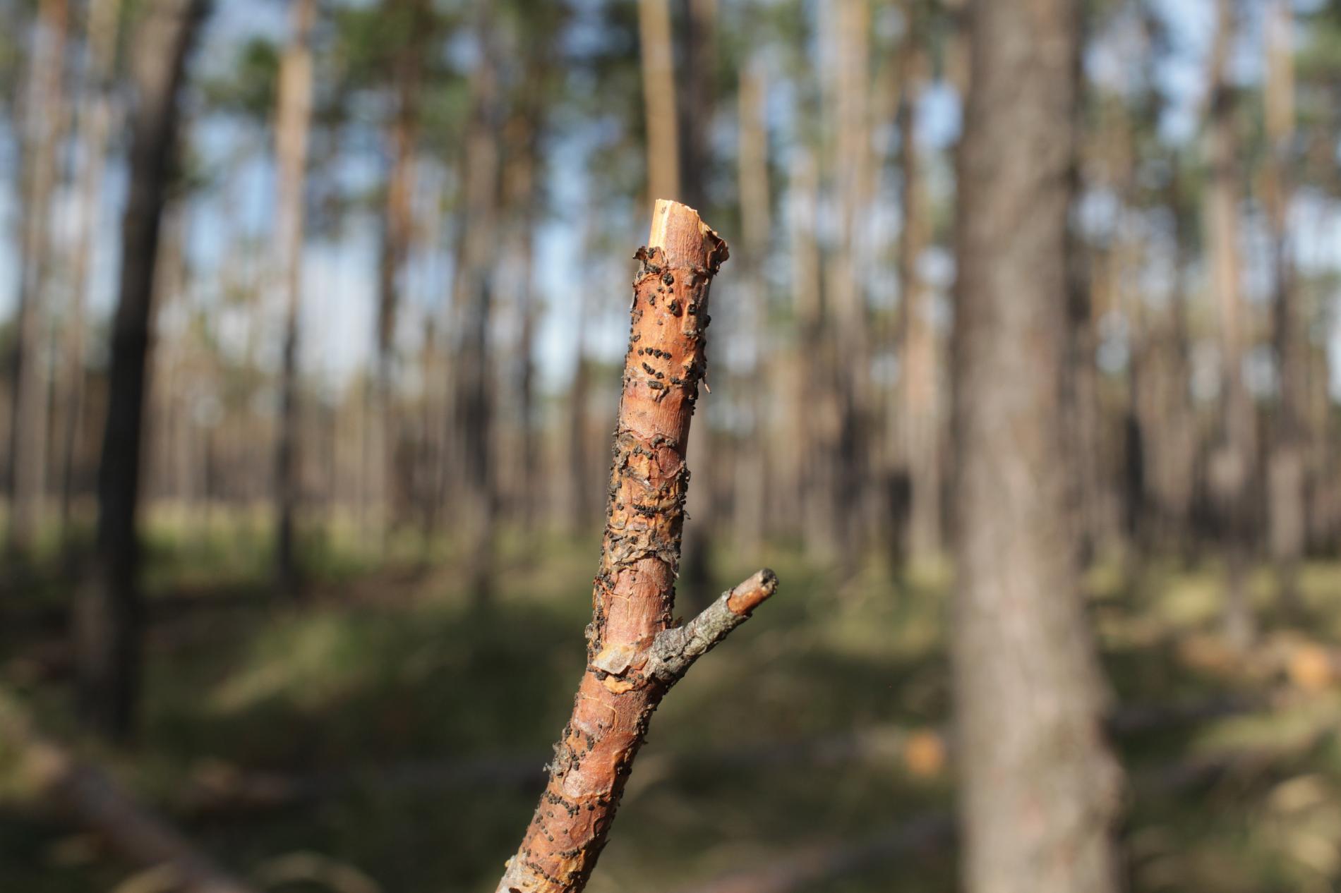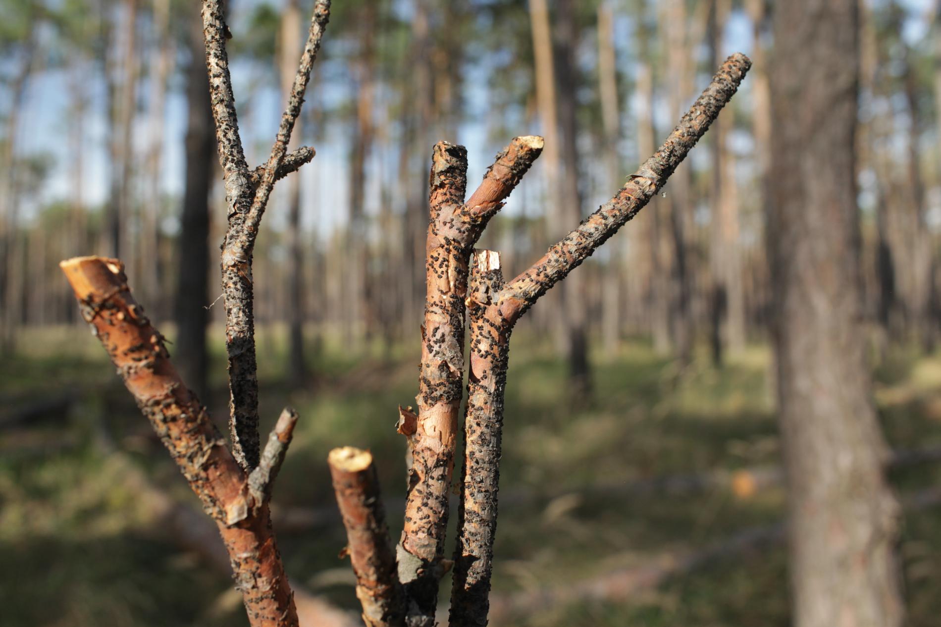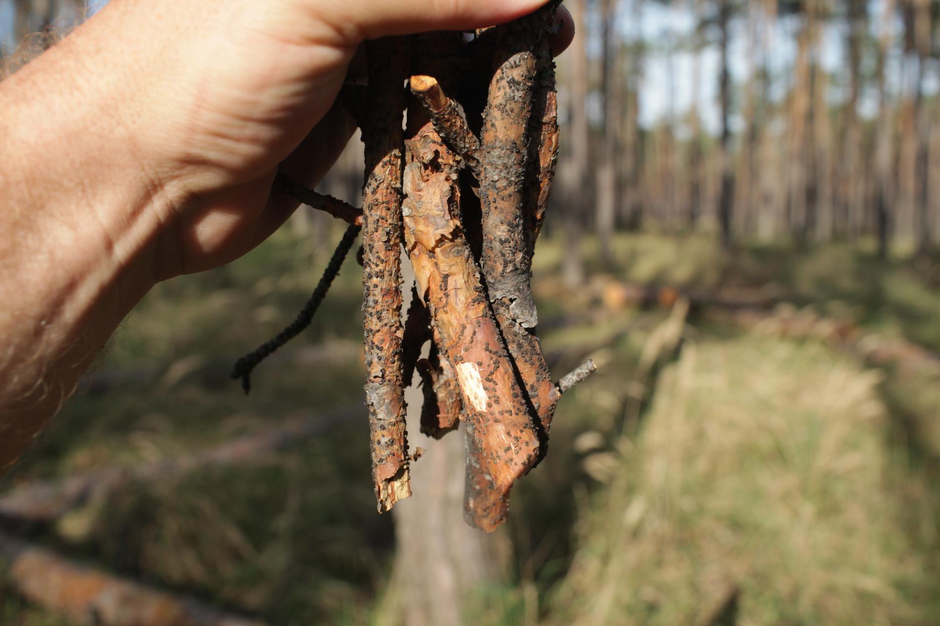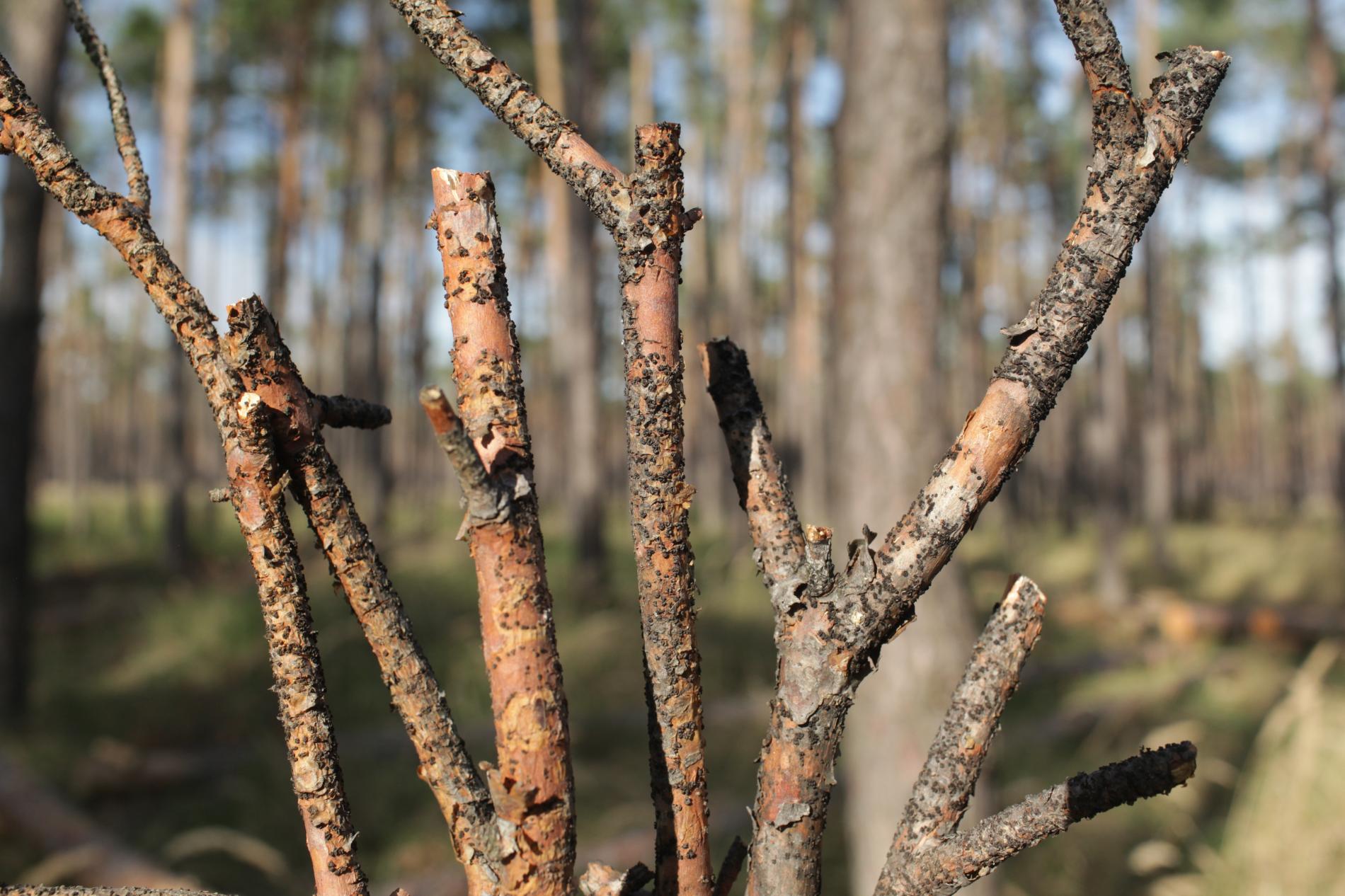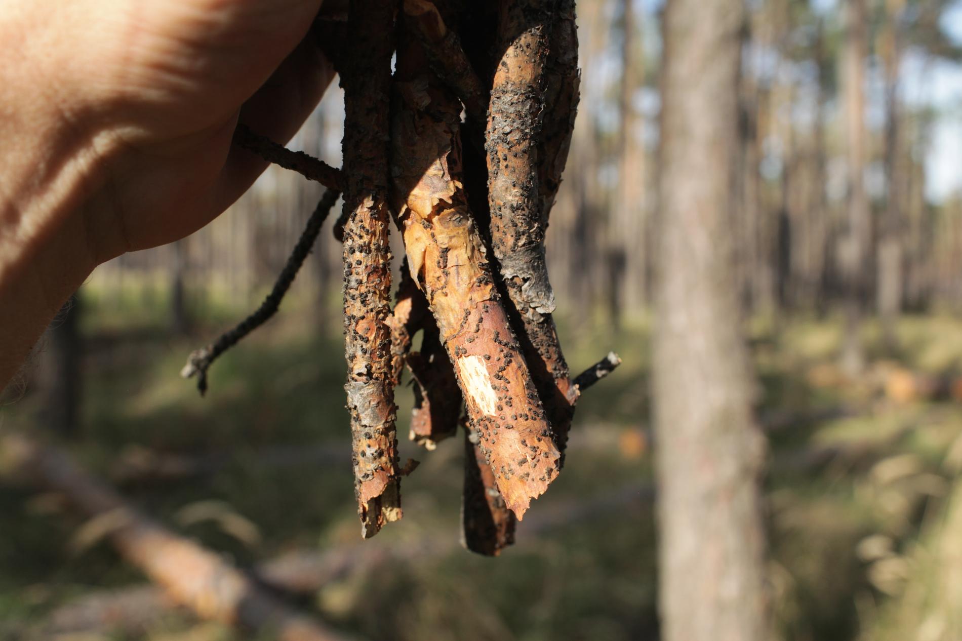 Ide o nekrotické ochorenie kôry vetiev rôznych druhov borovíc. K infekcii dochádza od polovice júla do polovice septembra cez rôzne poranenia vetiev. Ihlice hnednú od svojej bázy k hrotu, podkôrne pletivá pod ihlicami pritom odumierajú ešte pred objavením sa príznakov na ihliciach. Stále sú to však príznaky, ktoré pripomínajú aj infekciu hubami Sphaeropsis sapinea (Fr.) Dyko et Sutton alebo Gremmeniella abietina (Lagerb.)Morelet. Dôkazom cenangiózy sú plodnice, ktoré sa vytvárajú v štrbinách kôry odumretých vetiev typicky husto v riadkoch vedľa seba, prípadne v menších skupinkách. Za vlhka sú tieto plodnice tanierovito roztvorené, 1 – 2 mm široké, svetlohnedé. Za sucha sú sivé až čierne, lístkovito zložené.