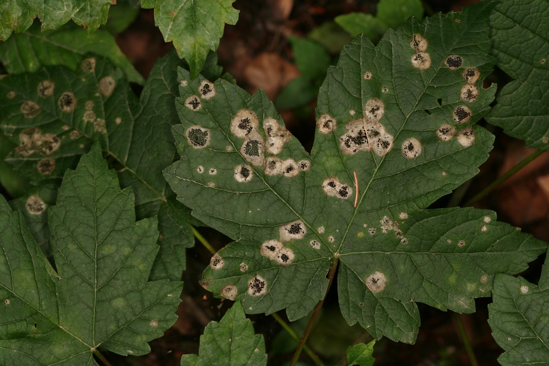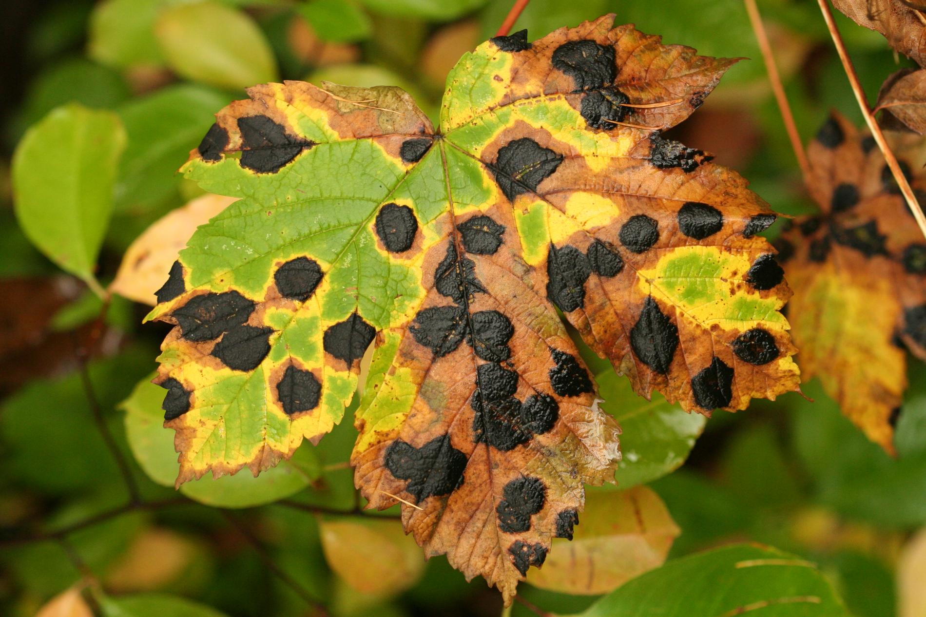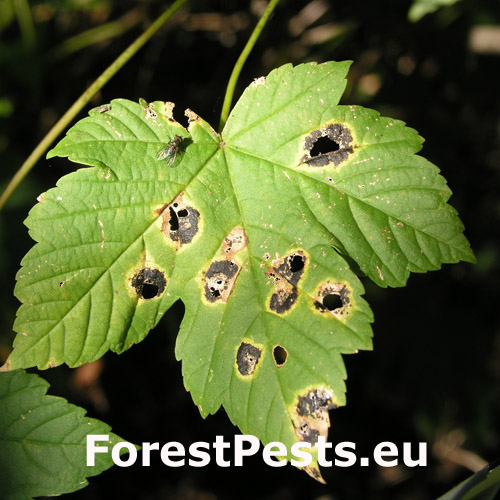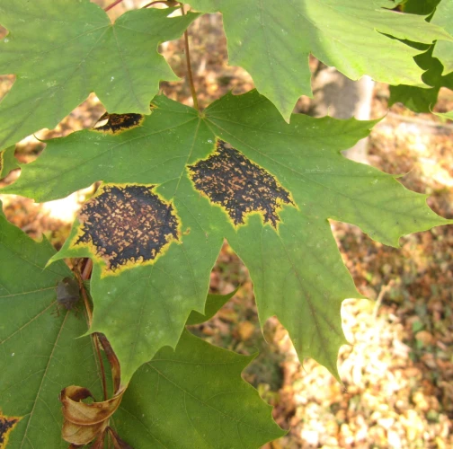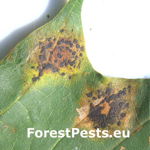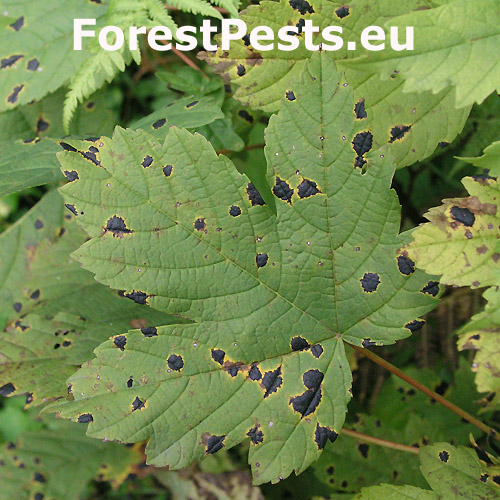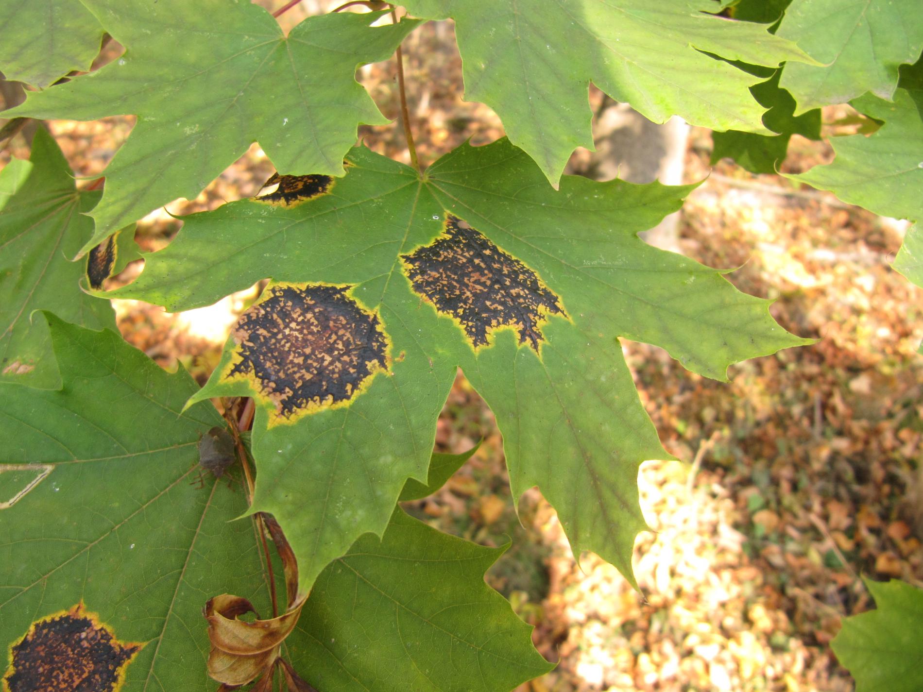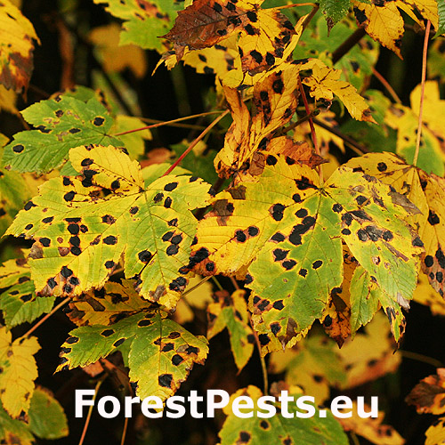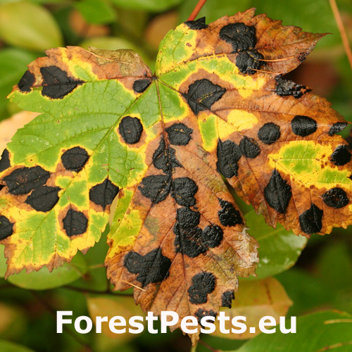 K infekcii listov dochádza v máji cez prieduchy na spodnej strane listov. Koncom mája až v júli sú na listoch žltkasté škvrny, v ktorých sa postupne vytvárajú čierne bodky. Tie sa zväčšujú a spájajú do jednej 0,7 – 2 cm veľkej čiernej škvrny, ktoré môžu časom vypadávať. Rhytisma punctatum (Pers.: Fr.) Fr. sa makroskopicky odlišuje tým, že čierne bodky sa do jednej škvrny nespájajú ani v dospelosti, ako aj mikroskopicky spórami. Ochorenie má praktický význam len v škôlkach, kde na semenáčikoch a sadeniciach znižuje asimilačnú plochu a tým aj prírastok a odolnosť.