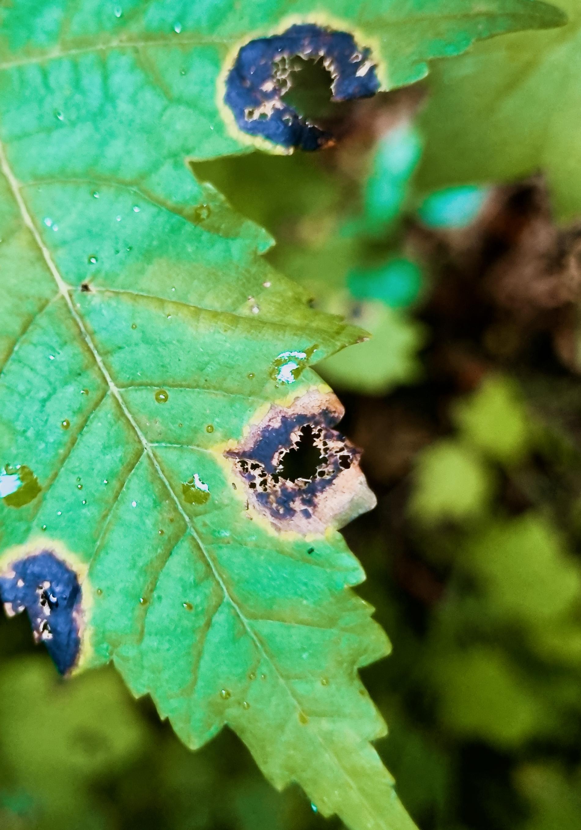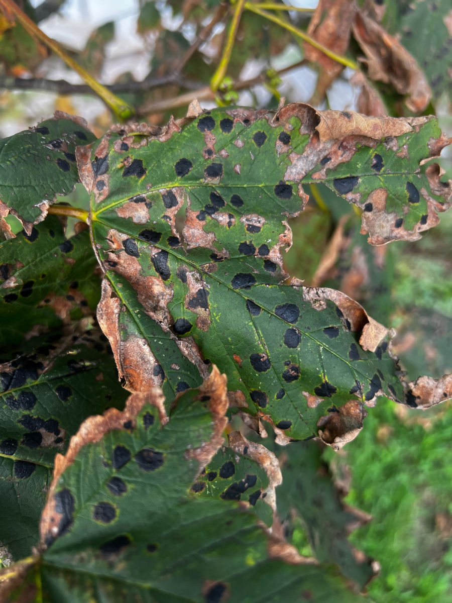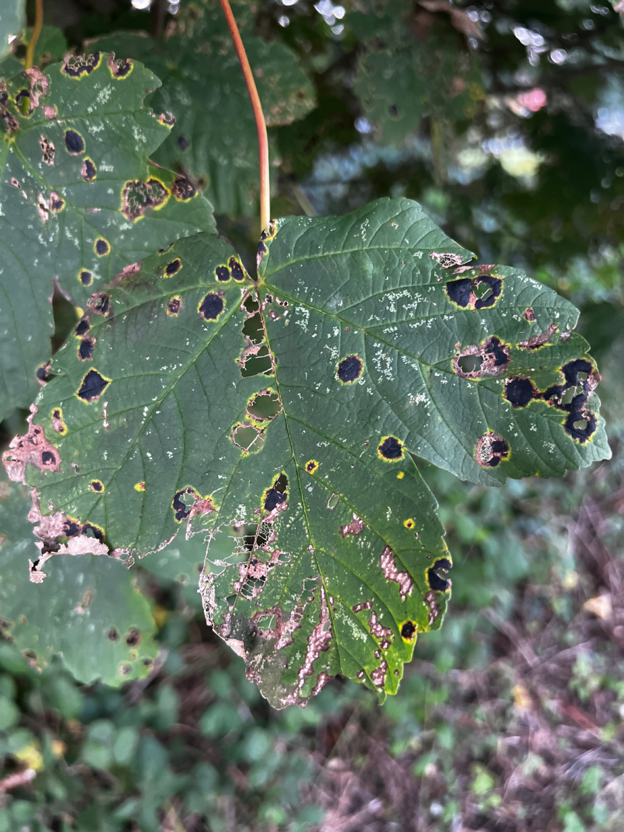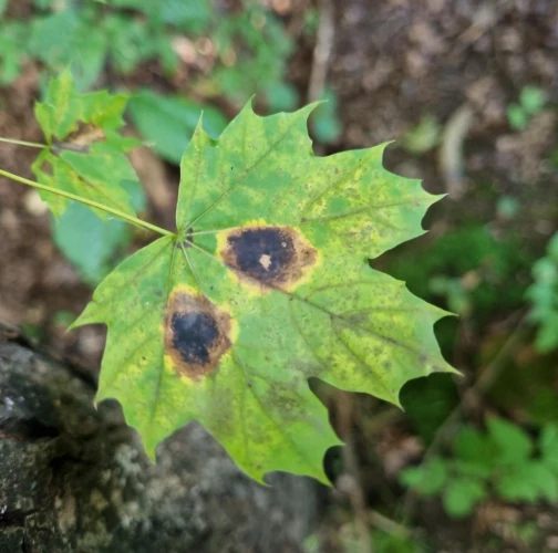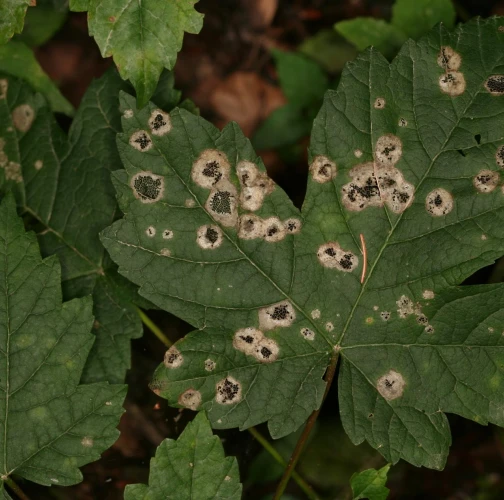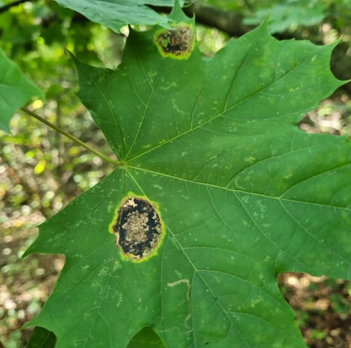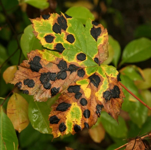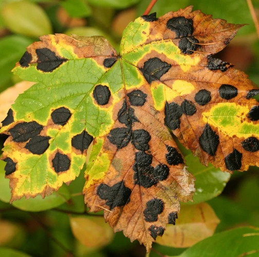 K infekcii listov dochádza v máji cez prieduchy na spodnej strane listov. Koncom mája až v júli sú na listoch žltkasté škvrny, v ktorých sa postupne vytvárajú čierne bodky. Tie sa zväčšujú a spájajú do jednej 0,7 – 2 cm veľkej čiernej škvrny, ktoré môžu časom vypadávať. Rhytisma punctatum (Pers.: Fr.) Fr. sa makroskopicky odlišuje tým, že čierne bodky sa do jednej škvrny nespájajú ani v dospelosti, ako aj mikroskopicky spórami. Ochorenie má praktický význam len v škôlkach, kde na semenáčikoch a sadeniciach znižuje asimilačnú plochu a tým aj prírastok a odolnosť.