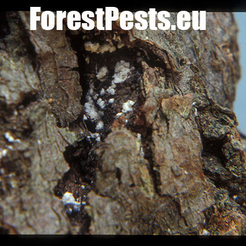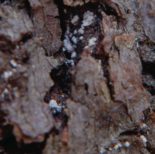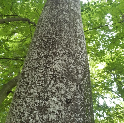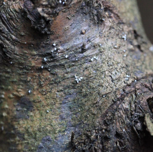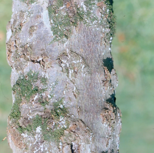 Biele povlaky na kmeňoch, často veľmi nevýrazné, len ako malé biele bodky.