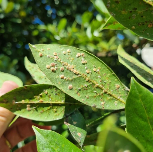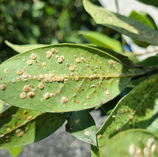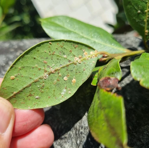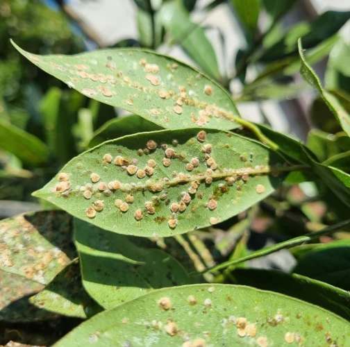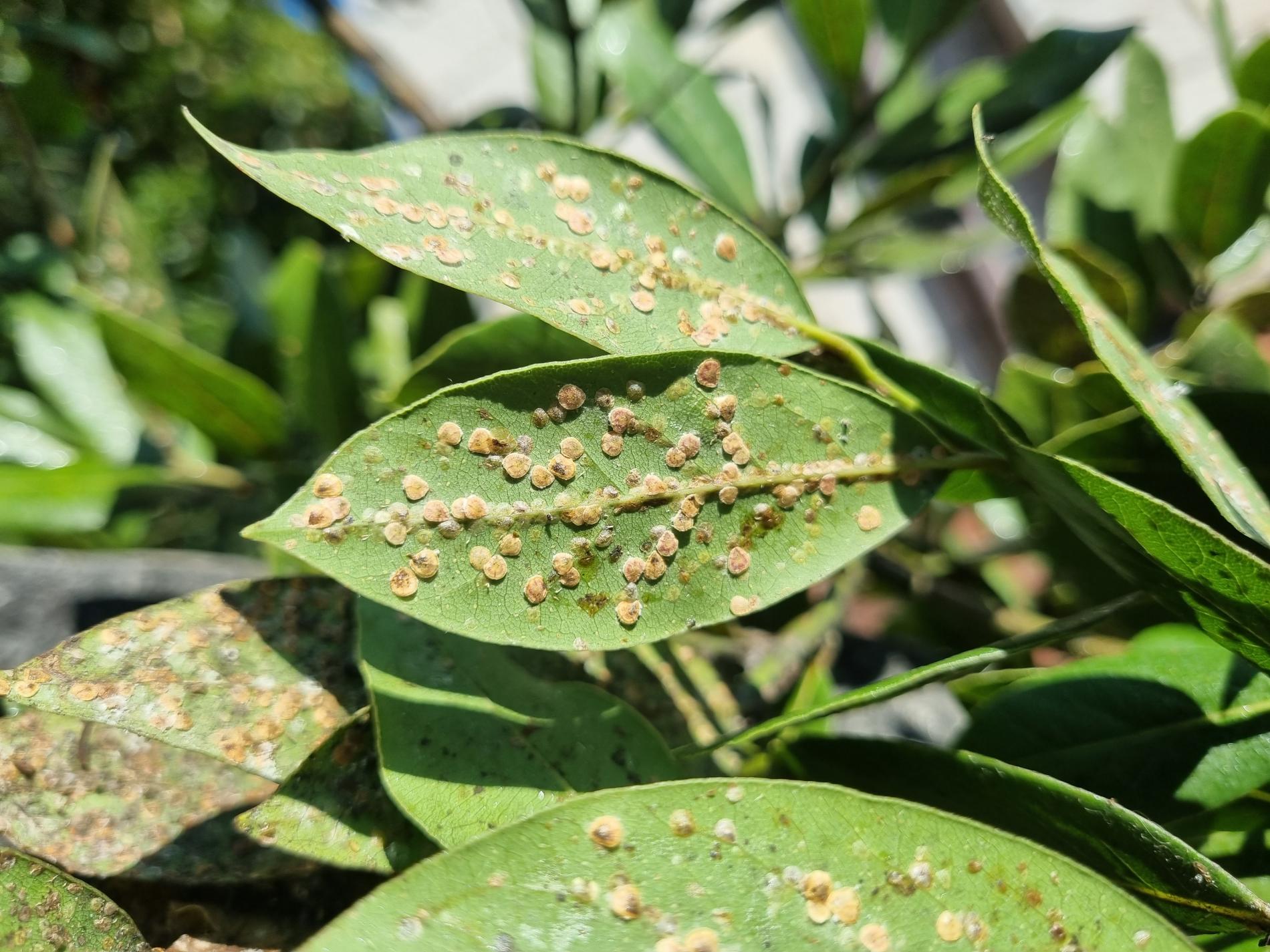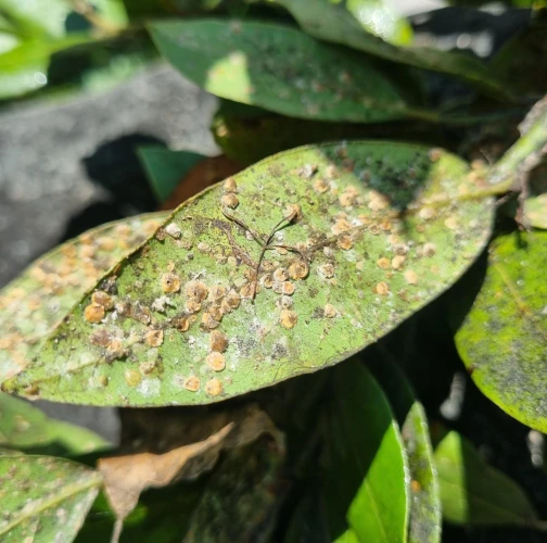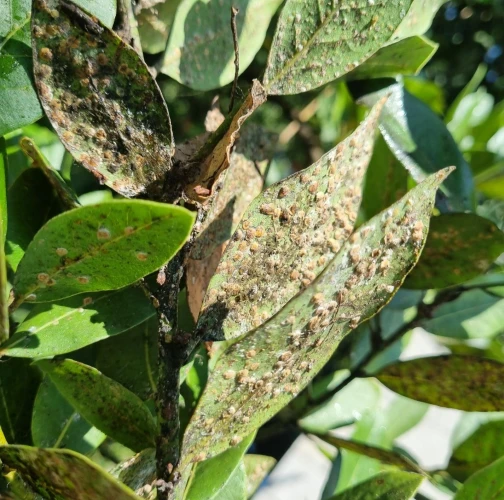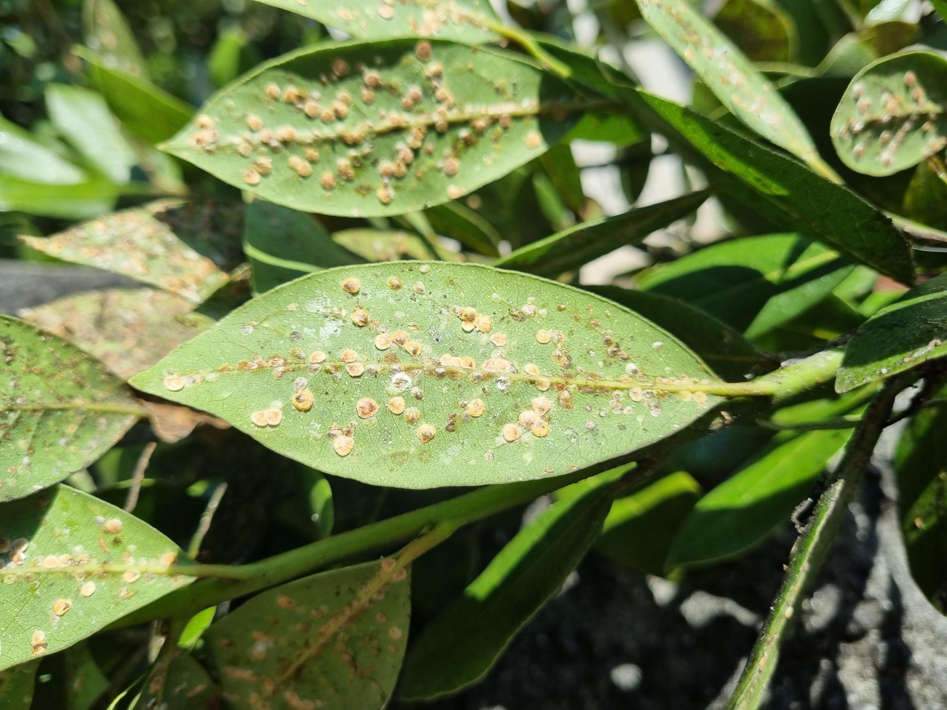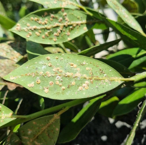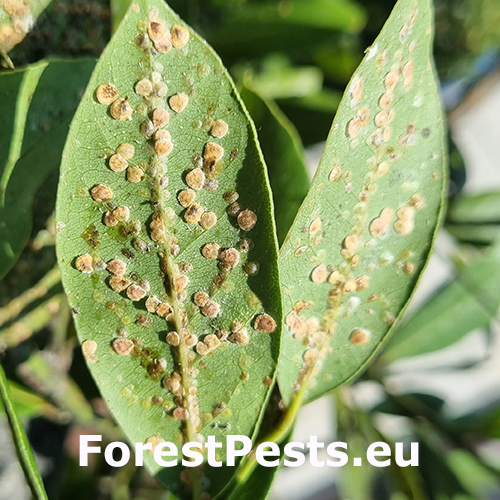 Lepivé listy s povlakom černe, početné oválne šupiny na listoch a výhonkoch.
