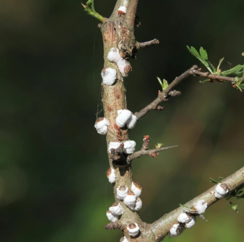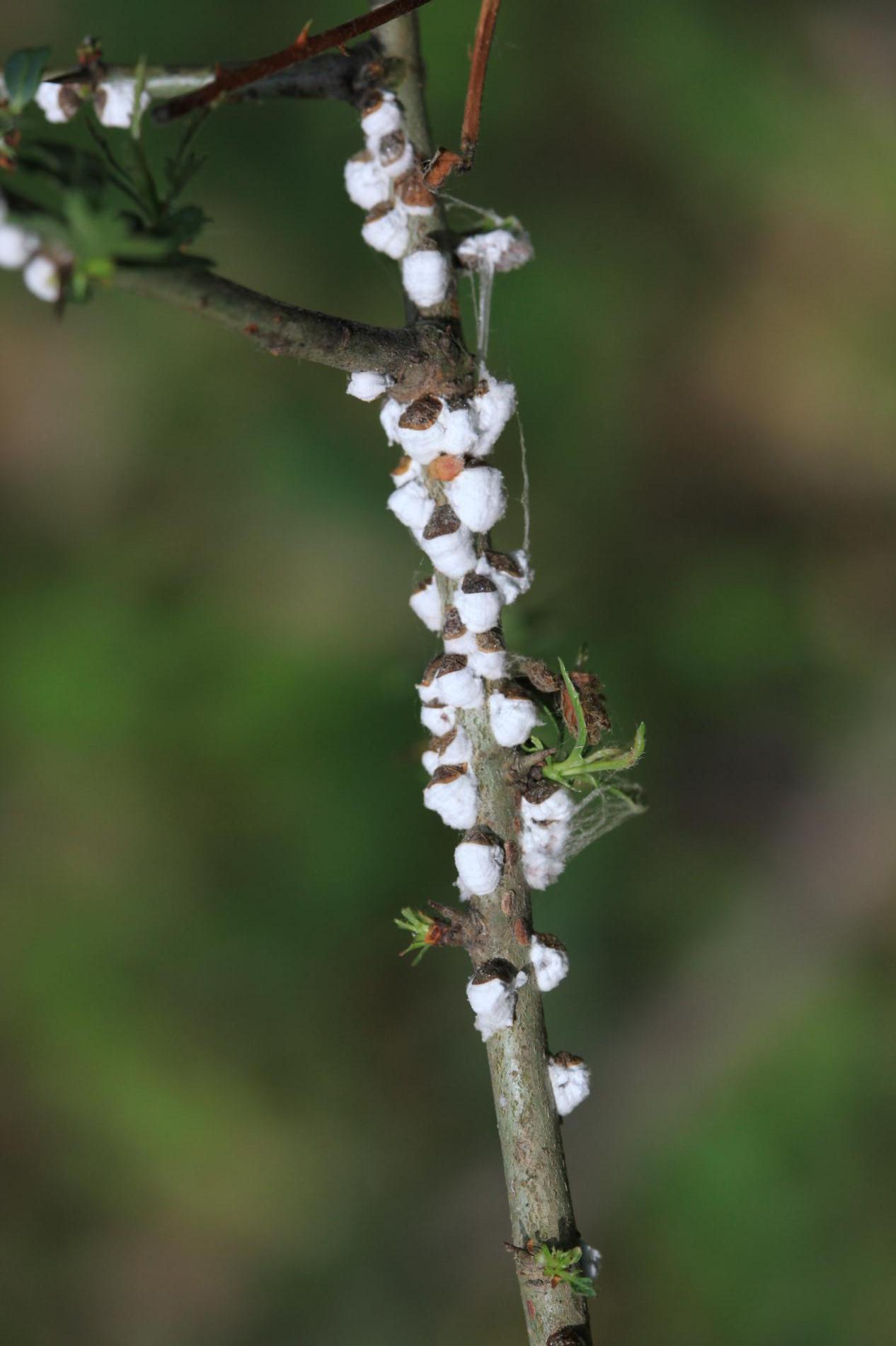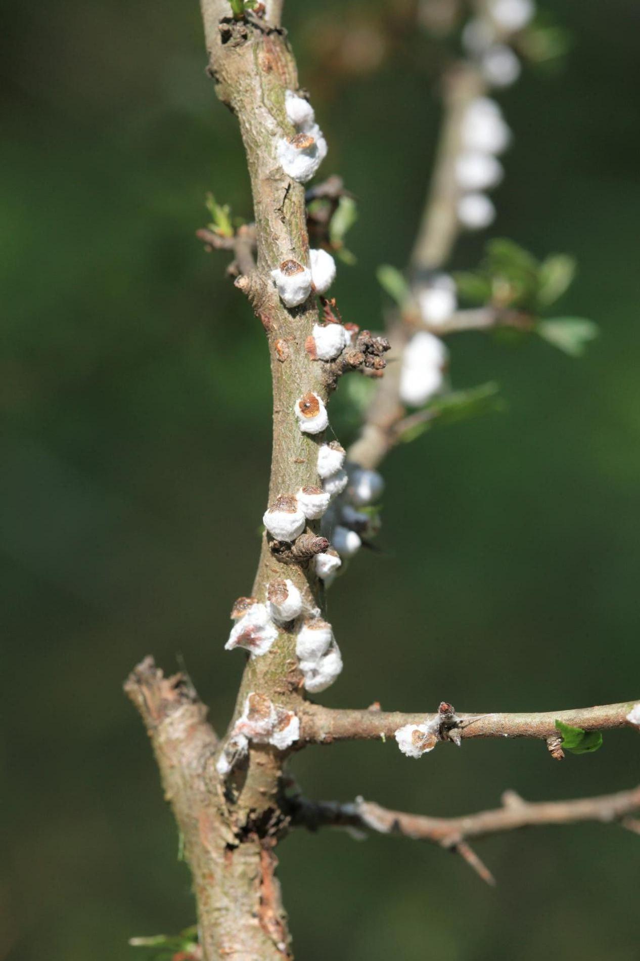 Na jar je možné vidieť na kmeňoch a vetvách hostiteľských drevín asi 0,5-0,8 mm veľké štítky obrúbené vatovitou hmotou. Štítky chránia imobilné samičky, ktoré pod ne kladú až 2000 vajíčok. Z nich sa liahnu pomerne pohyblivé larvy, ktoré putujú do korún stromov, kde v lete cicajú na spodnej strane listov. Sú veľmi ľahké a môžu byť unášané vetrom aj na väčšie vzdialenosti. Na jeseň sa larvy vracajú späť na kmeň a vetvy kde dospievajú a menia sa na nepohyblivé samičky. V západnej Európe žije príbuzný druh P. vitis. Z juhu sa k nám šíri P. hydrangeaeP. floccifera. Na Slovensku sa môžu objaviť aj ďalšie nebezpečné príbuzné druhy ako napríklad príbuzné Pseudaulacaspis (= Diaspis) pentagona a Chionaspis salicis.