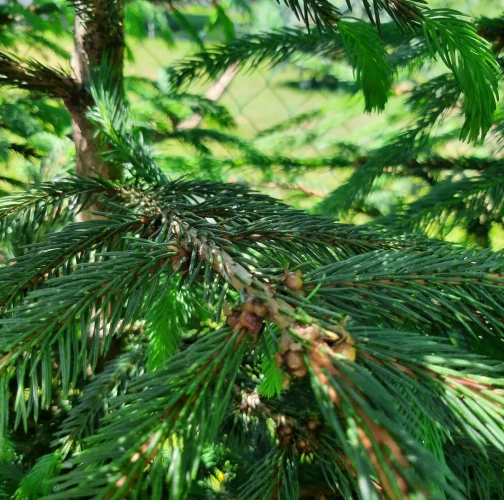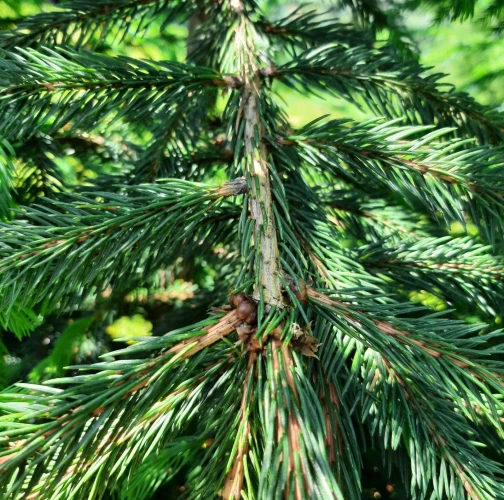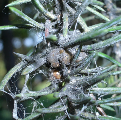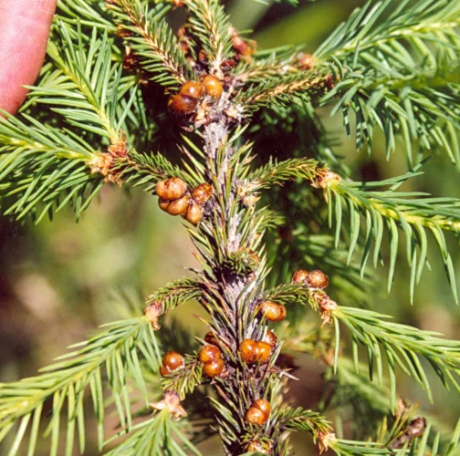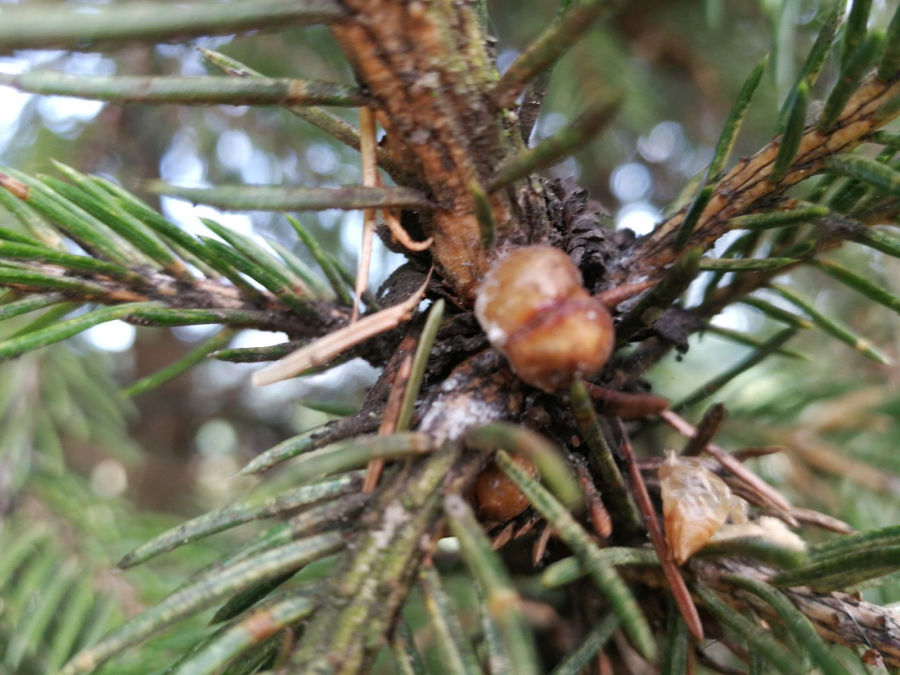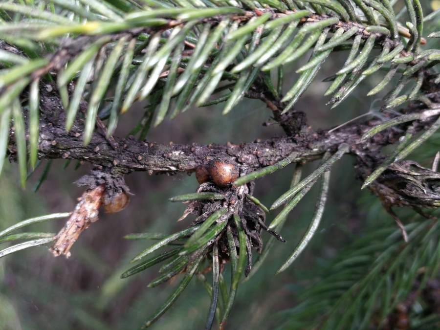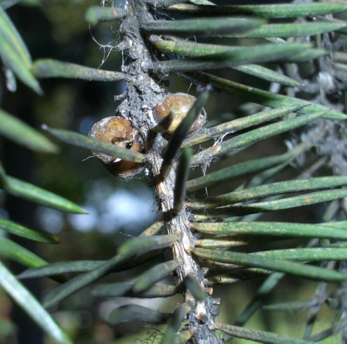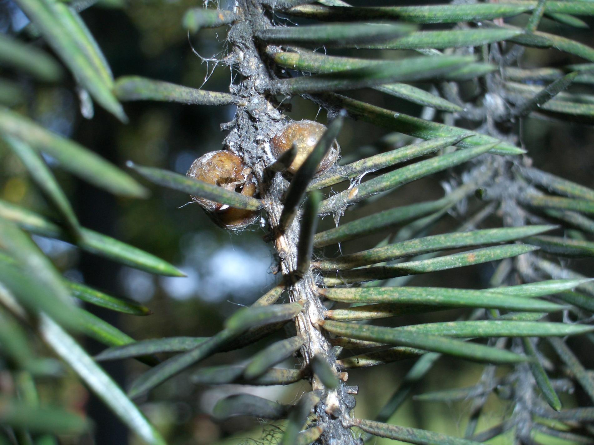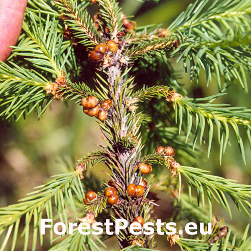 Na vetvičkách smrekov sú viditeľné \\\"hnedé nádory\\\", ktoré sú v skutočnosti dospelé samičky tohto druhu.