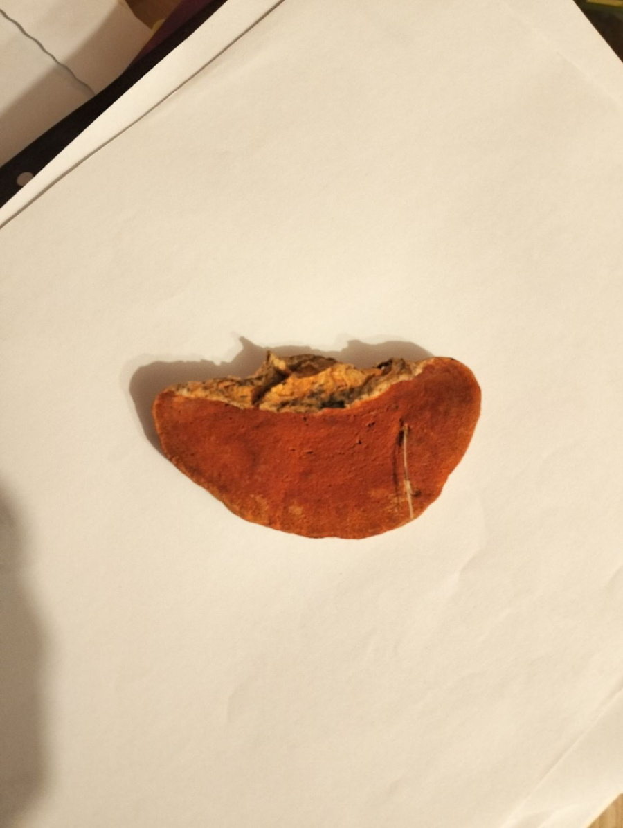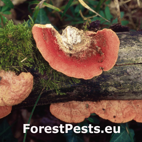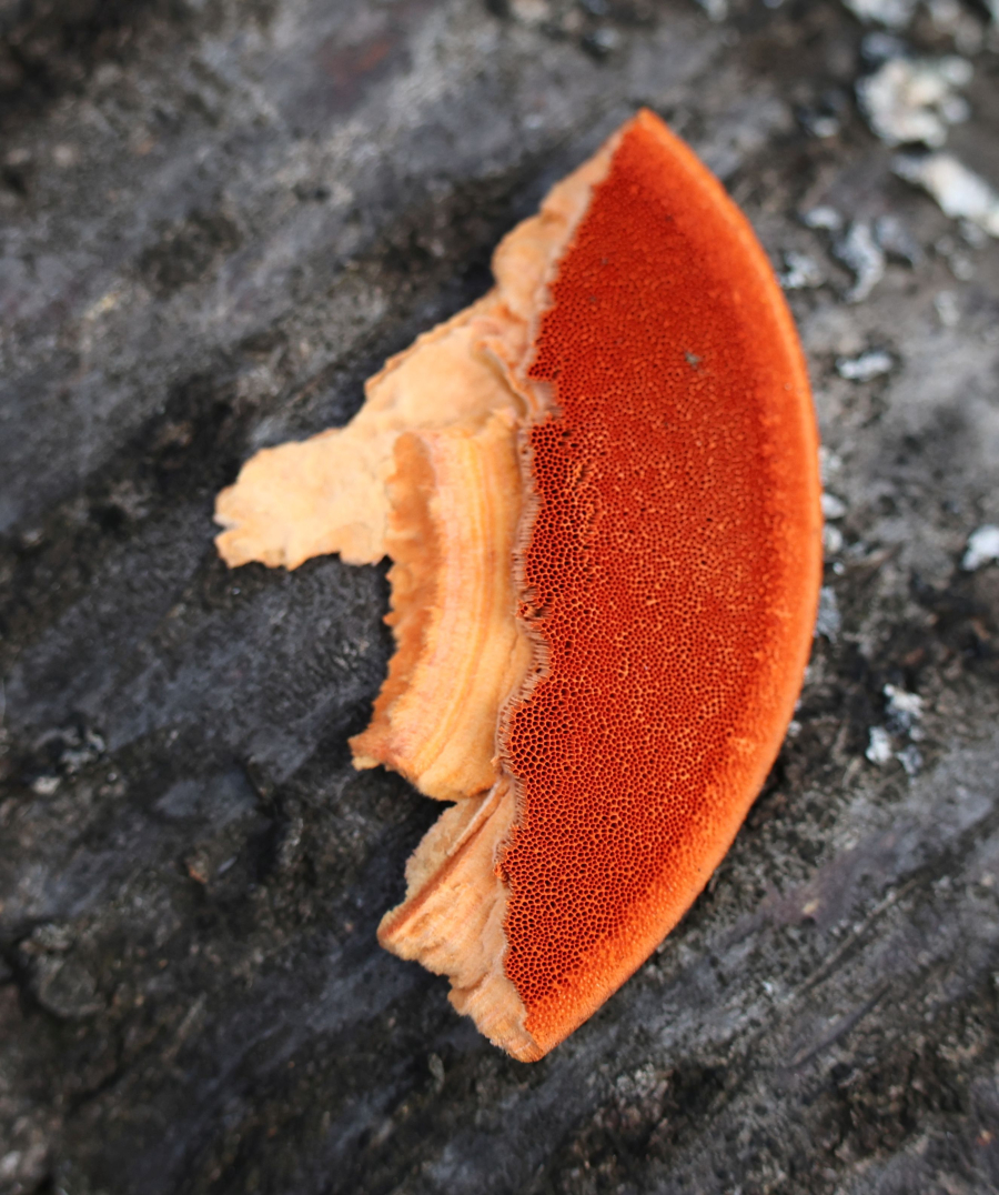 Plodnice sú ročné, bokom prirastené, za čerstva kožovité, lososovookrové až marhuľovooranžové, s vekom blednúce, niekedy černejúce. Póry oranžovočervené, udržia červenú farbu dlhšie ako povrch klobúka. Mycélium spôsobuje bielu hnilobu napadnutého odumretého dreva.