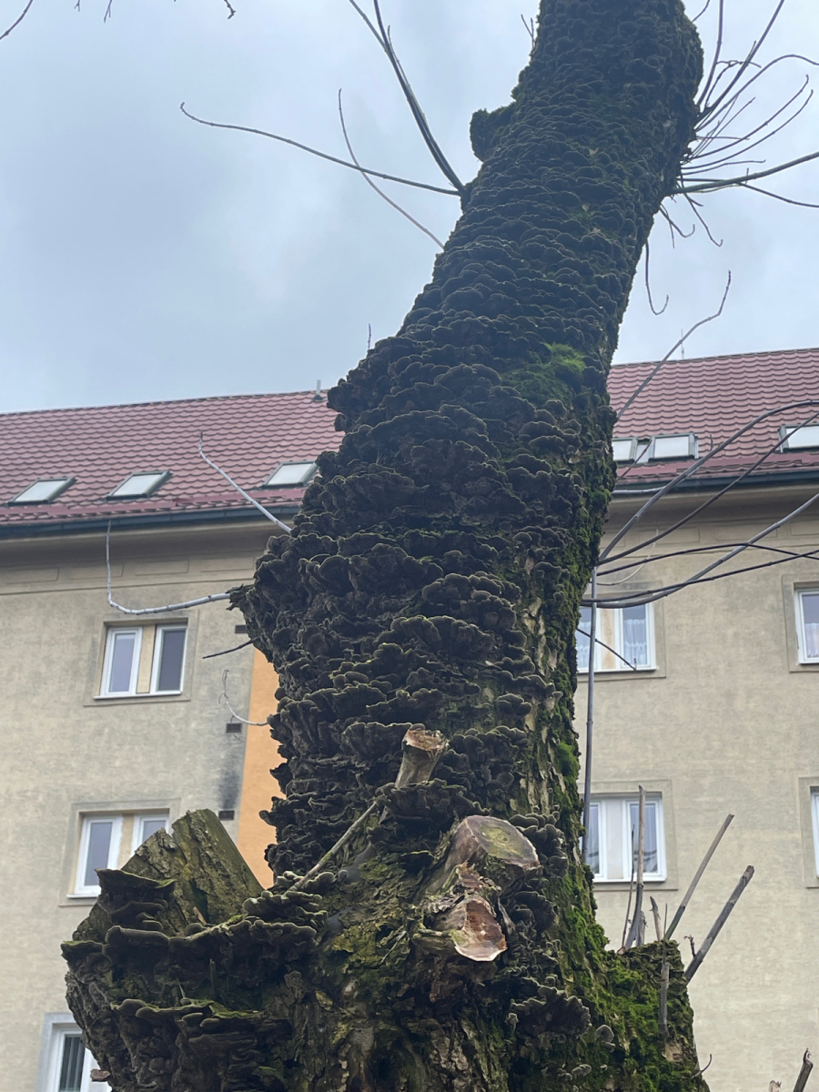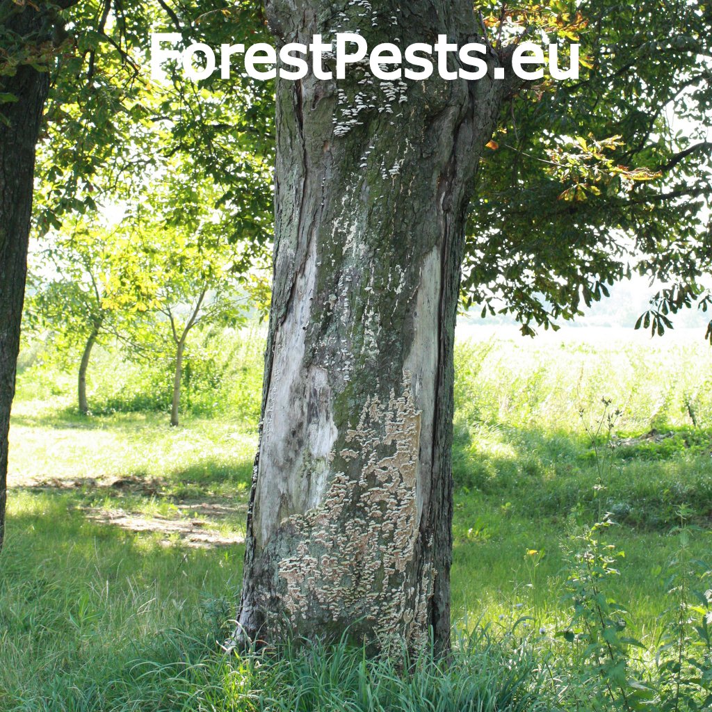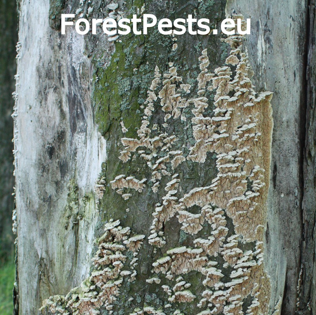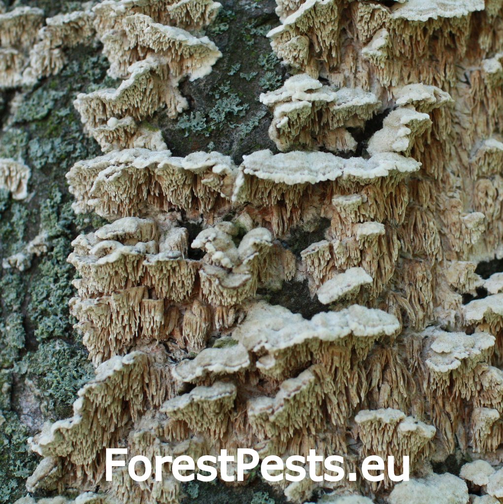Plodnice sú trvalé, polorozliate s klobúkmi polkruhovitými, vejárovitými, vlnito poprehýbané, niekedy na okraji aj laločnaté, väčšinou vo väčšom počte nad sebou, na povrchu chlpaté, brázdito kruhovité, jednofarebne sivo okrové. Staršie plodnice sú lysé, hnedasté až čiernohnedasté. Rastú na odumretých pňoch, kmeňoch a vetvách, ale i na živých kmeňoch. Vyskytuje sa na vlhkejších lokalitách, zvlášť pozdĺž vodných tokov. Nákaza preniká do kmeňa rôznymi ranami, najmä mrazovými trhlinami. Napadnuté stromy dosť rýchlo odumierajú a celé časti stromov, hlavne kmeň, bývajú pokryté stovkami plodníc. Mycélium spôsobuje veľmi intenzívnu a rýchlo sa šíriacu vláknitú hnilobu dreva bielej až žltkastej farby. Z hospodárskeho hľadiska je to veľmi nebezpečný druh.