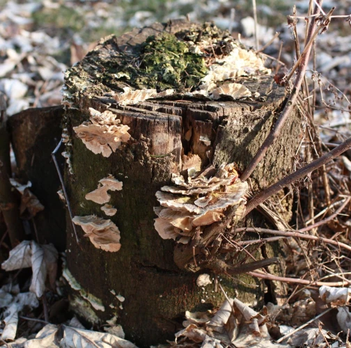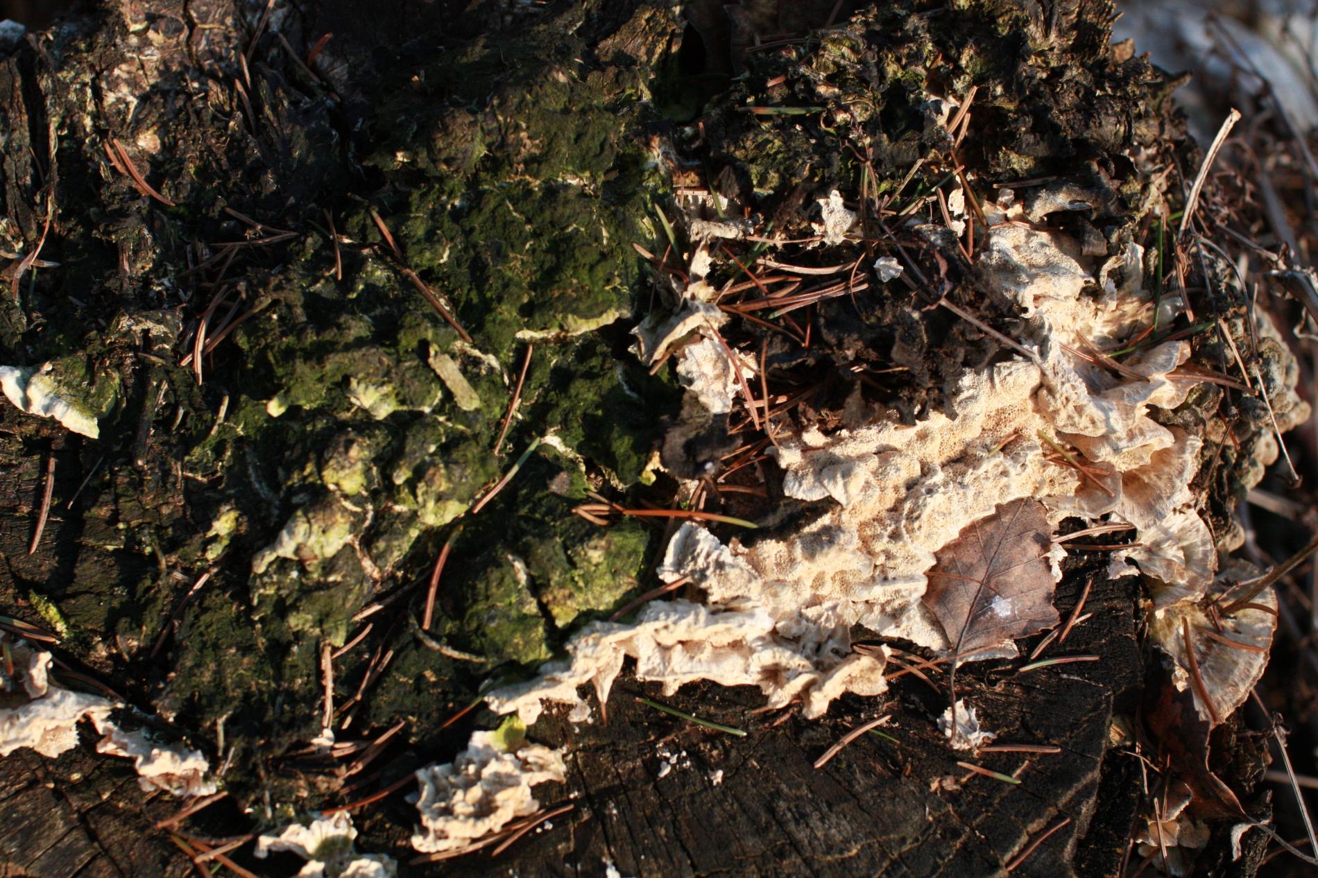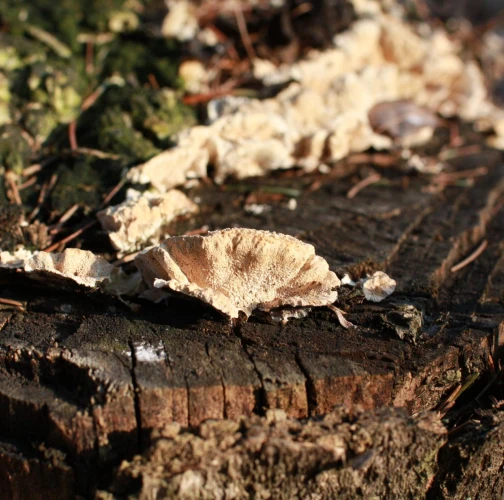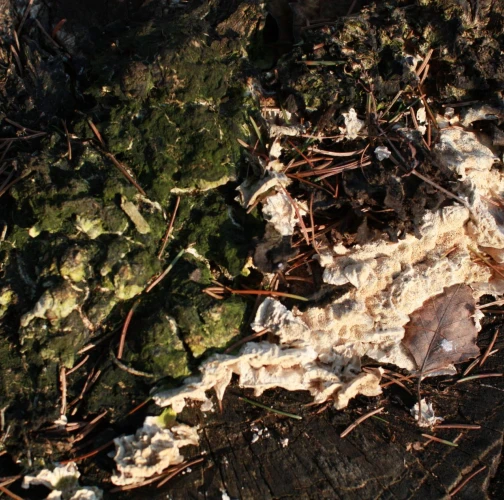 Prítomnosť sivých až sivookrových plodníc, väčšinou vo väčšom počte husto nad sebou.