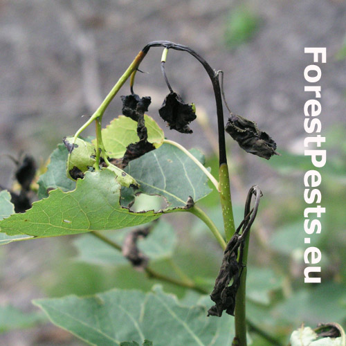Prvými príznakmi infekcie sú čierne bodky na listoch. V priebehu jari a leta sa bodky zväčšujú až spájajú, pokrývajú celý list a vädnú. Podobne prebieha aj infekcia výhonkov, ktoré taktiež vädnú a ohýbajú sa. K infekcii dochádza na jar, zdrojom infekcie sú infikované listy z predchádzajúceho vegetačného obdobia, ktoré sú opadnuté a prezimujúce na zemi pod stromami. Počas veľmi vlhkej jari sa môže na infikovaných častiach listov a výhonkov objaviť olivovo zelený exsudát, ktorý obsahuje spóry huby. Tvorbu a rozširovanie spór podporuje chladná a vlhká jar, šírenie ochorenia sa spomaľuje v teplých a suchých letných mesiacoch.