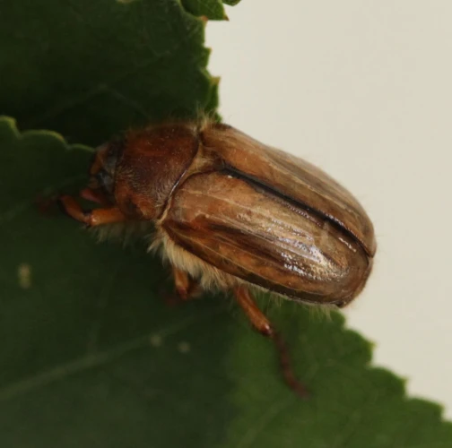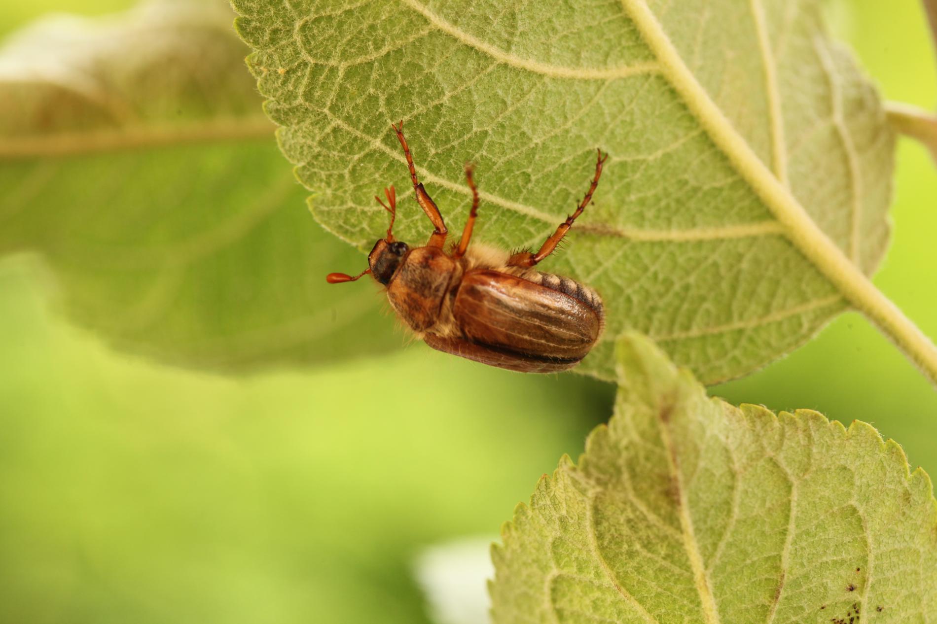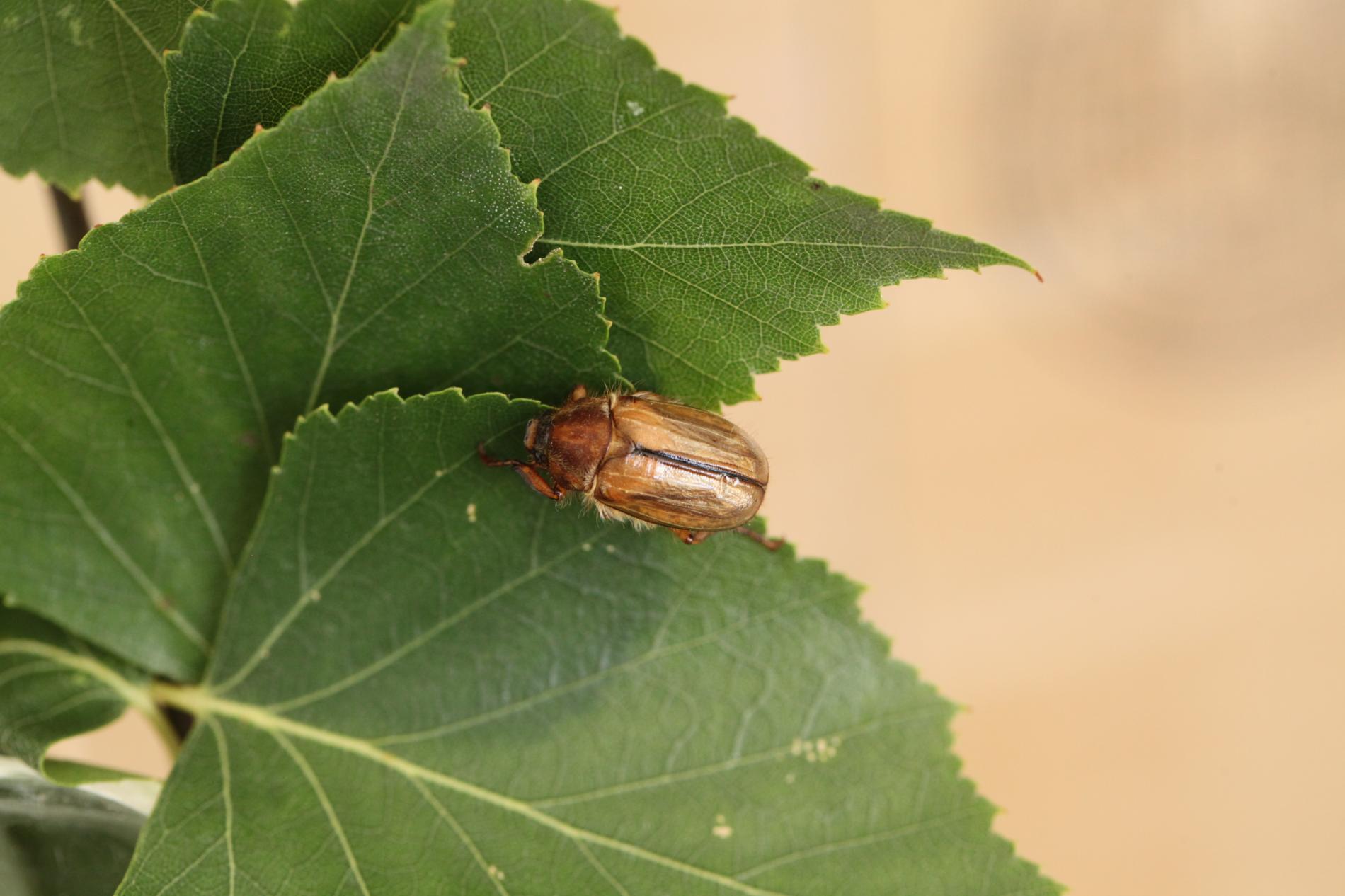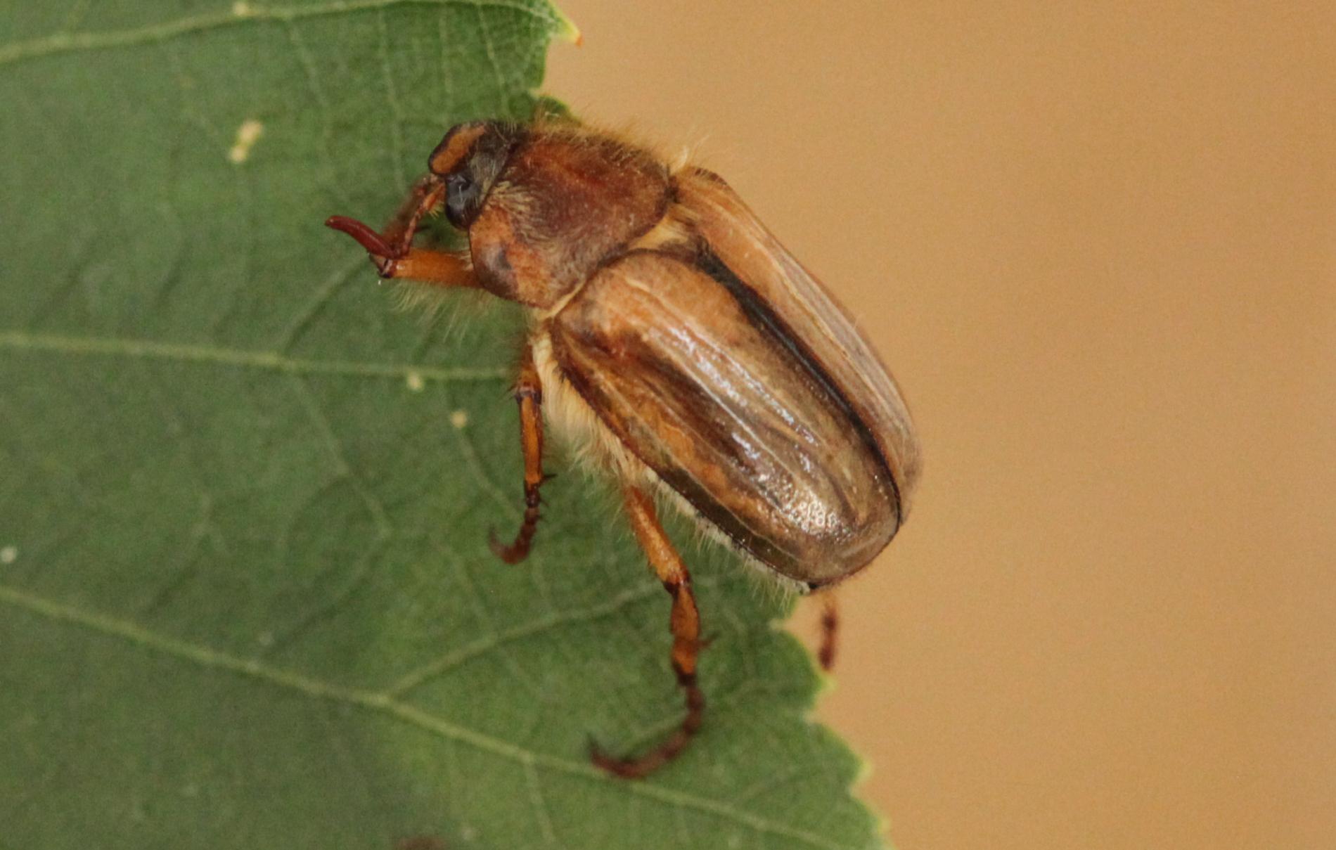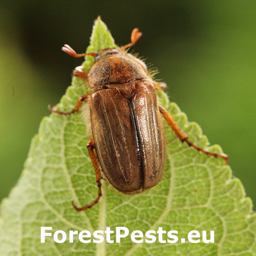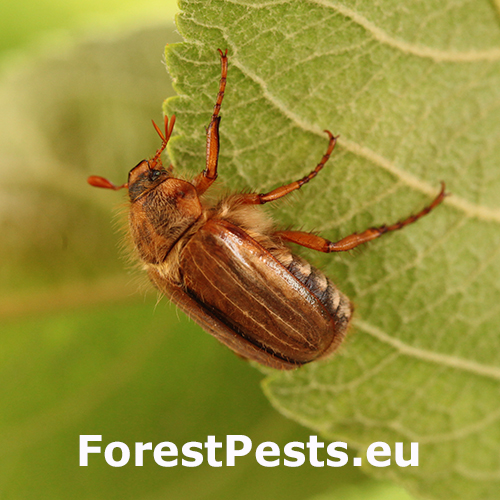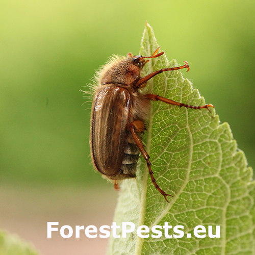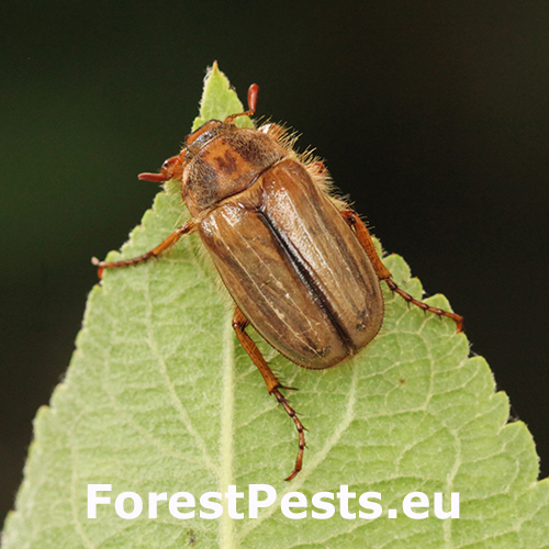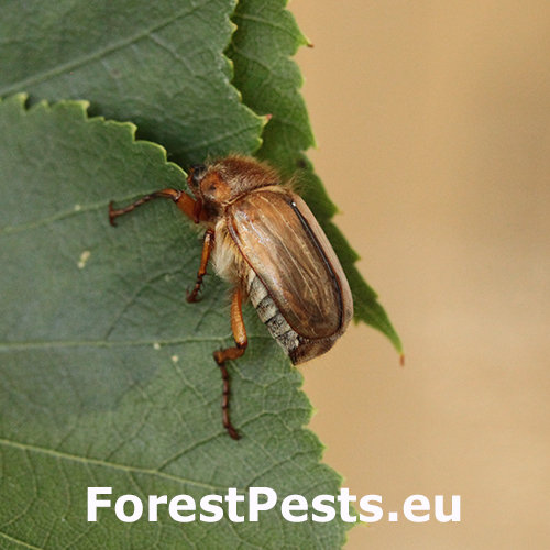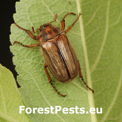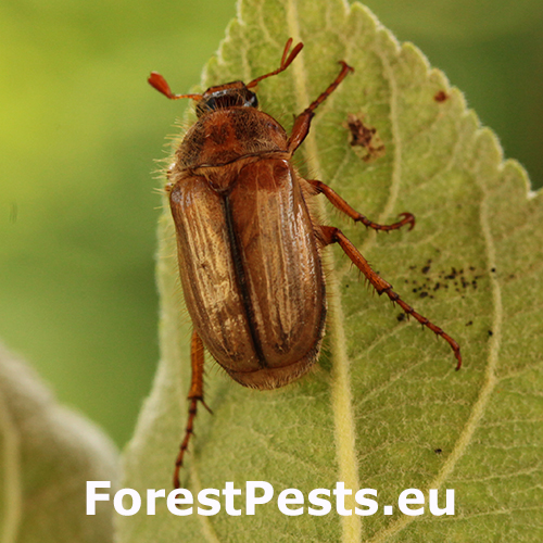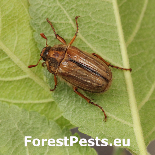 Okrovohnedý malý chrúst sediaci na listoch drevín. Aktívny za súmraku v lete. Biele larvy na koreňoch rastlín. Poškodenie listov a koreňov.