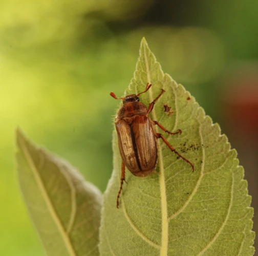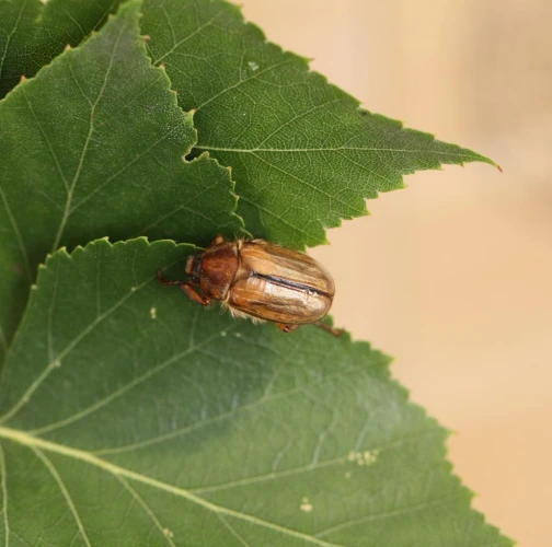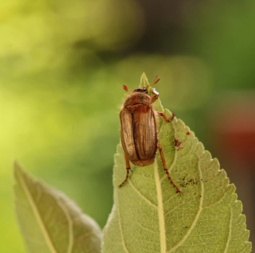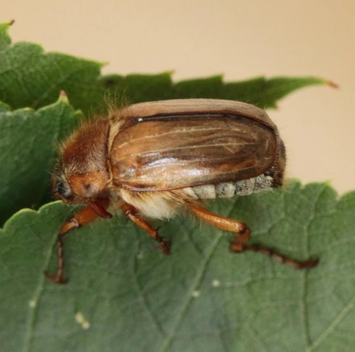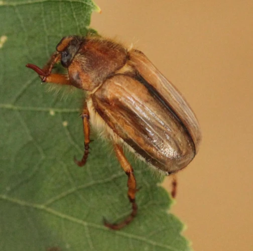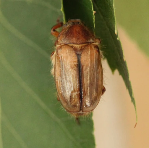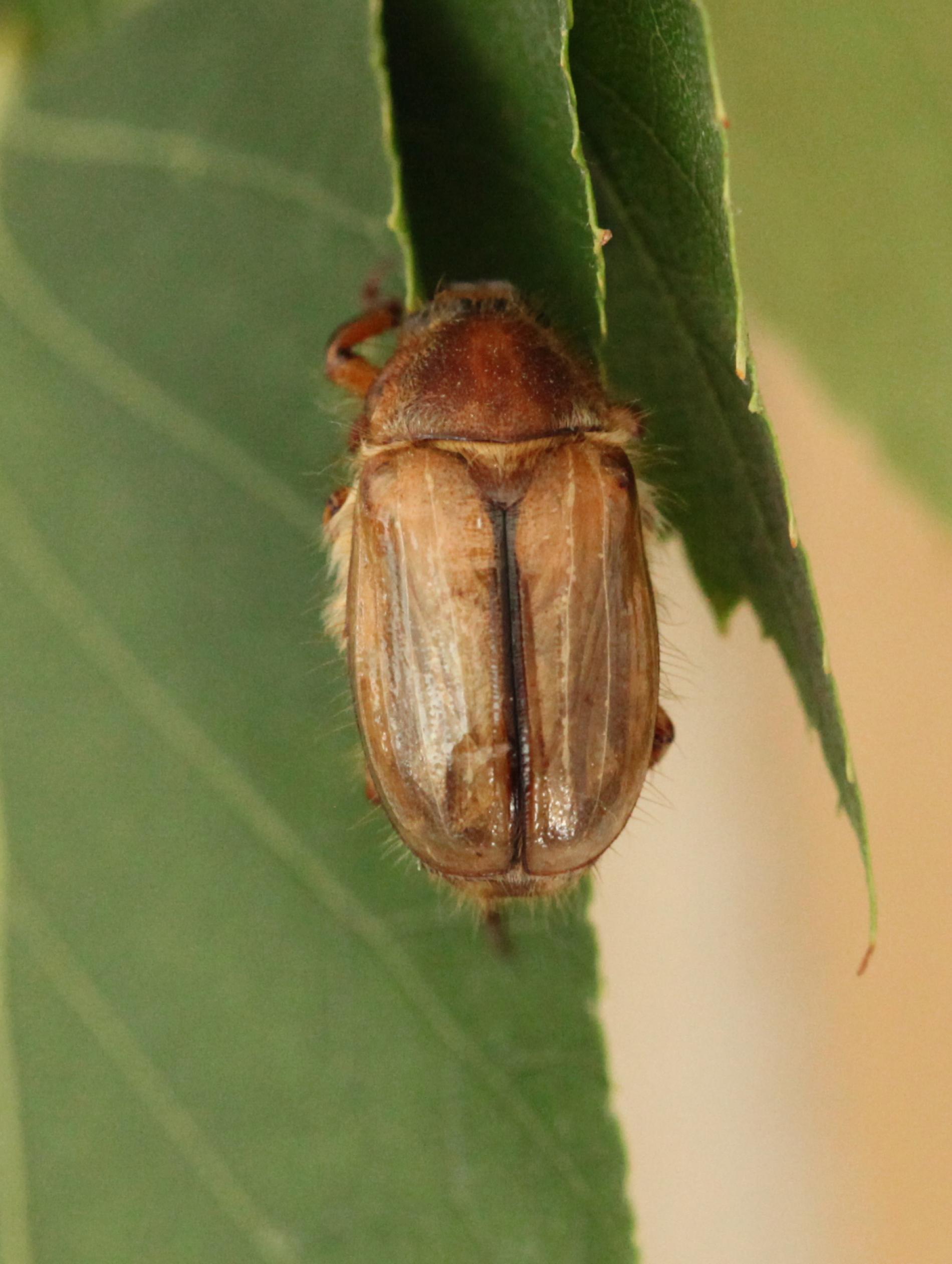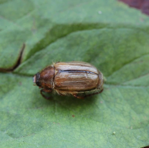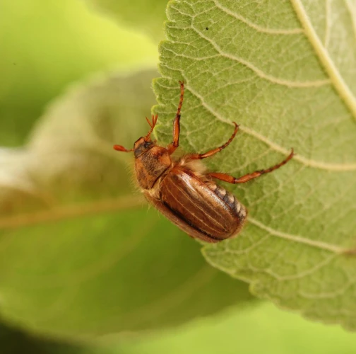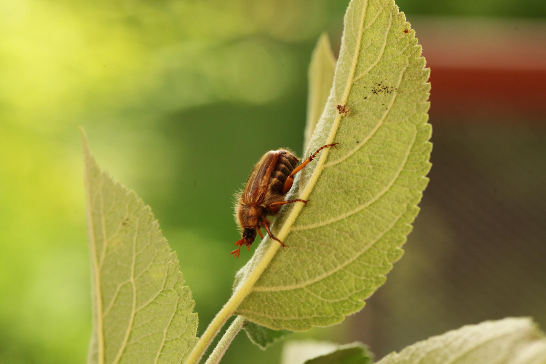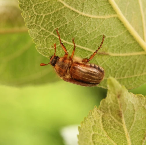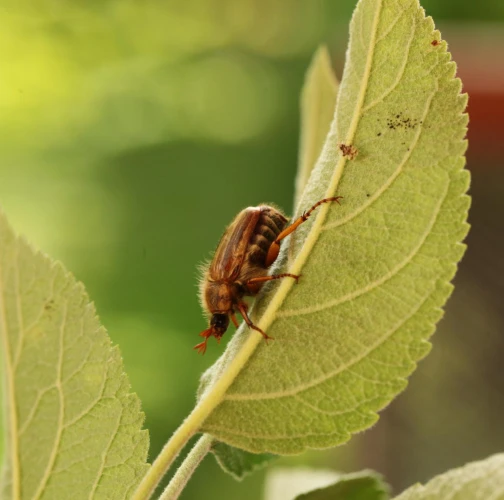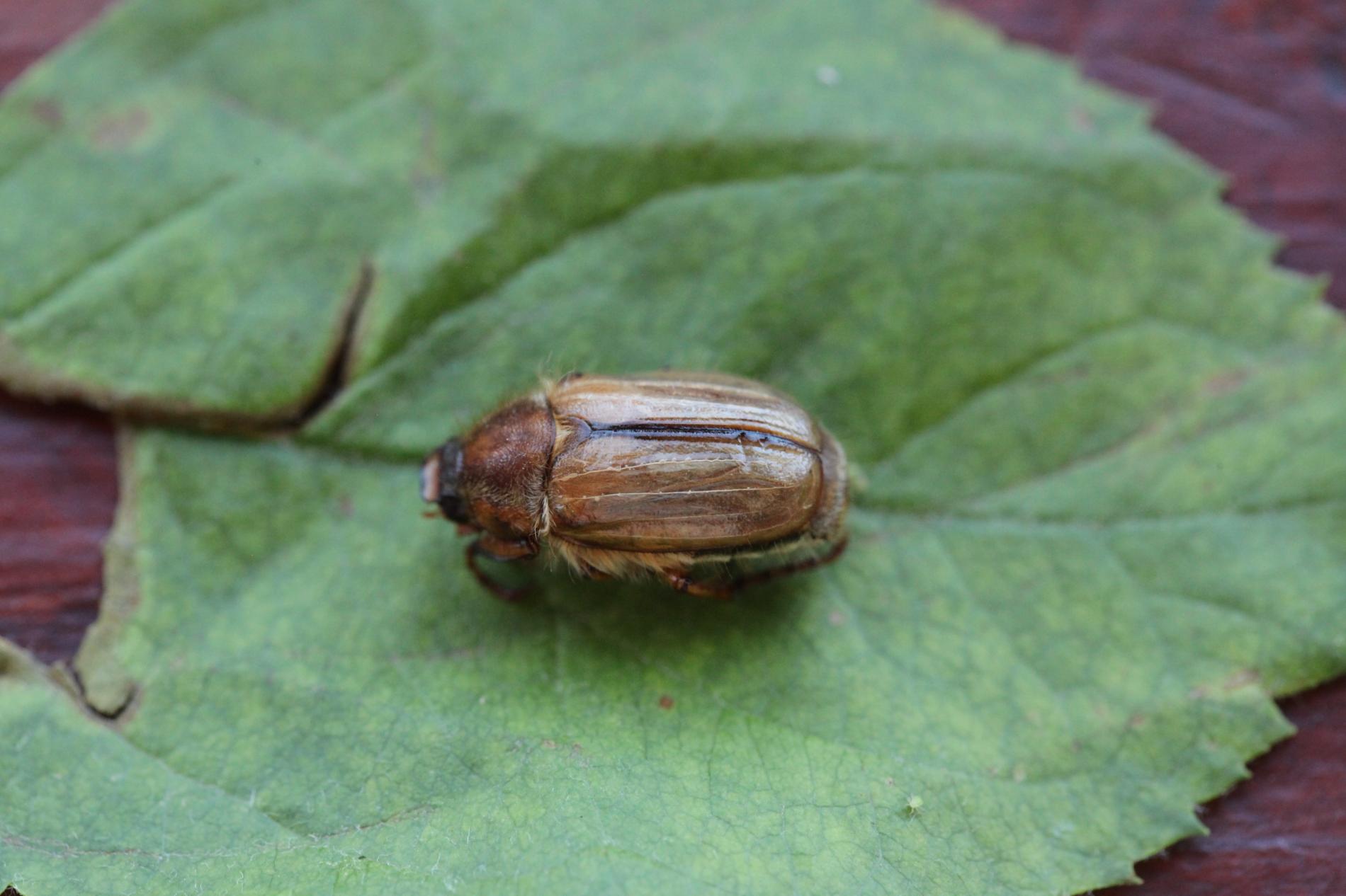 Okrovohnedý malý chrúst sediaci na listoch drevín. Aktívny za súmraku v lete. Biele larvy na koreňoch rastlín. Poškodenie listov a koreňov.