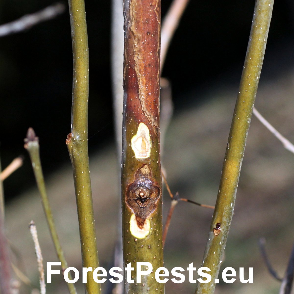 Huba prerastá svojim mycéliom do dreva hostiteľa, postupuje odumieraním kambia a drevnej časti, neskôr  s viditeľnými nekrózami, ktoré sa šíria transpiračným aj asimilačným smerom. Infekciu šíria vetrom prenášané askospóry, ktoré sa vytvárajú počas pomerne dlhého obdobia od júna až do októbra. Patogén teda pravdepodobne nie je zameraný na konkrétnu vegetačnú fázu hostiteľa.