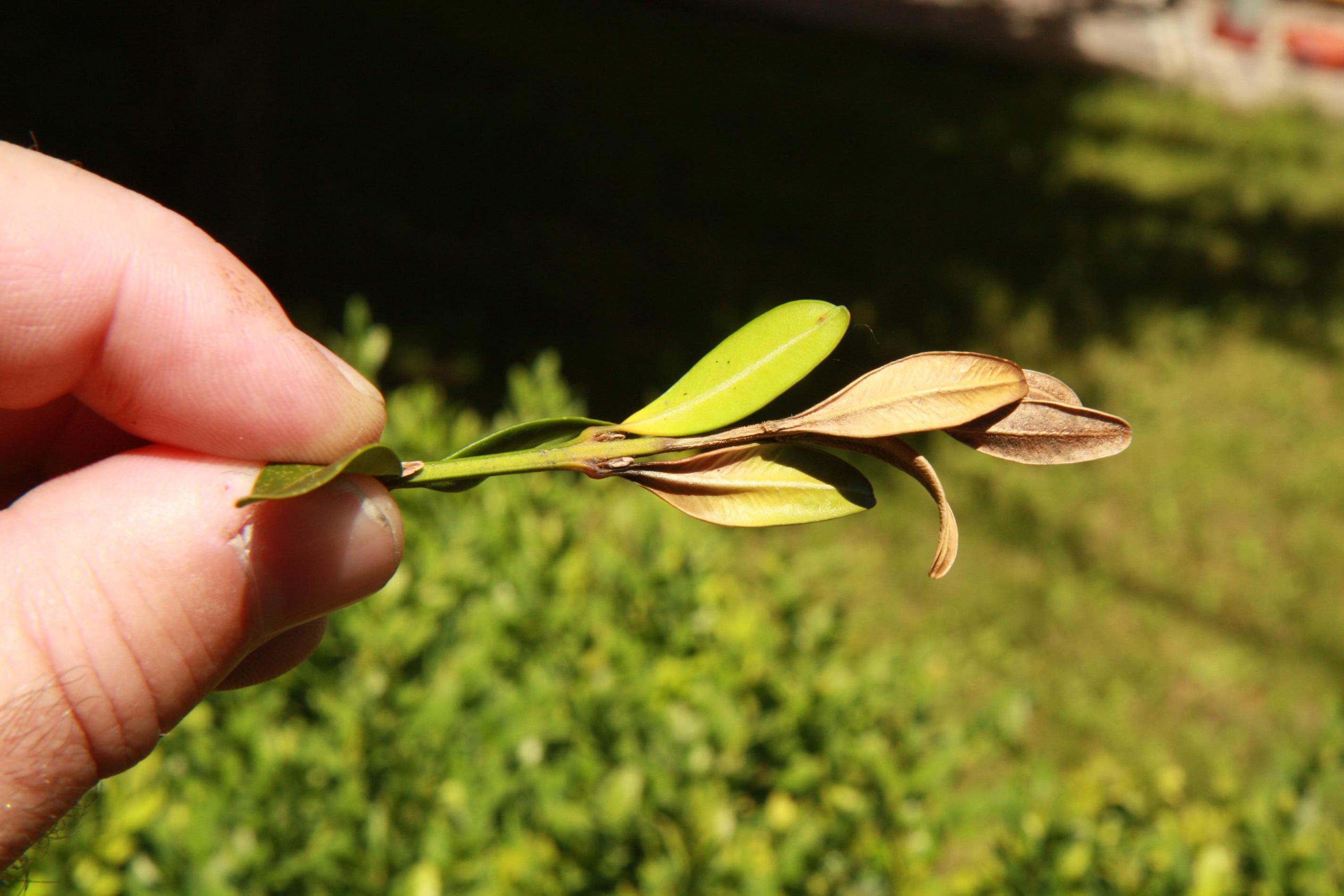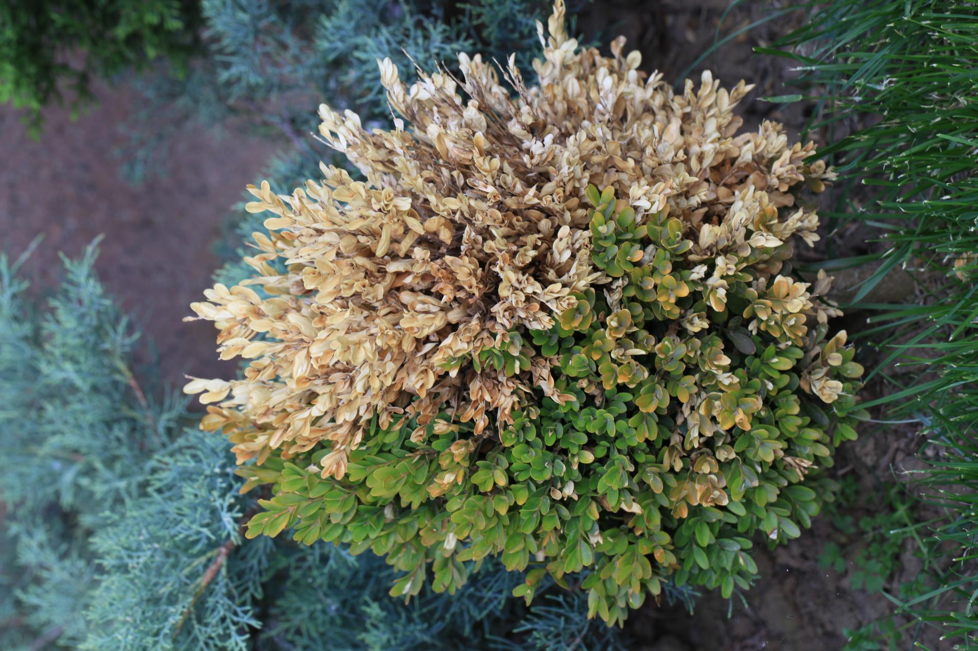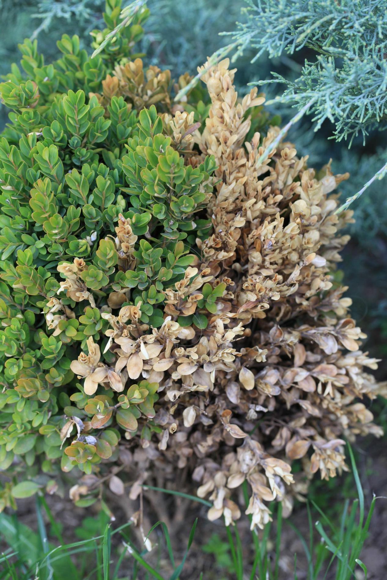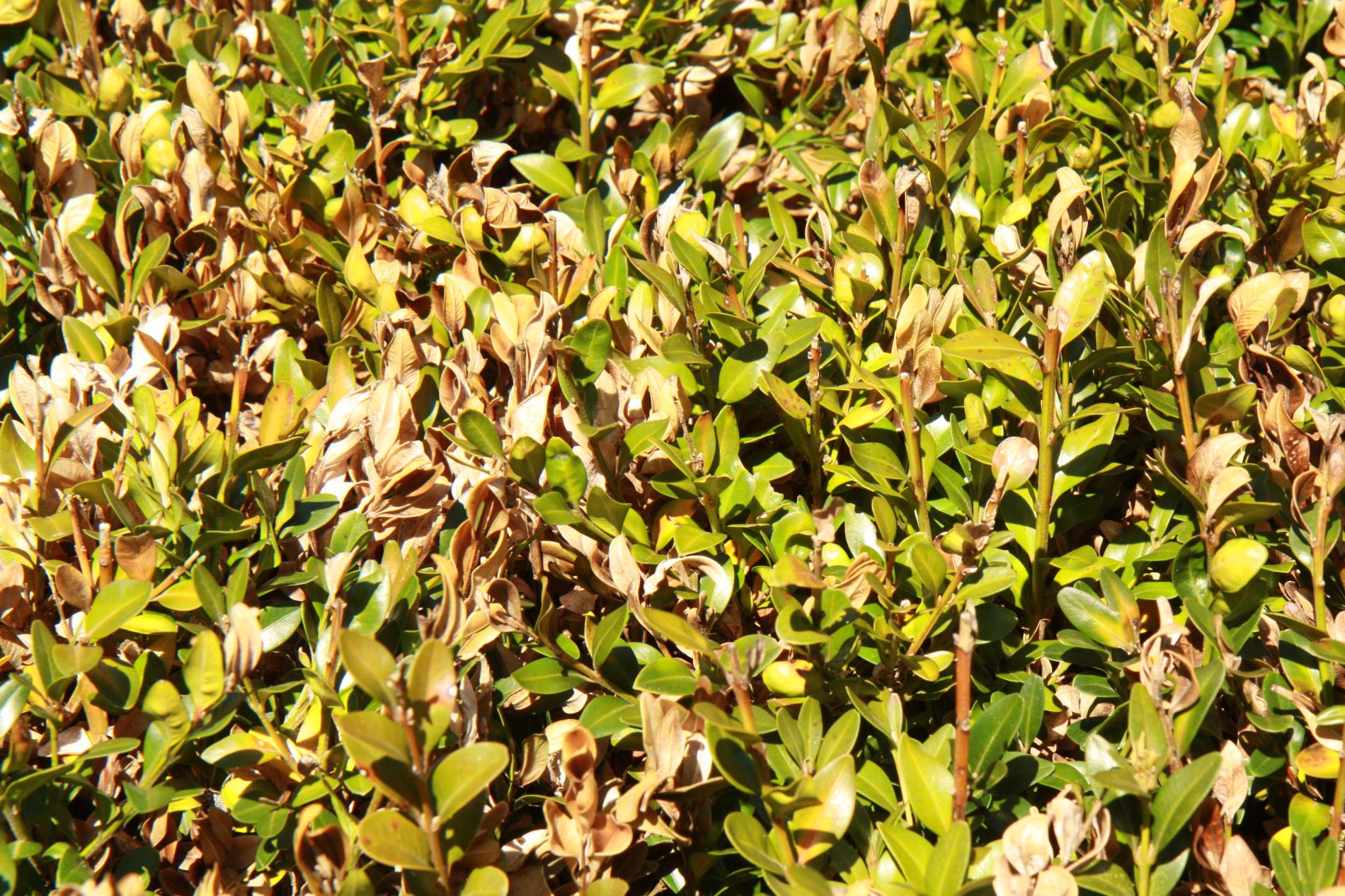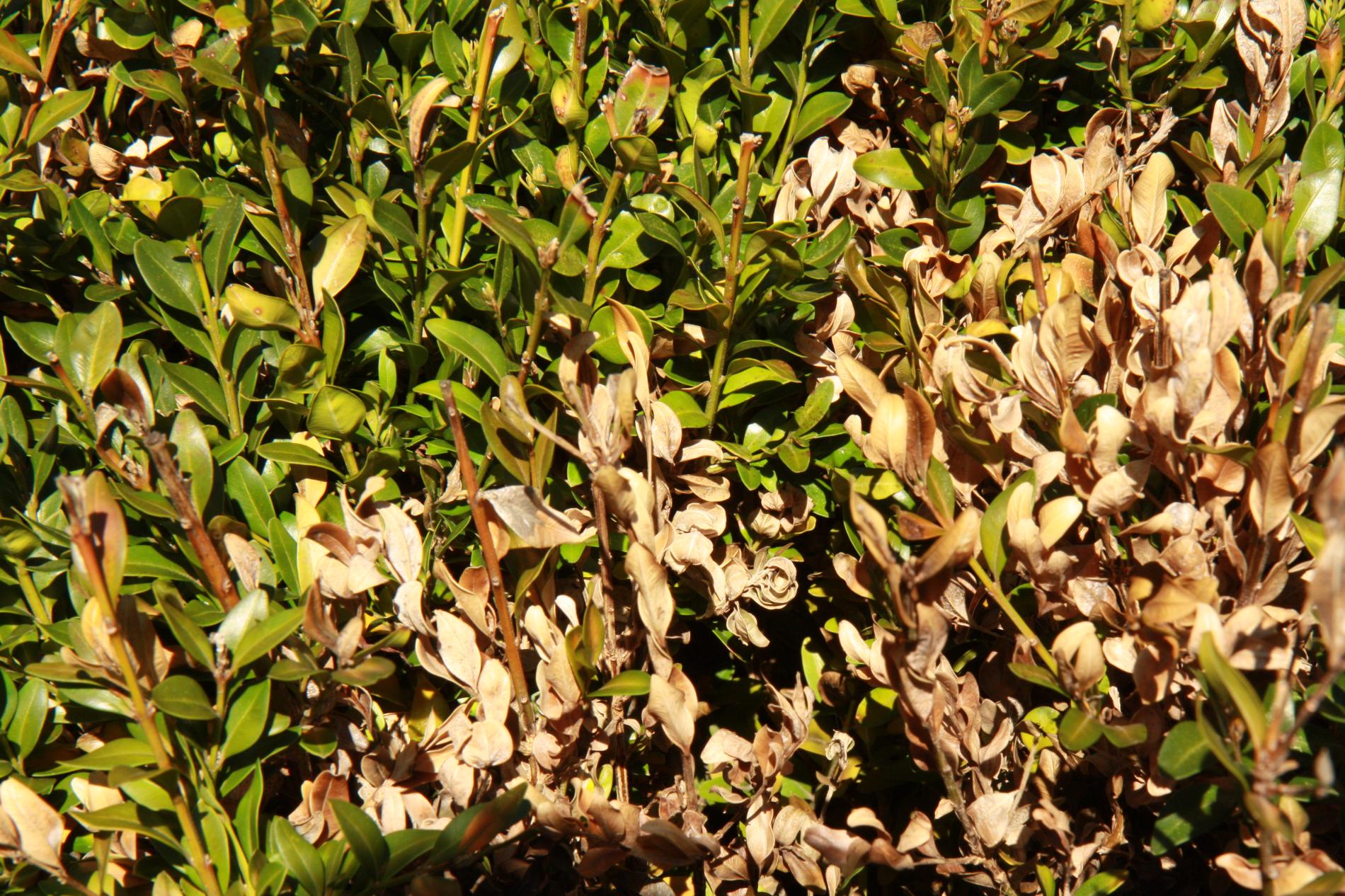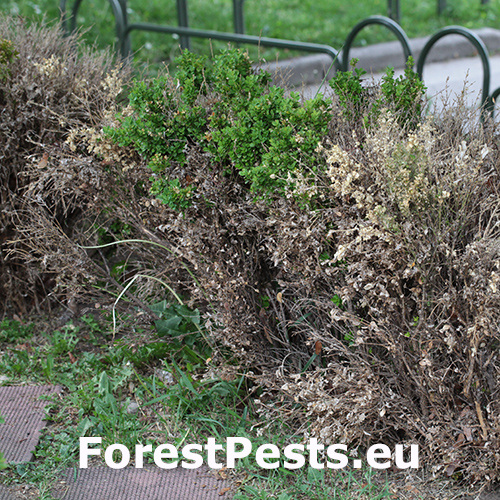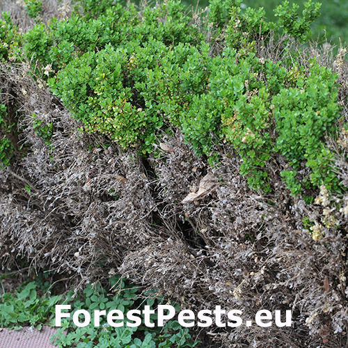Kruhové hnedé až čierne škvrny na listoch, často s tmavším okrajom. Odumieranie krušpánu sa prejavuje rýchlym opadom listov, ktorý zanecháva holé stonky. Tmavohnedé alebo čierne pruhy na stonkách. V závažných prípadoch môžu odumrieť celé vetvy, časti kríkov alebo dokonca celé kríky. Poškodenie sa podobá na poškodenie spôsobené druhom Cydalima perspectalis. Listy ale nie sú zožraté a chýbajú ďalšie symptómy typické pre žer lariev.