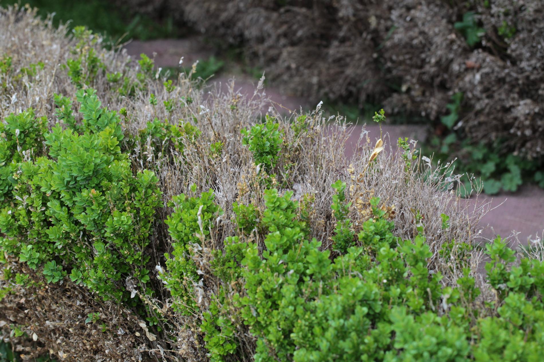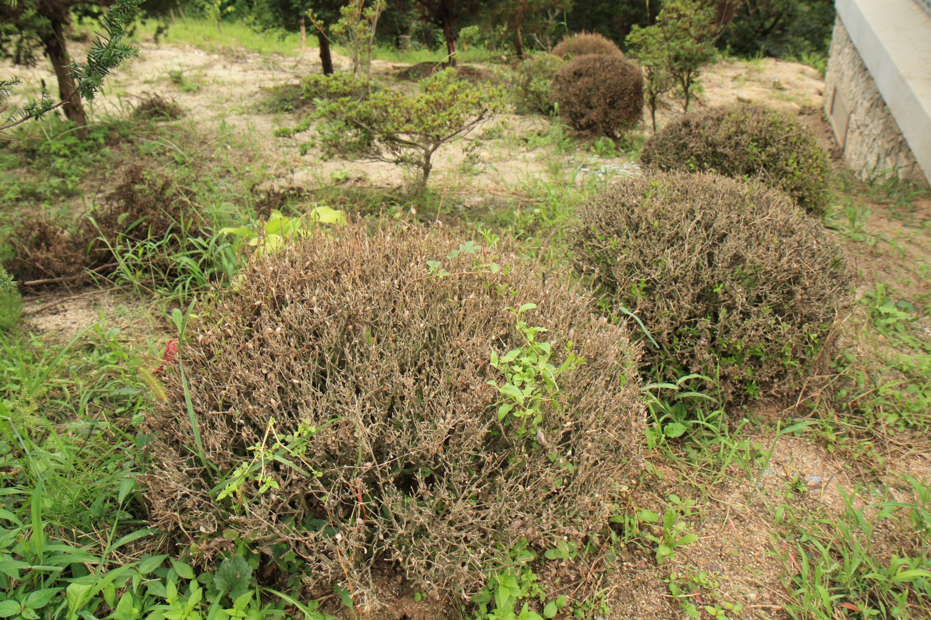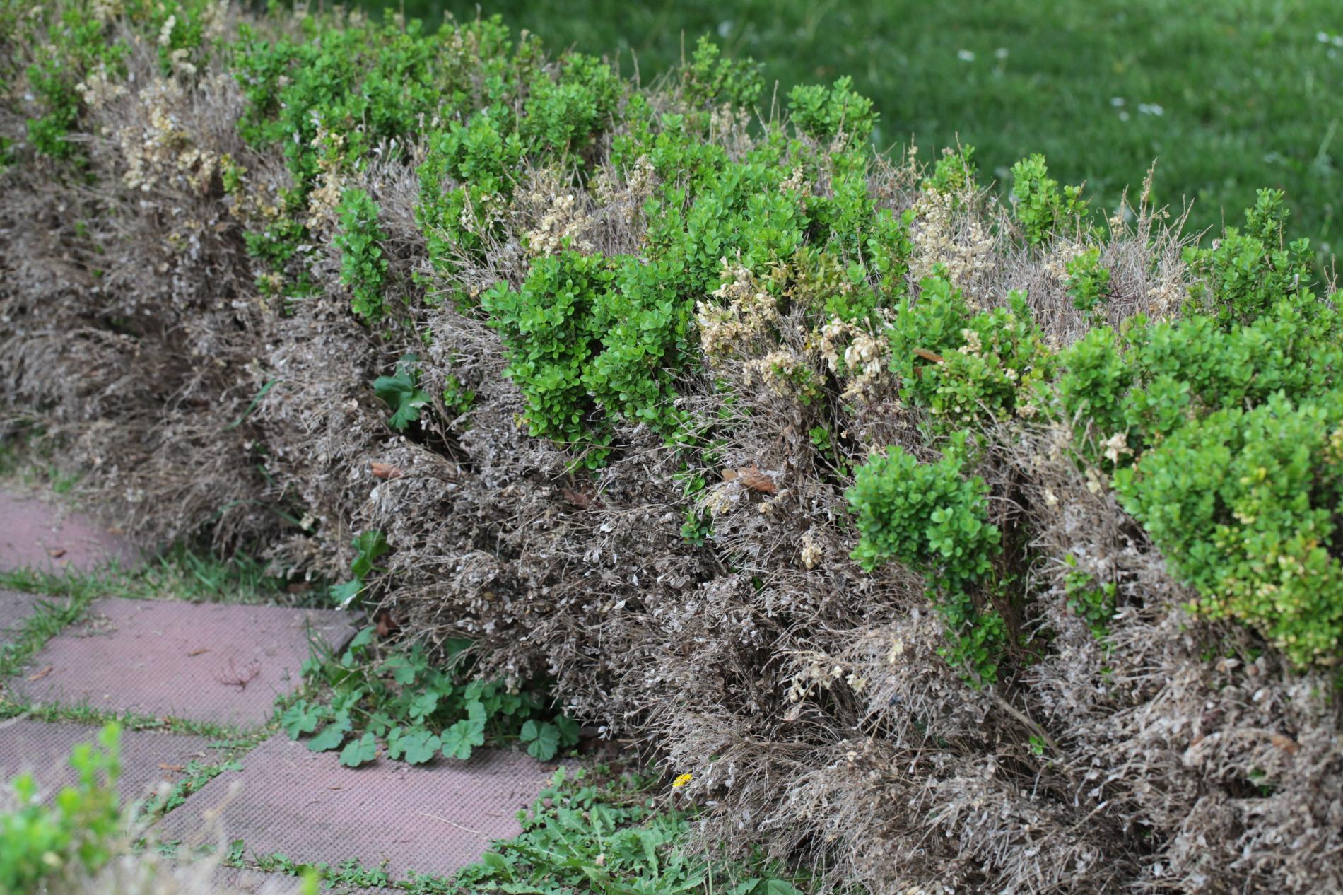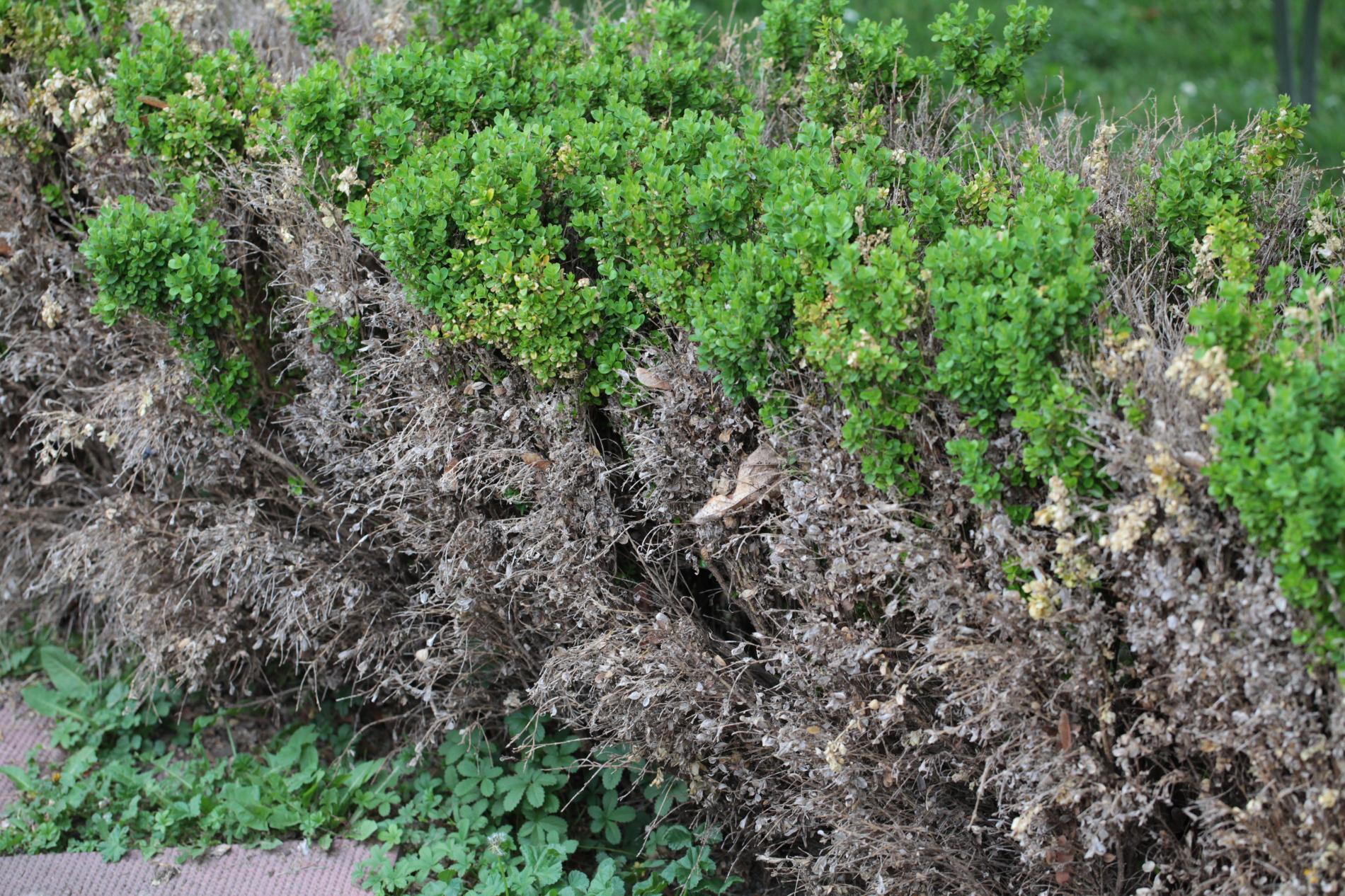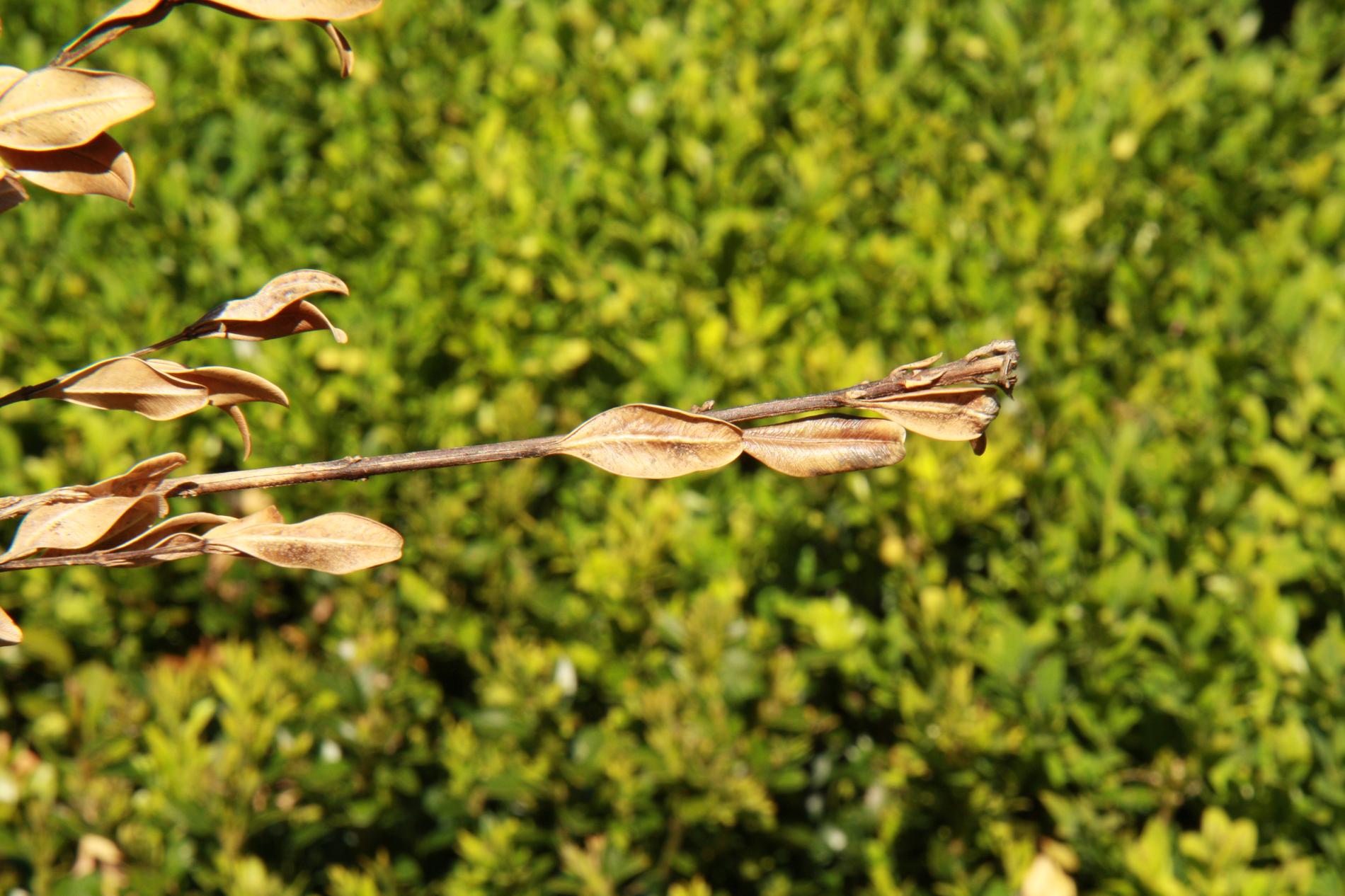 Kruhové hnedé až čierne škvrny na listoch, často s tmavším okrajom. Odumieranie krušpánu sa prejavuje rýchlym opadom listov, ktorý zanecháva holé stonky. Tmavohnedé alebo čierne pruhy na stonkách. V závažných prípadoch môžu odumrieť celé vetvy, časti kríkov alebo dokonca celé kríky. Poškodenie sa podobá na poškodenie spôsobené druhom Cydalima perspectalis. Listy ale nie sú zožraté a chýbajú ďalšie symptómy typické pre žer lariev.