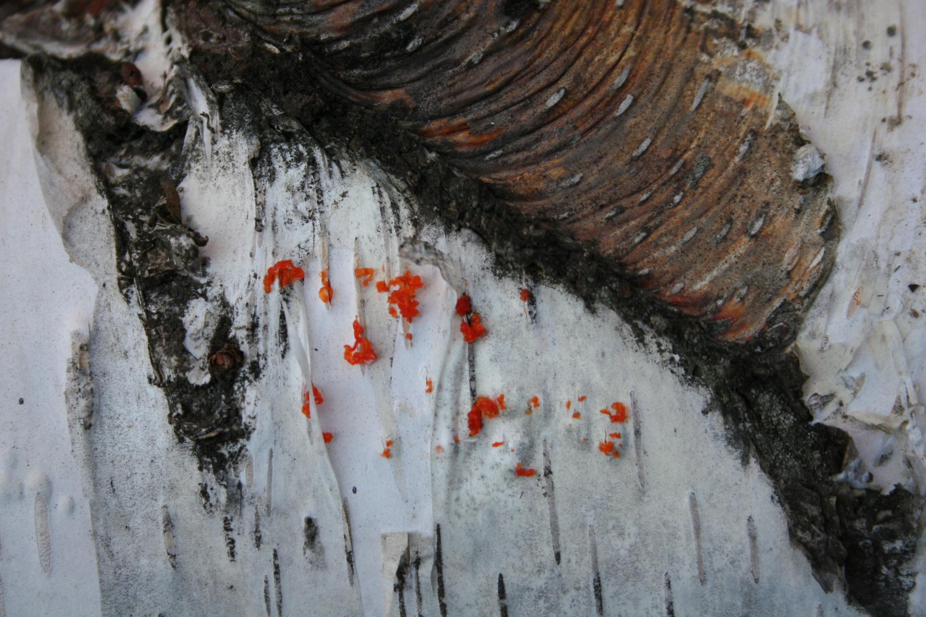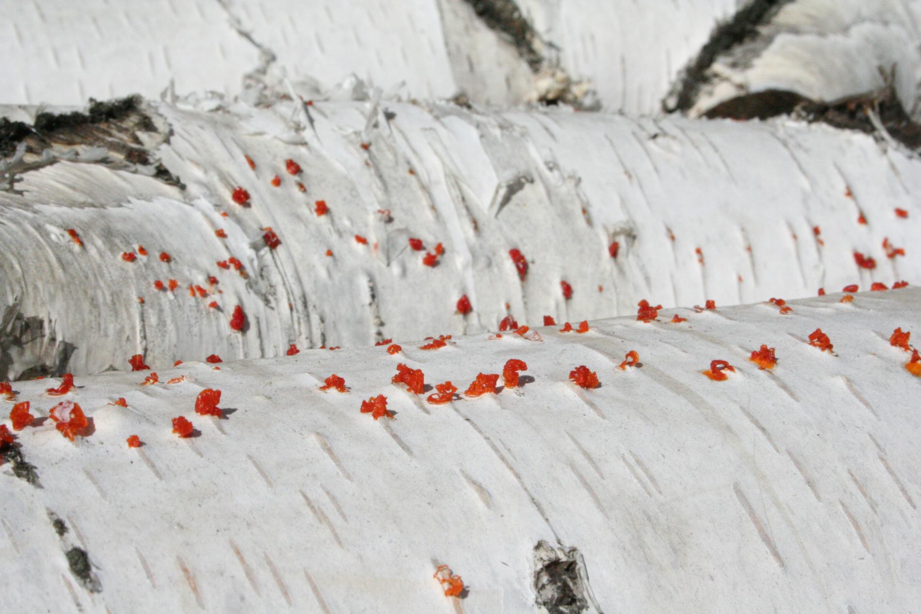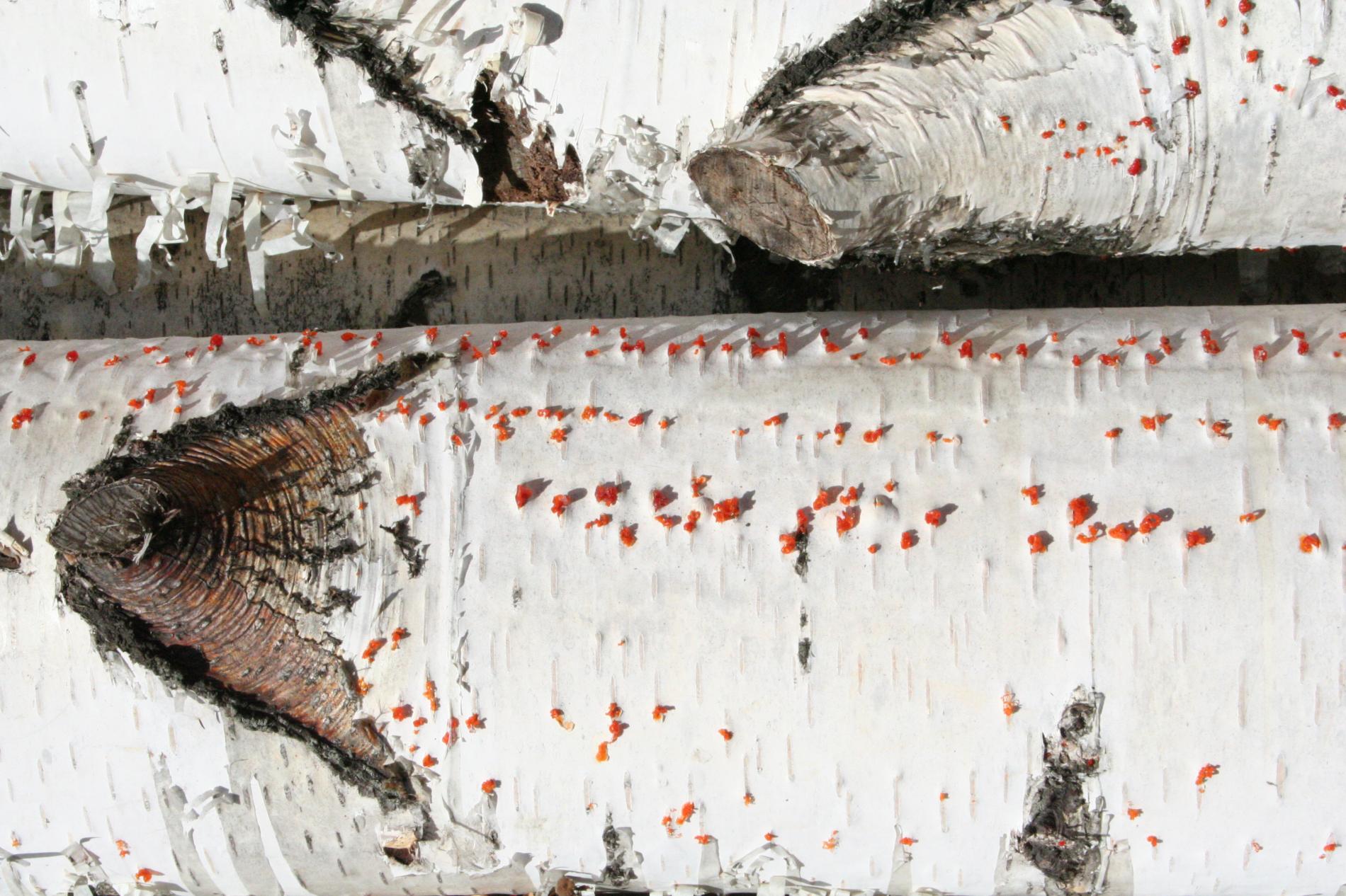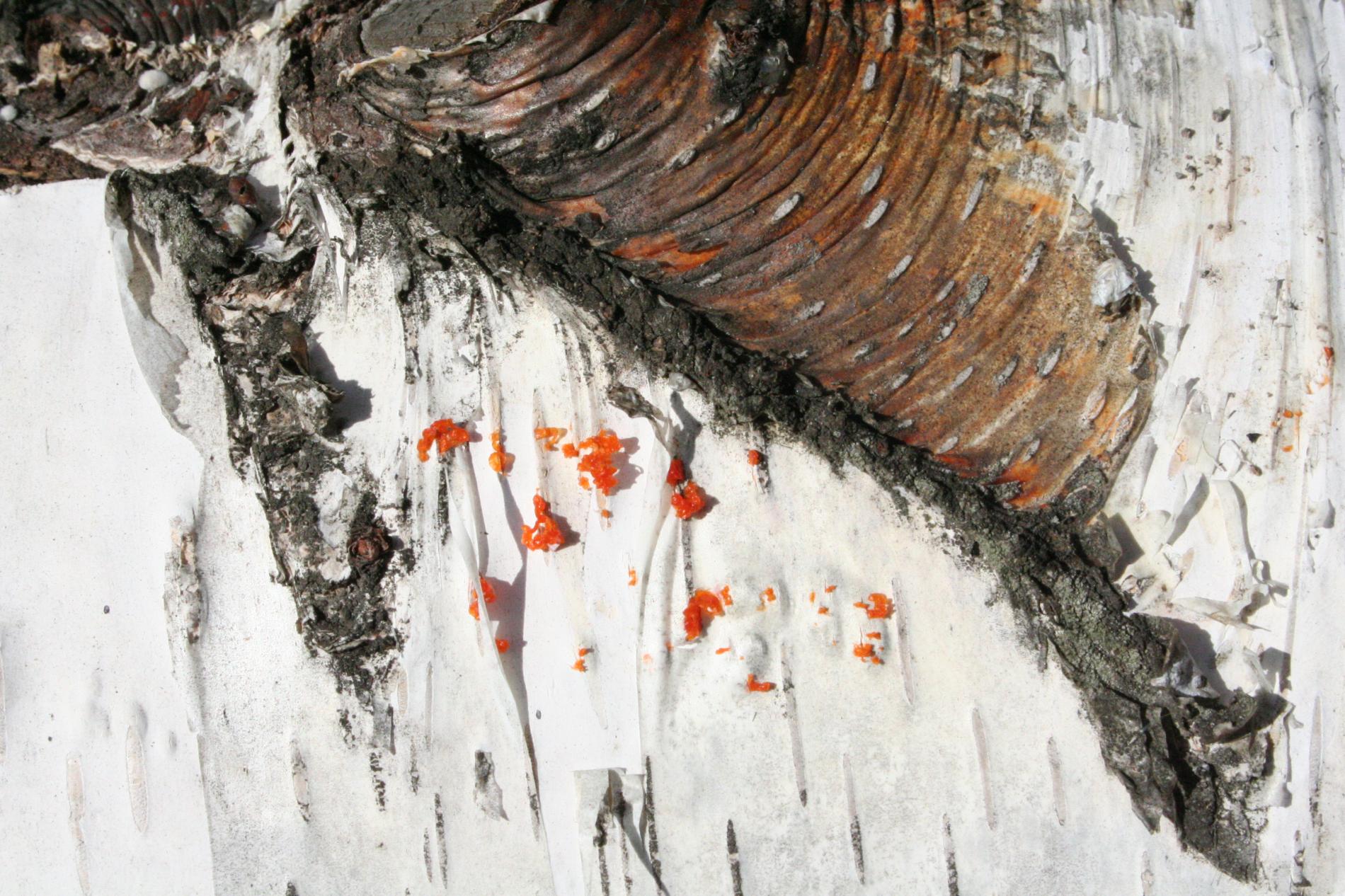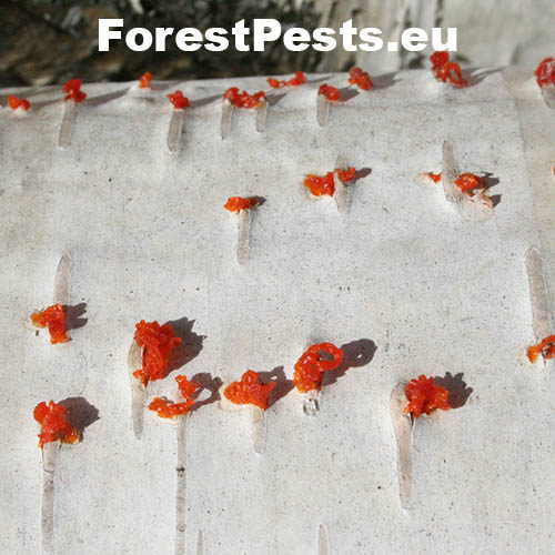 Na obrázku sú pentlice konídiospór, ktoré boli vytvorené v pyknidách 1 – 2 mm širokých pod kôrou. Takéto pentlice vytvára niekoľko húb, v tomto prípade to bola Cytospora chrysosperma, ktorej pohlavné štádium je Valsa sordida. Huba je slabým patogénom a spôsobuje poškodenia len ak bol predtým hostiteľský strom v nepriaznivých pôdno-klimatických podmienkach. Nekrotizované pletivo je vpadnuté, strom môže odumrieť 2 – 3 roky od infekcie. Pentlice spór sa vytvárajú v radoch, keď je drevo vlhké (nie mokré). Na vzduchu rýchlo uschnú, za dažďa sa rozpustia v kvapkách vody. Po uschnutí kvapiek sú spóry ako jemný prášok vzdušnými prúdmi roznášané do priestoru. Vstupnou bránou infekcie sú porania.