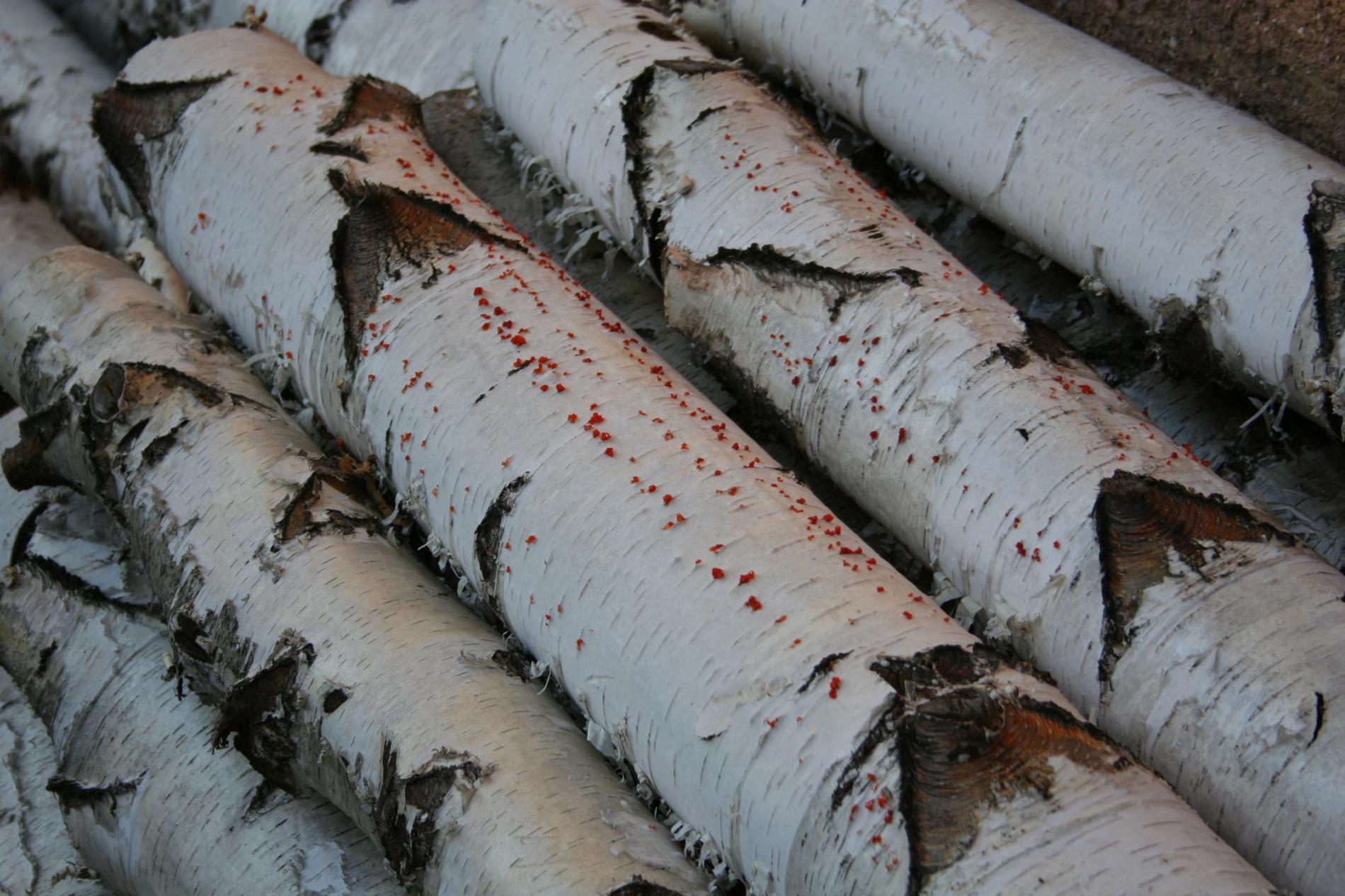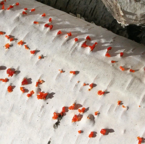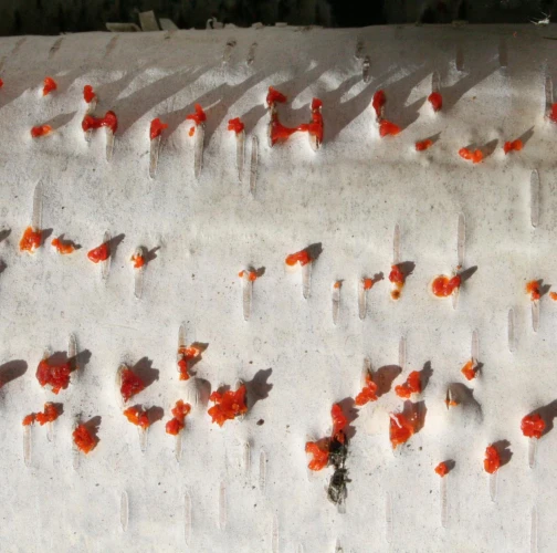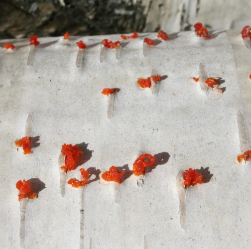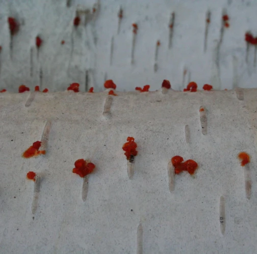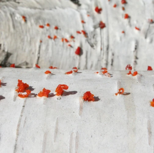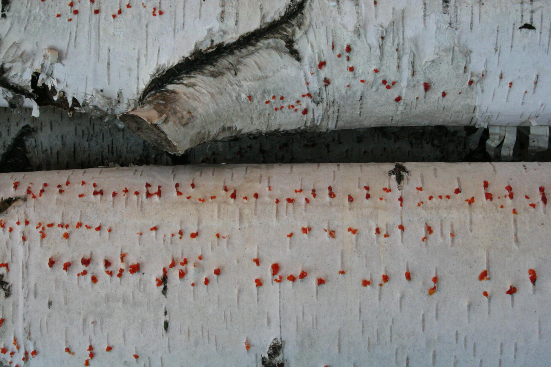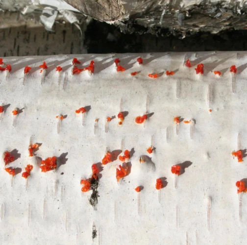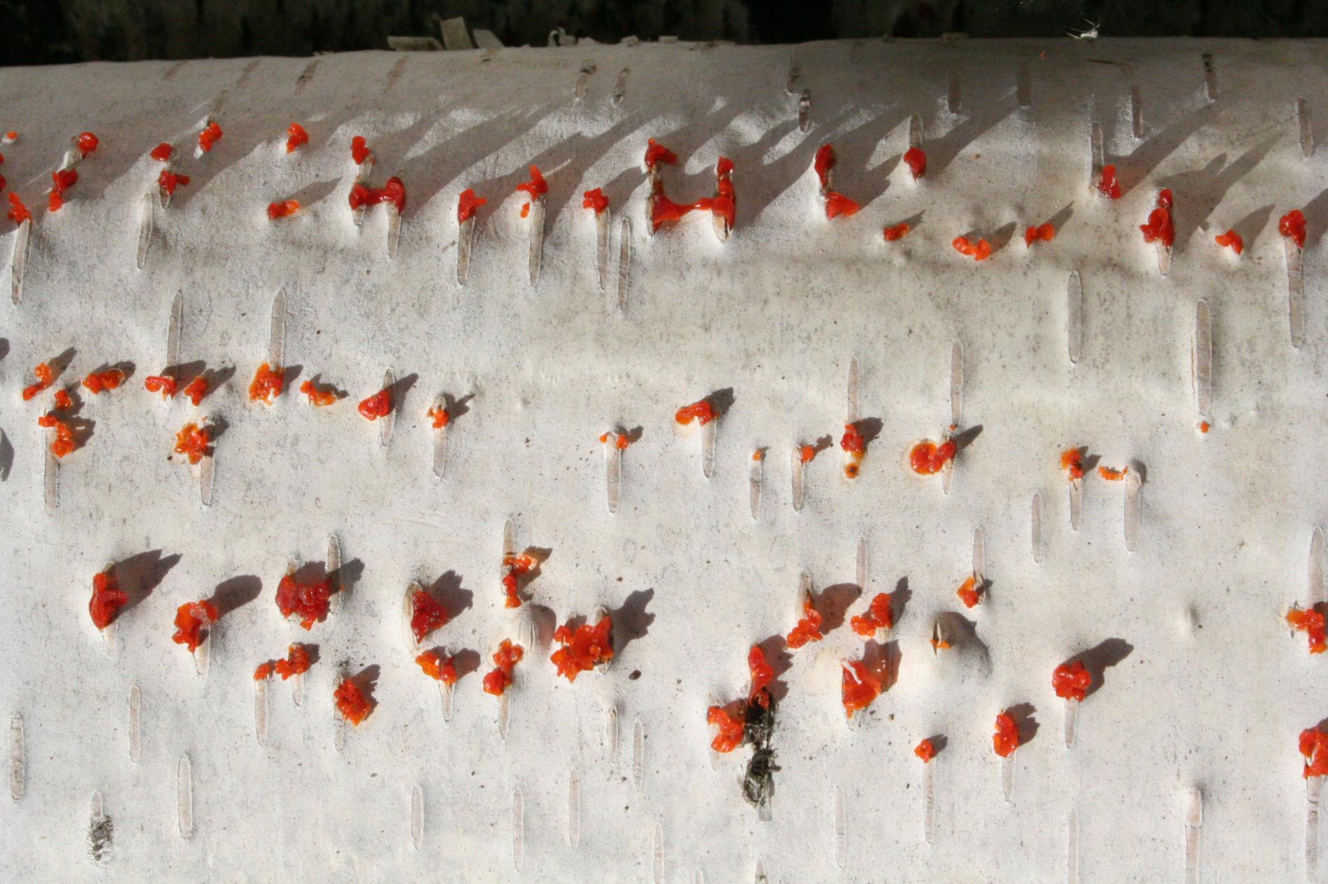 Na obrázku sú pentlice konídiospór, ktoré boli vytvorené v pyknidách 1 – 2 mm širokých pod kôrou. Takéto pentlice vytvára niekoľko húb, v tomto prípade to bola Cytospora chrysosperma, ktorej pohlavné štádium je Valsa sordida. Huba je slabým patogénom a spôsobuje poškodenia len ak bol predtým hostiteľský strom v nepriaznivých pôdno-klimatických podmienkach. Nekrotizované pletivo je vpadnuté, strom môže odumrieť 2 – 3 roky od infekcie. Pentlice spór sa vytvárajú v radoch, keď je drevo vlhké (nie mokré). Na vzduchu rýchlo uschnú, za dažďa sa rozpustia v kvapkách vody. Po uschnutí kvapiek sú spóry ako jemný prášok vzdušnými prúdmi roznášané do priestoru. Vstupnou bránou infekcie sú porania.