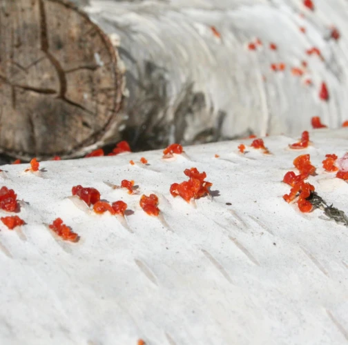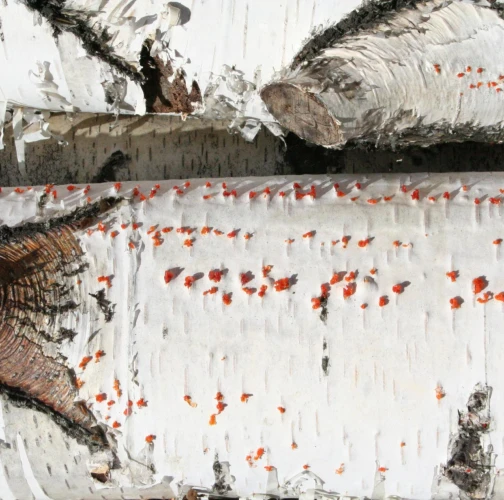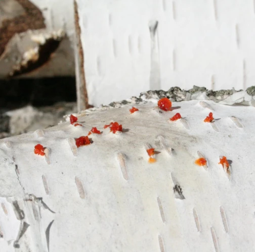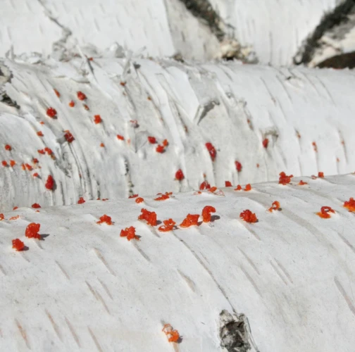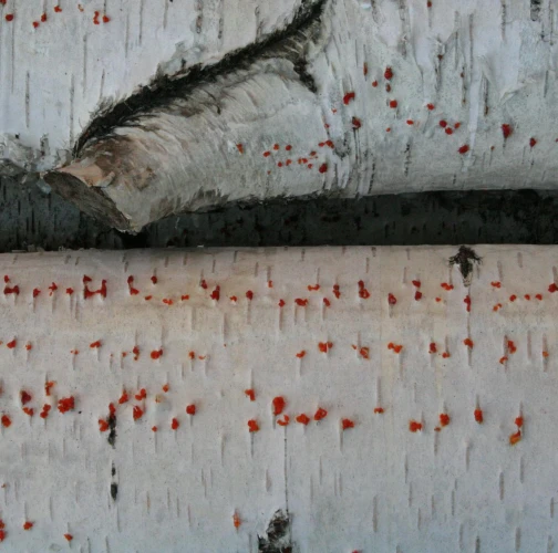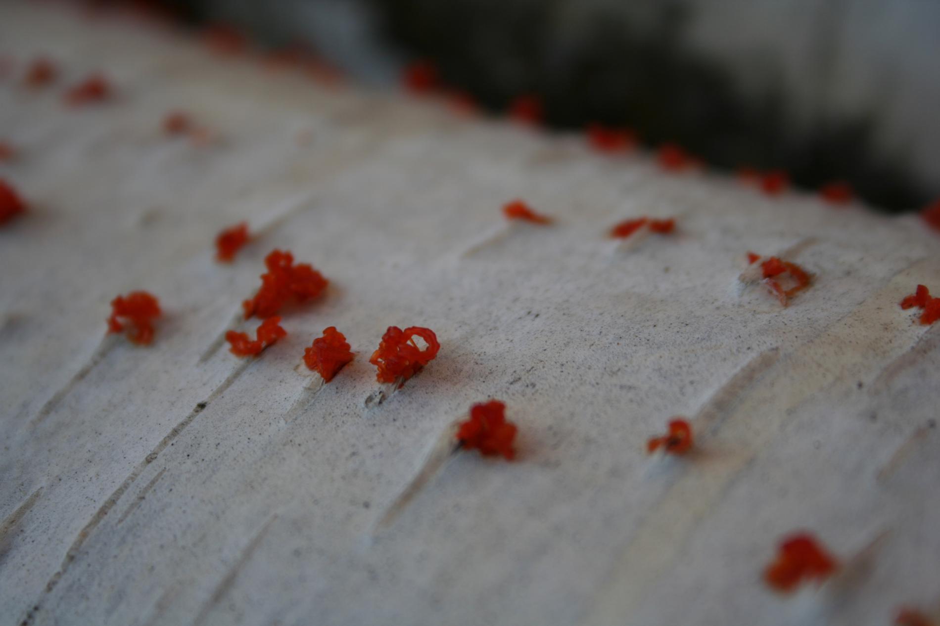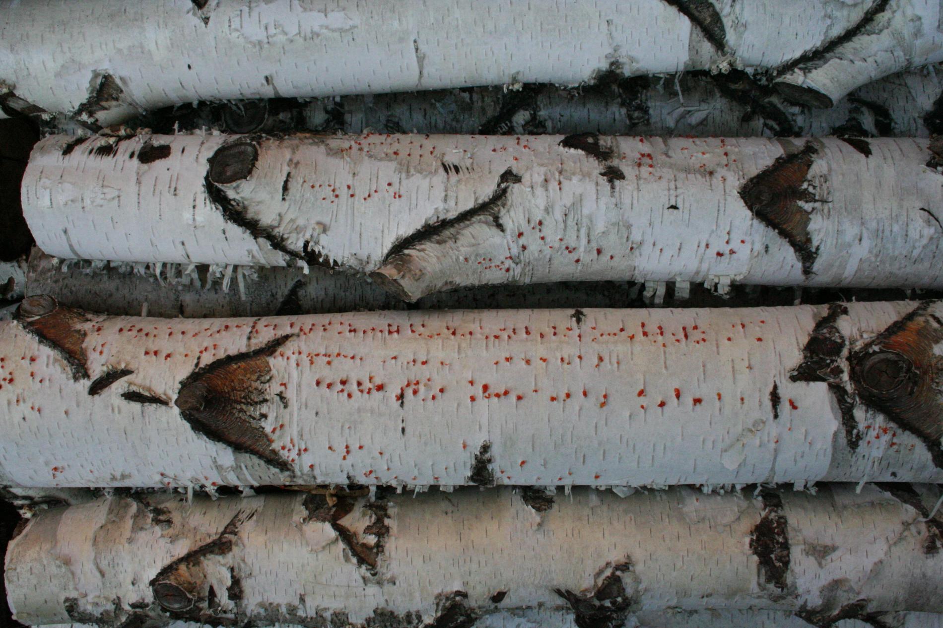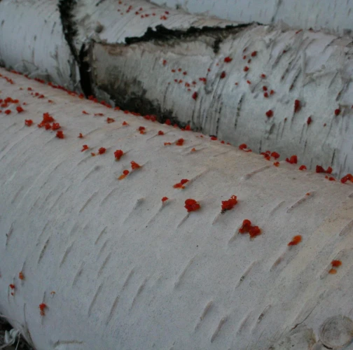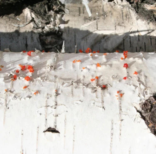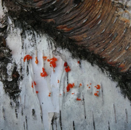 Na obrázku sú pentlice konídiospór, ktoré boli vytvorené v pyknidách 1 – 2 mm širokých pod kôrou. Takéto pentlice vytvára niekoľko húb, v tomto prípade to bola Cytospora chrysosperma, ktorej pohlavné štádium je Valsa sordida. Huba je slabým patogénom a spôsobuje poškodenia len ak bol predtým hostiteľský strom v nepriaznivých pôdno-klimatických podmienkach. Nekrotizované pletivo je vpadnuté, strom môže odumrieť 2 – 3 roky od infekcie. Pentlice spór sa vytvárajú v radoch, keď je drevo vlhké (nie mokré). Na vzduchu rýchlo uschnú, za dažďa sa rozpustia v kvapkách vody. Po uschnutí kvapiek sú spóry ako jemný prášok vzdušnými prúdmi roznášané do priestoru. Vstupnou bránou infekcie sú porania.