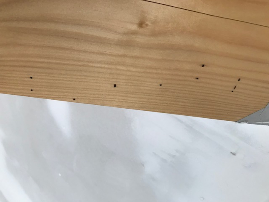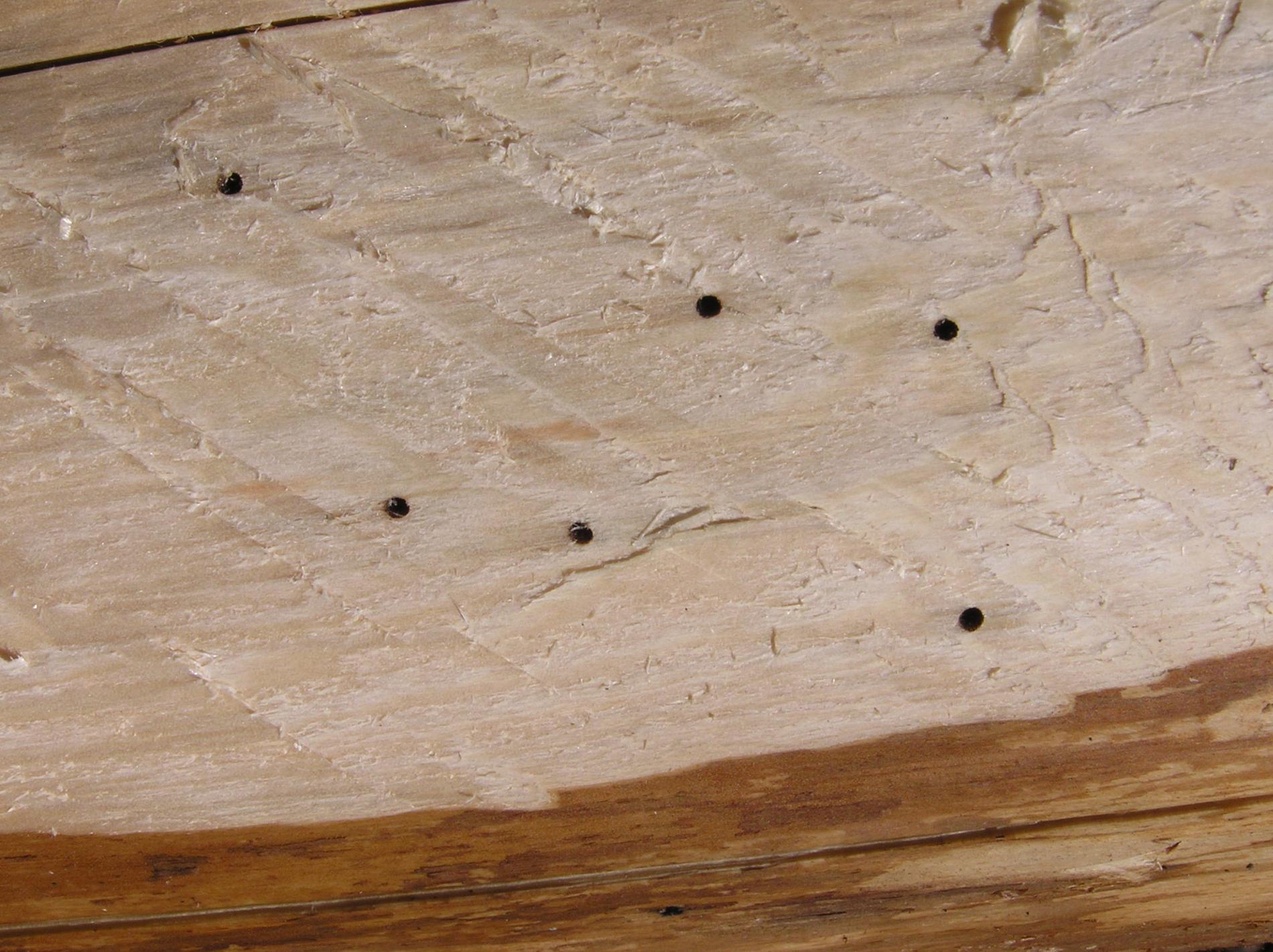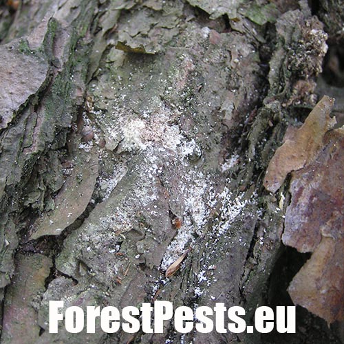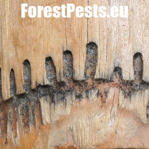 Larvy vyžierajú larvové chodby v smere osi kmeňa a tak vzniká charakteristický rebríčkovitý typ požerku.