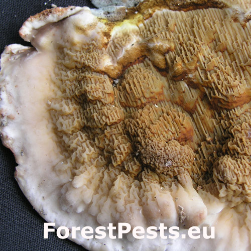 Plodnice sú jednoročné, väčšinou úplne rozliate, 5 – 30 cm široké, zakladajú sa však najprv ako biele vatovité vločky. Neskôr sa na povrch v strede vytvára žltooranžové, neskôr oranžovo červeno hnedé hyménium na jamkovitých záhyboch. Okraj plodnice do cca 2 cm zostáva biely. Plodnice sa tvoria v lete a v jeseni, nie však vo voľnej prírode, ale v temných miestnostiach pivníc a povál bez prístupu svetla. Ohrozené je aj drevo suchých stavieb, keďže k svojmu vývoju potrebuje málo vlhkosti. Vytvára aj biele syrócium a povrazcovité rizomorfy. Hnijúce drevo je hnedé, hranolčekovito sa rozpadajúce. Pri rozklade vzniká toľko vody, že sa na podhubí objavujú kvapky, ktoré zvlhčujú prostredie.