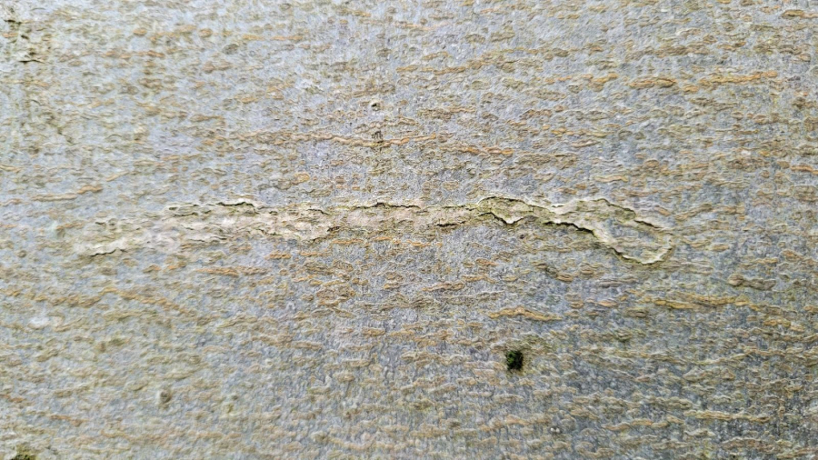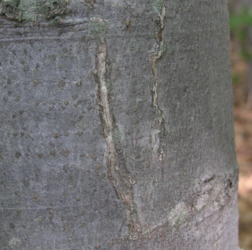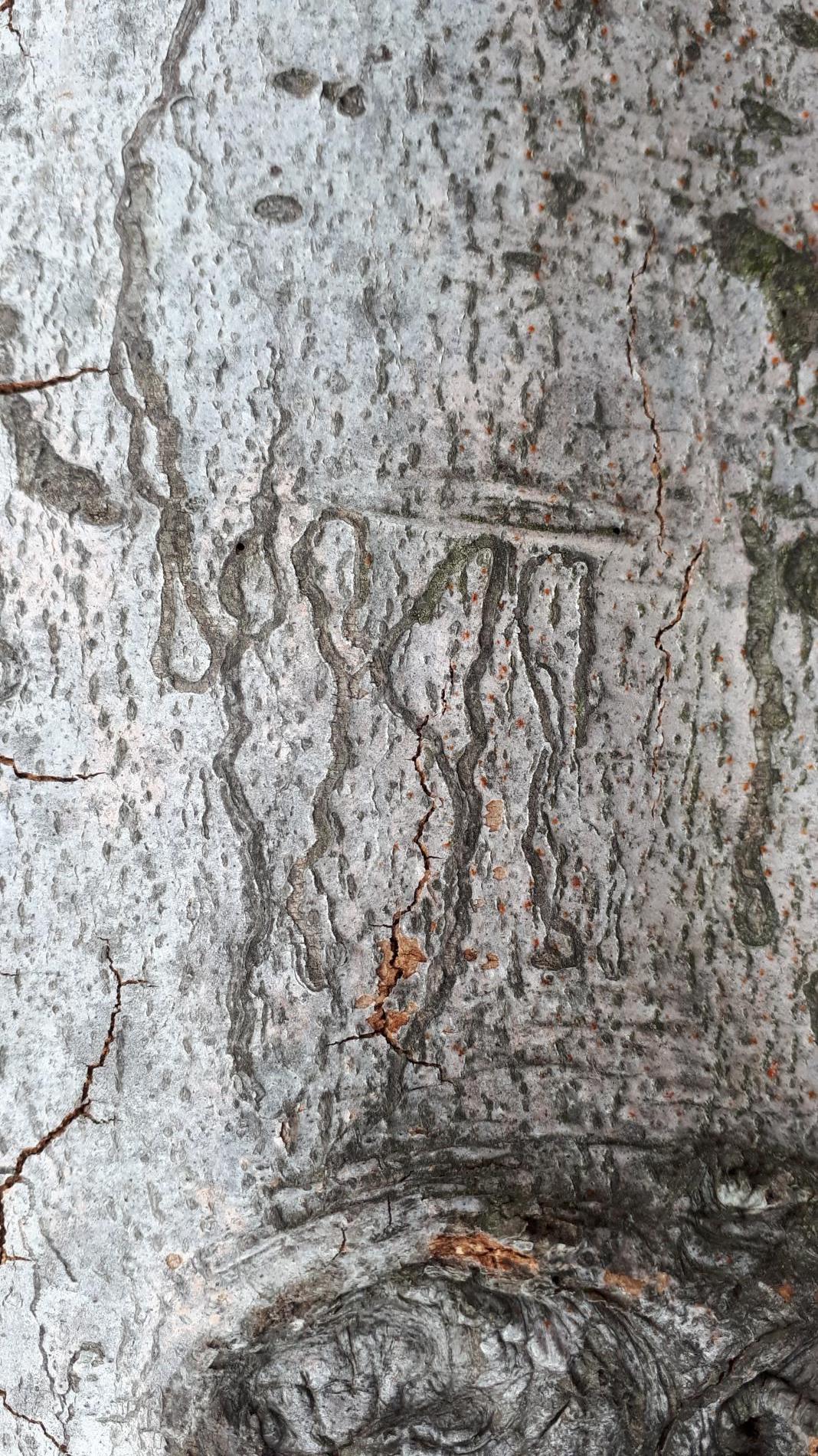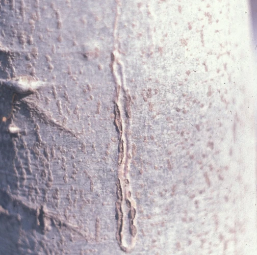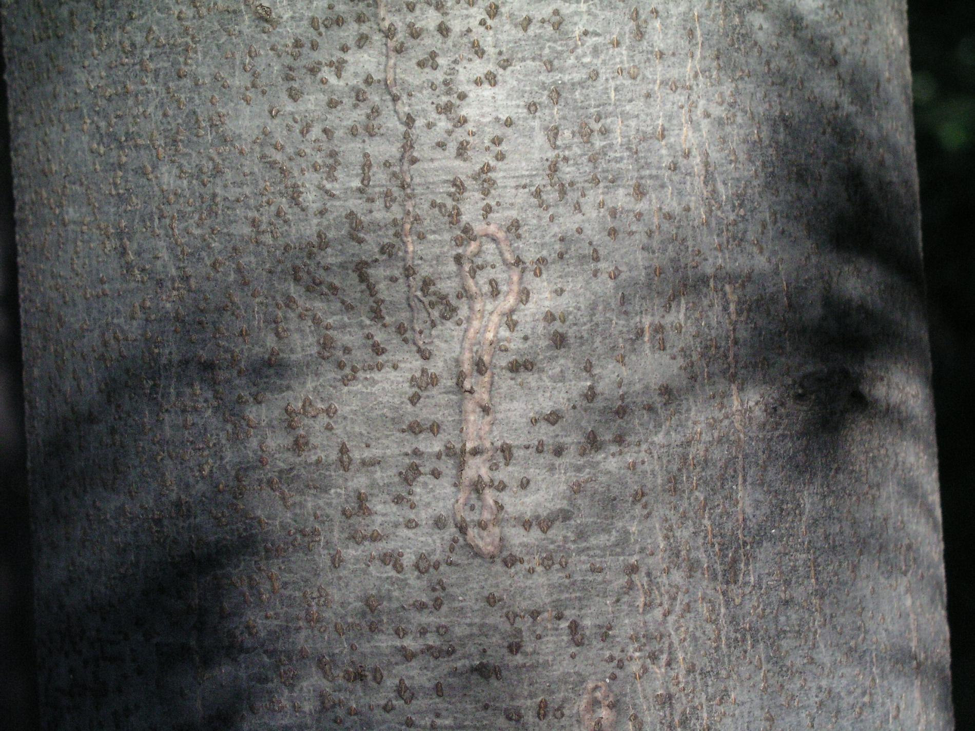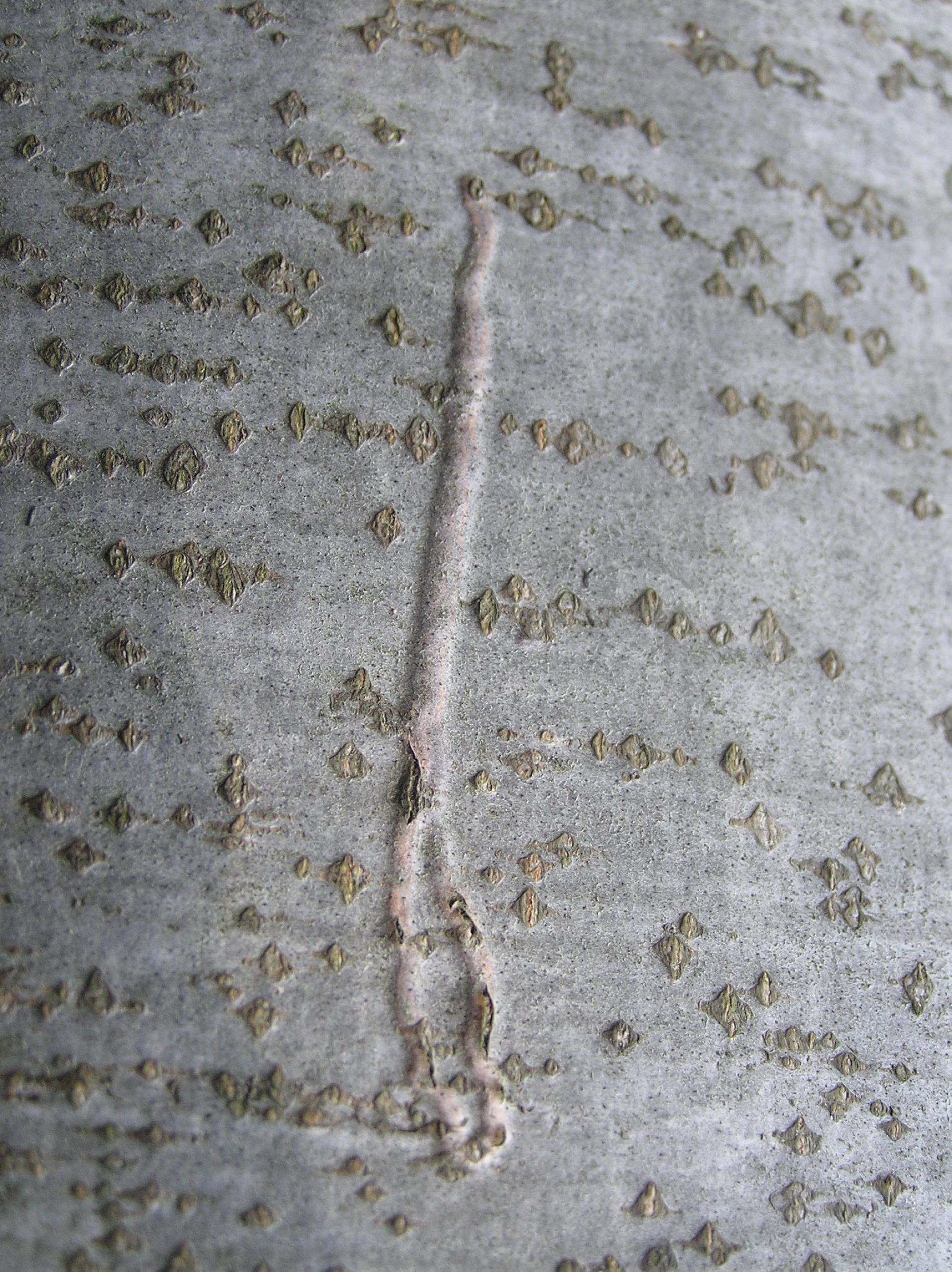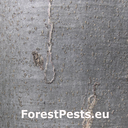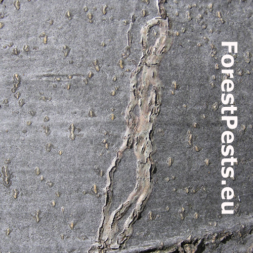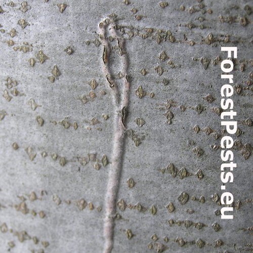 Požerok pod kôrou, viditeľný aj z vrchnej strany kôry na kmeni bukov.