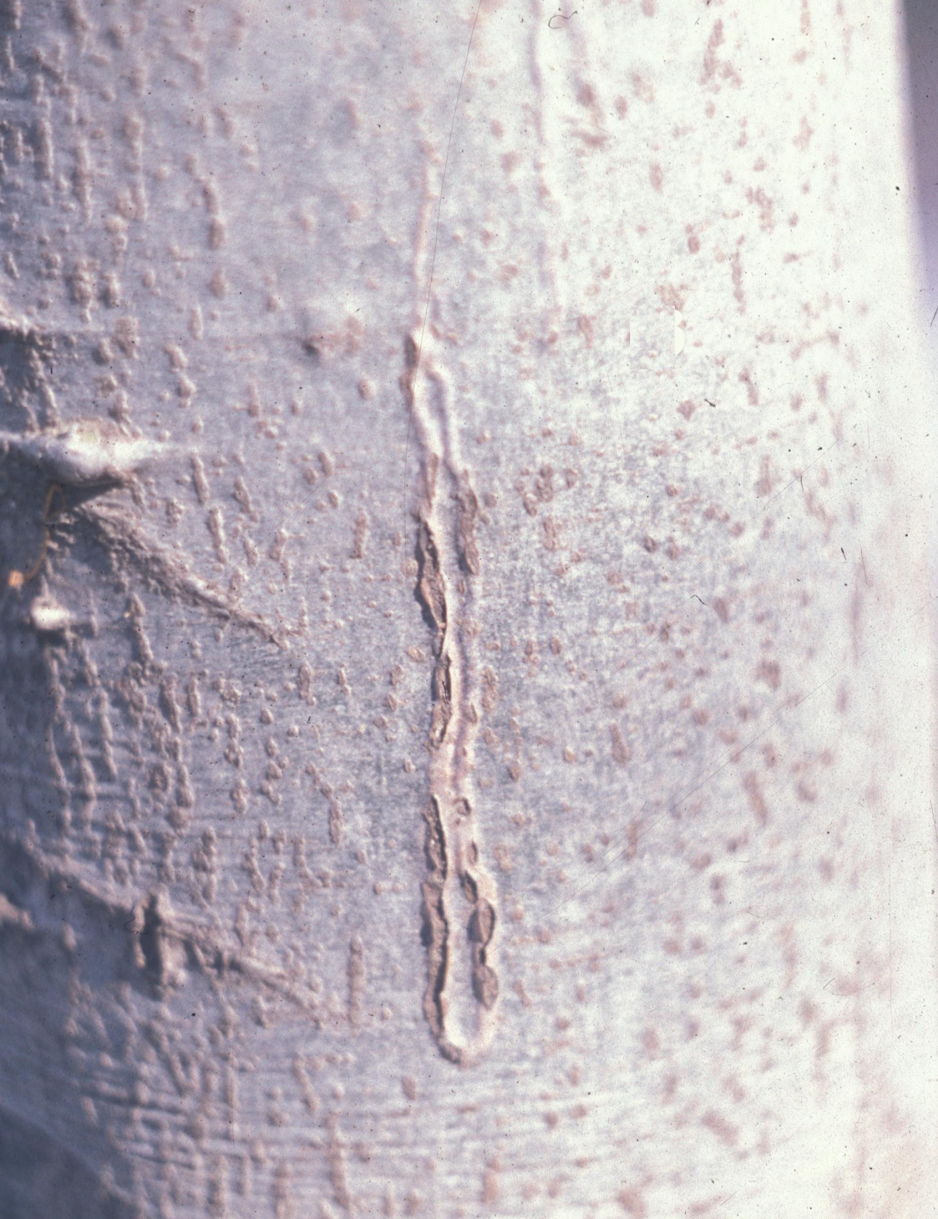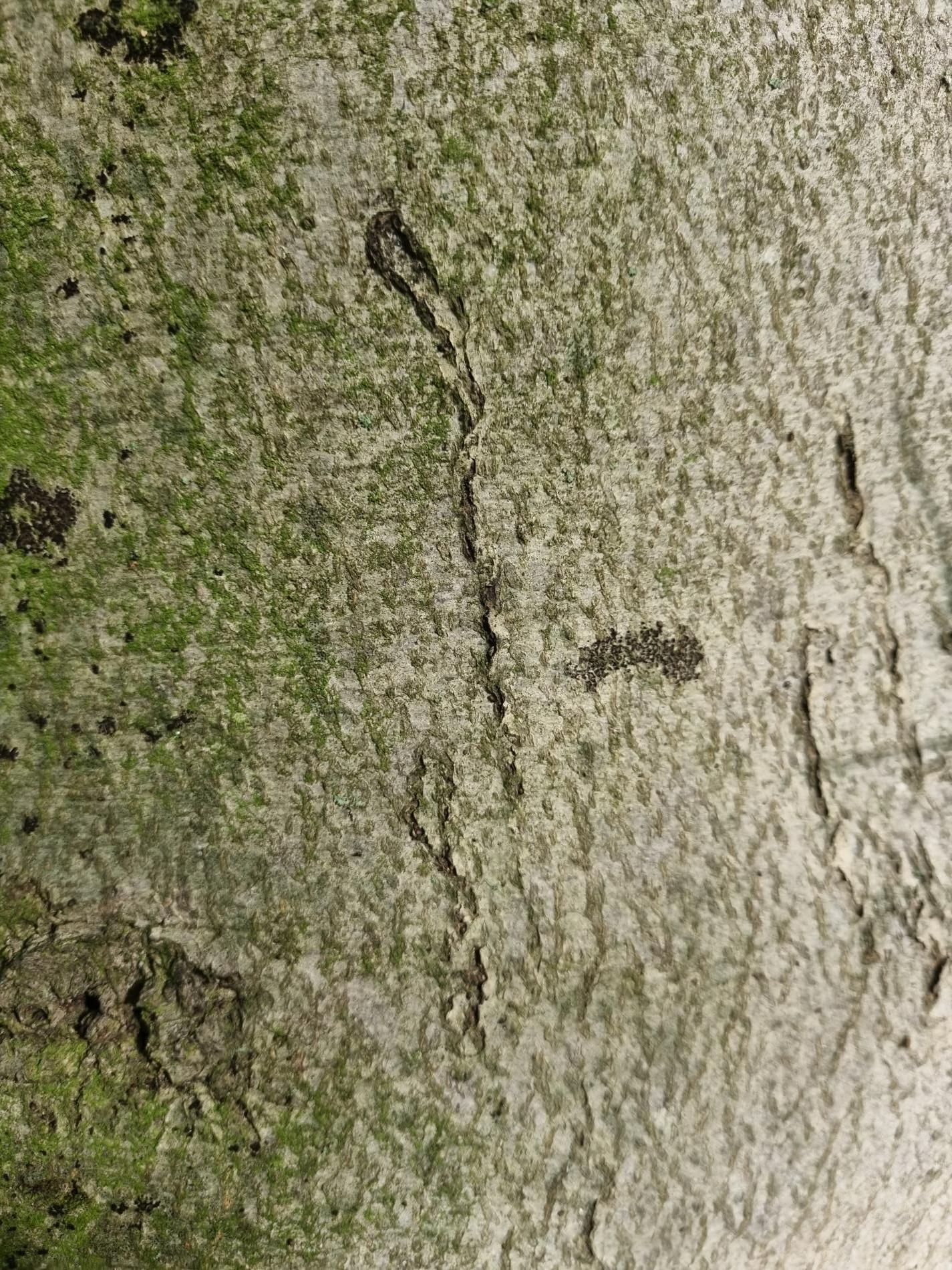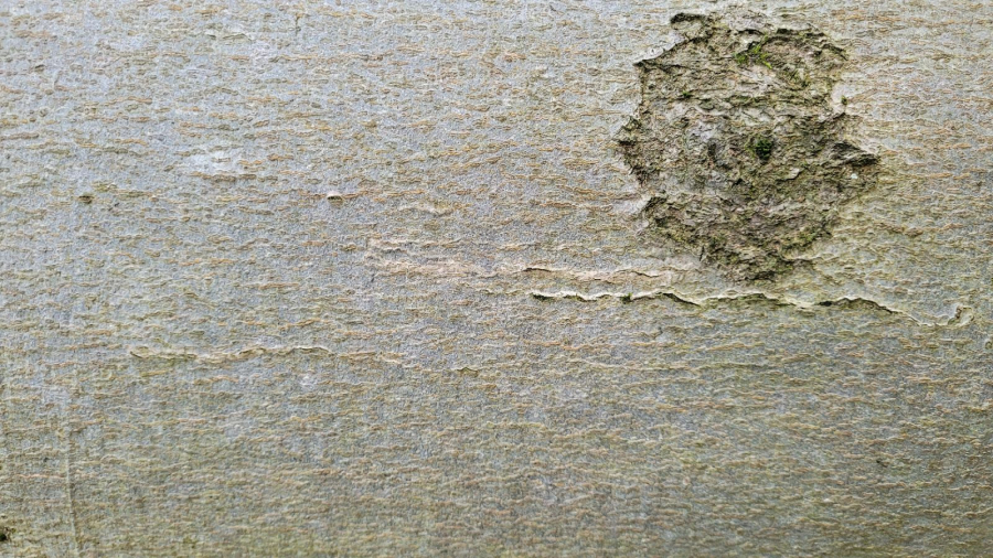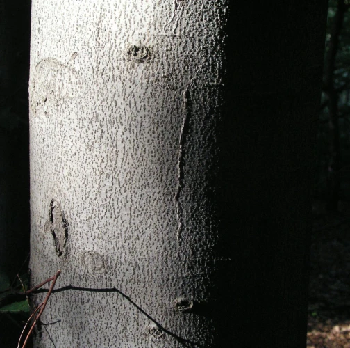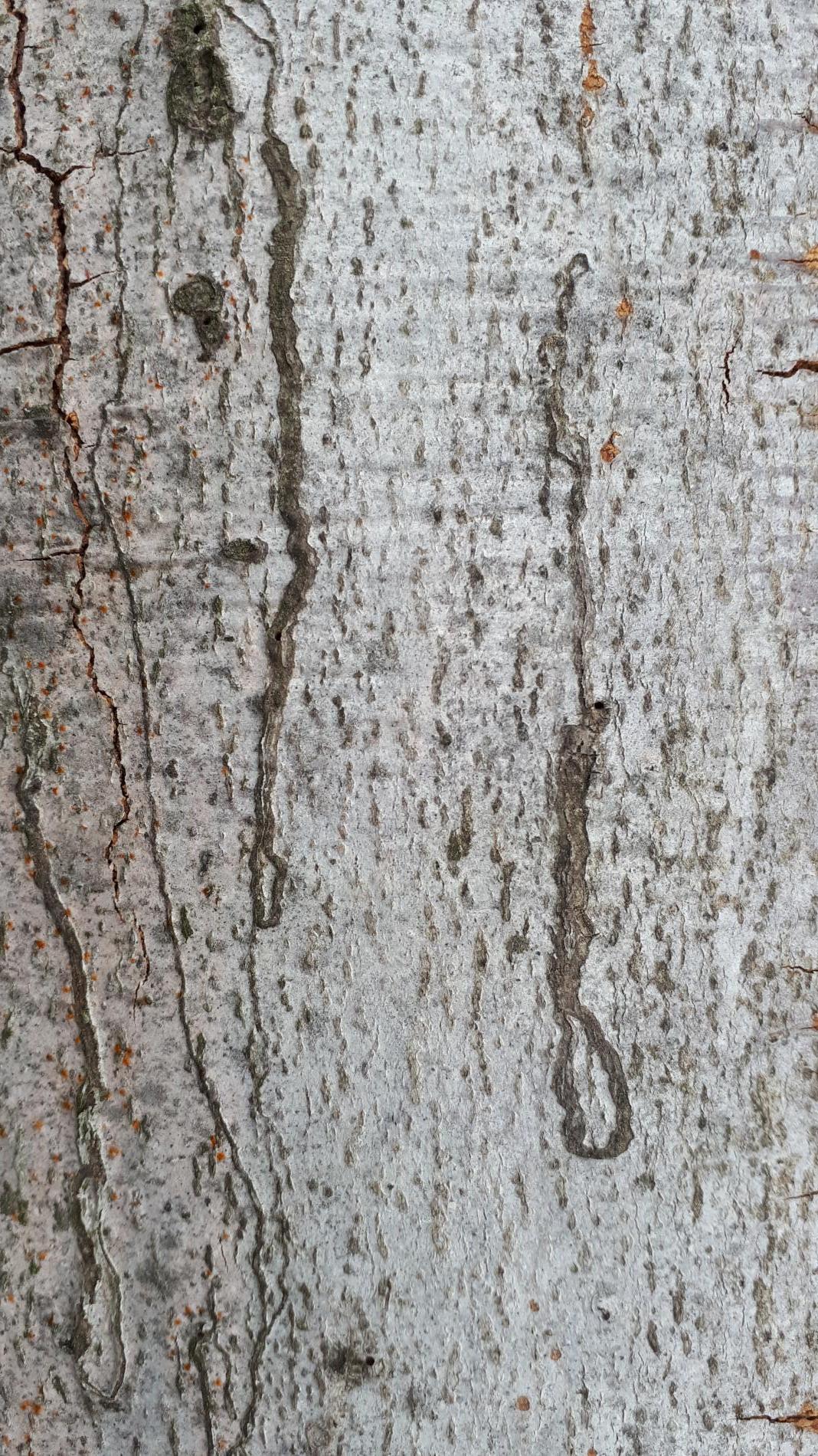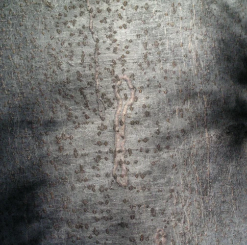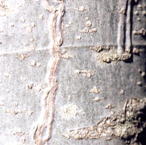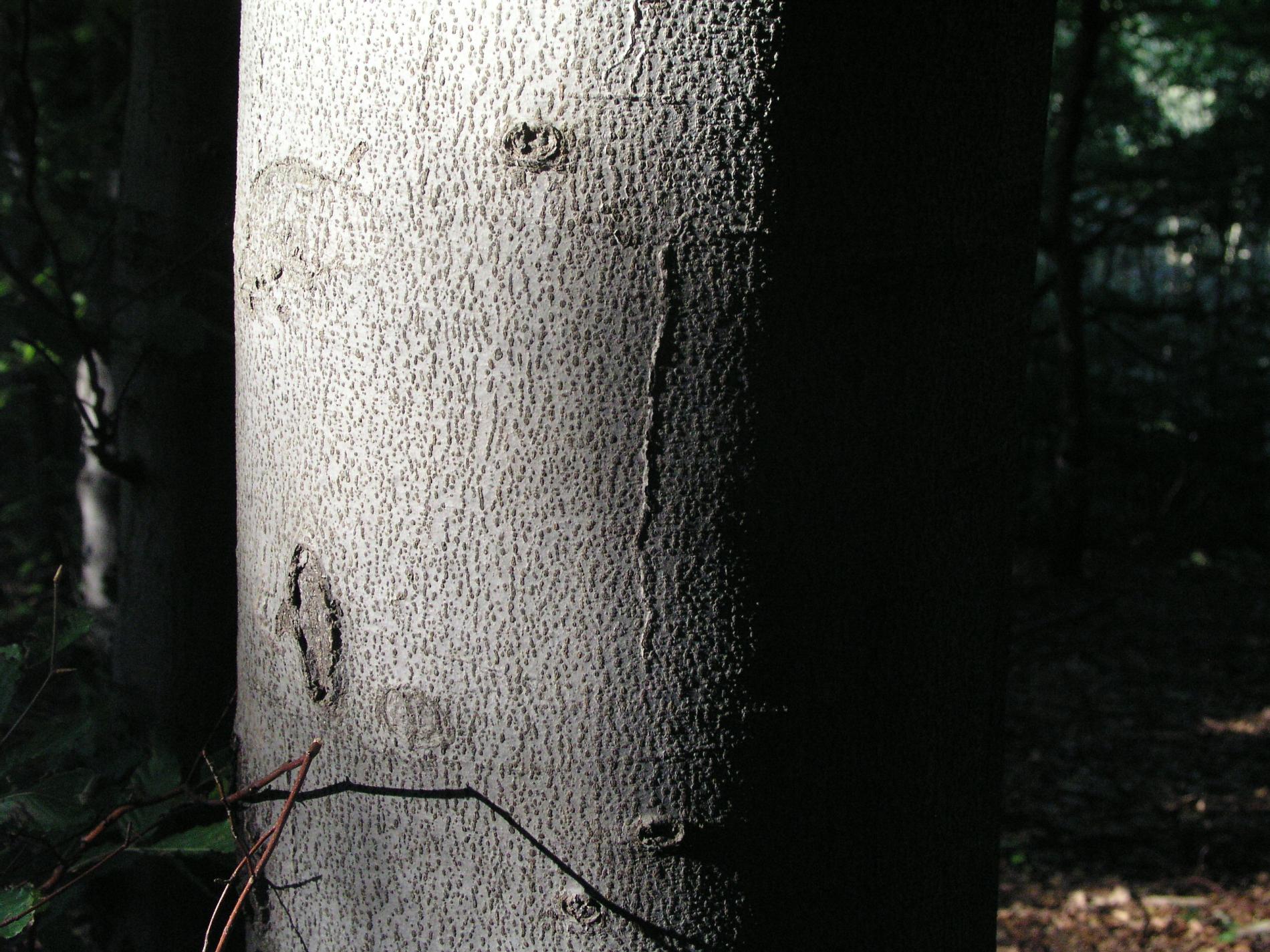 Požerok pod kôrou, viditeľný aj z vrchnej strany kôry na kmeni bukov.