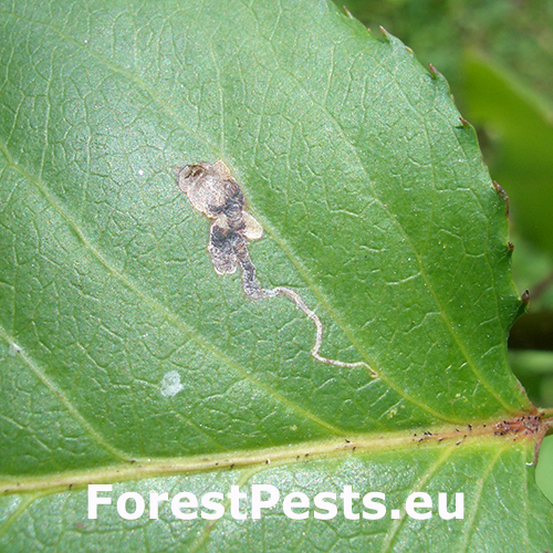 Napadnuté listy vykazujú úzke, kľukaté chodbičky s čiernym trusom, ktoré sa nakoniec zvinú do kompaktnej škvrny. Tieto míny sú viditeľné na oboch stranách listu a spôsobujú, že listy vyzerajú škvrnito a nevzhľadne.