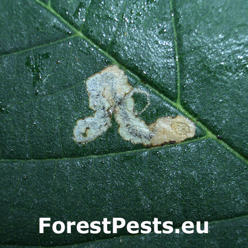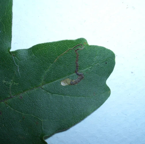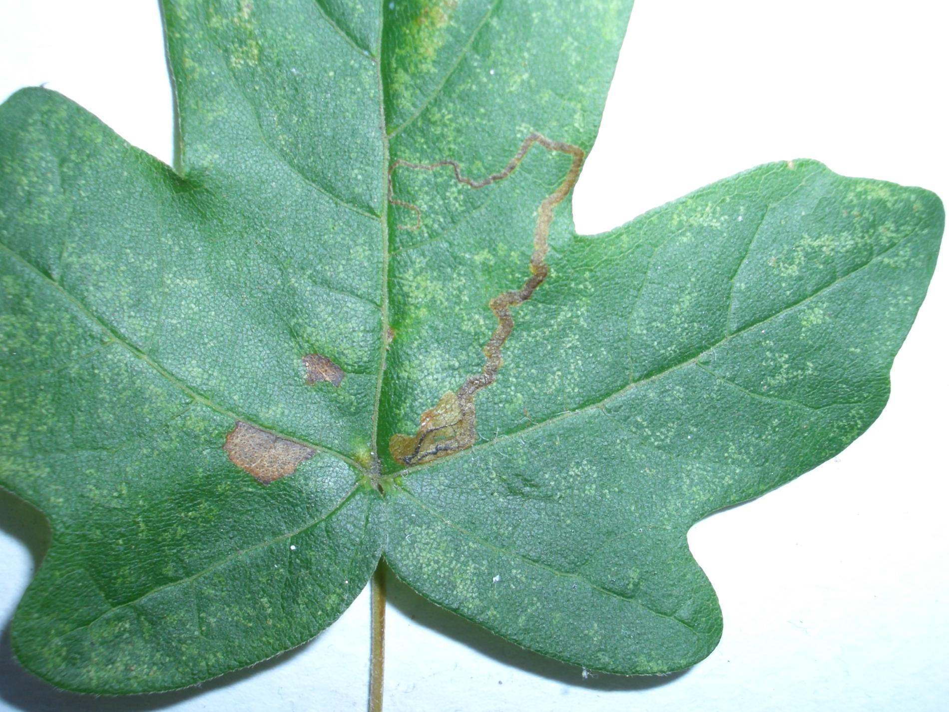 Listy majú na vrchnej strane úzke, kľukaté míny naplnené trusom. Míny môžu niekedy vyzerať ako hnedé, škvrnité plochy.