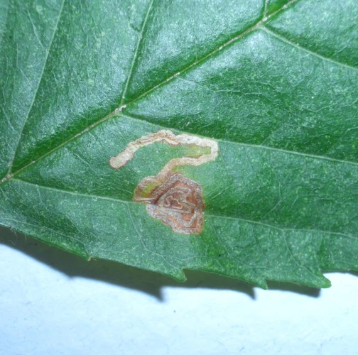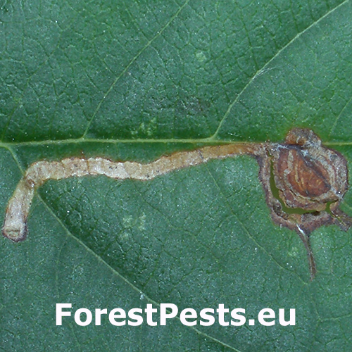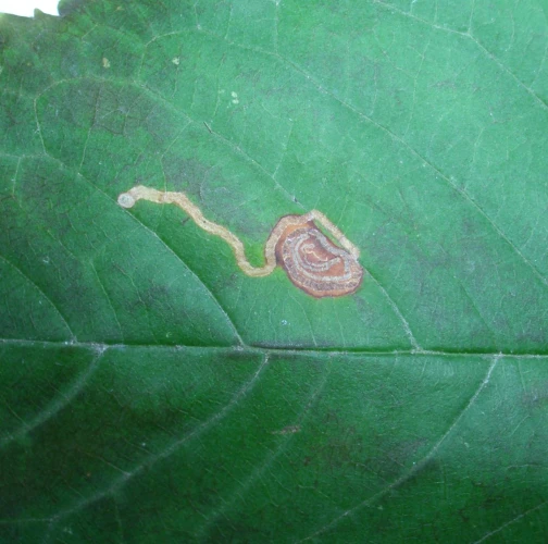 Na listoch sú míny, spočiatku stočené do špirály naplnené trusom. Špirálovitý vzhľad začiatku míny je veľmi charakteristický pre tento druh. Na konci sa potom špirála končí 1-2 cm rovným úsekom, s priestorom na kuklu na konci. Na jednom liste môže byť viacero mín a listy majú potom škvrnitý vzhľad. Pôsobia nevzhľadne.