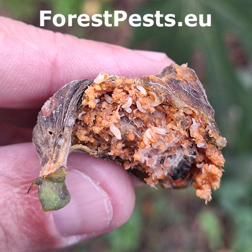 Na napadnutých plodoch sú viditeľné malé škvrny po kladení vajíčok, plody môžu opadávať, hnednúť alebo hniť. Vo vnútri plodu sú prítomné larvy – v jednom plode môže byť mnoho lariev.