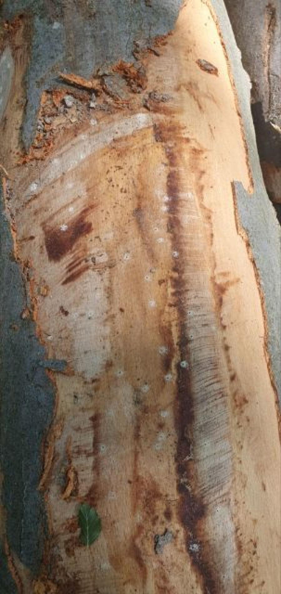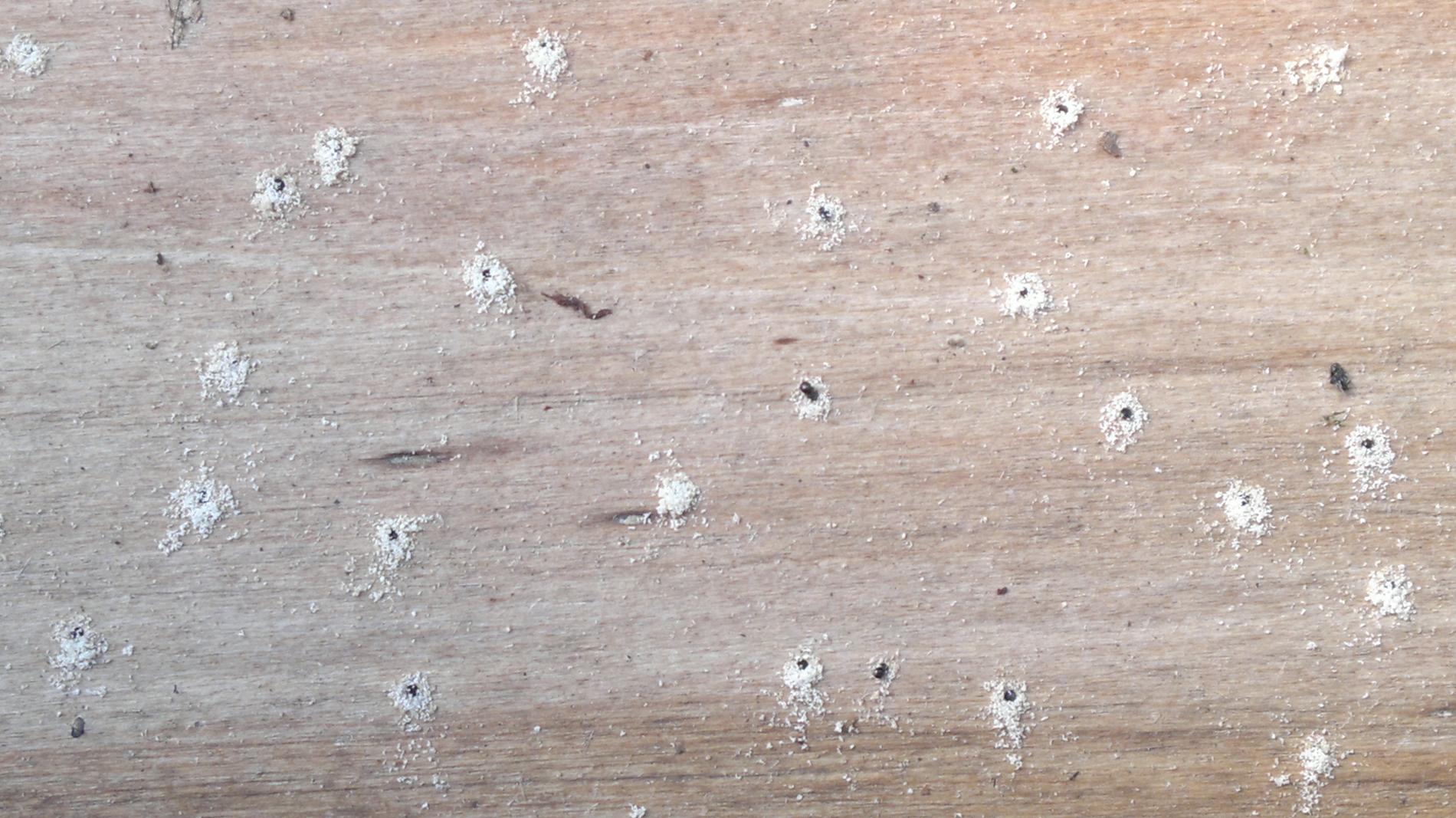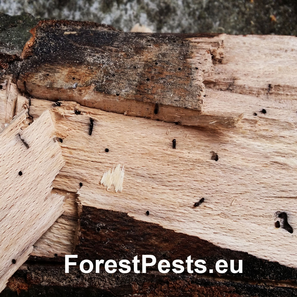 Prítomnosť kôpiek bielych drvín, neskôr zo závrtového otvoru vychádza „zlepený valček“ drvín a trusu, po dažďoch vidíme len čierny závrtový otvor priemeru cca 1 mm. Poškodenie je len na stresovaných stromoch, pňoch alebo vyťažených sortimentoch. Požerky sa vyskytujú na strome od konárov až po najhrubšie výrezy.