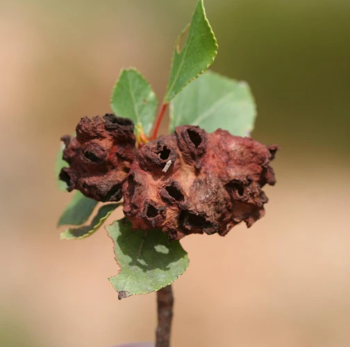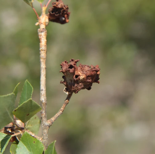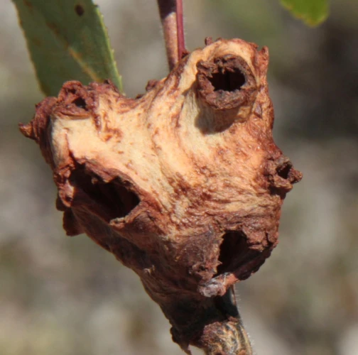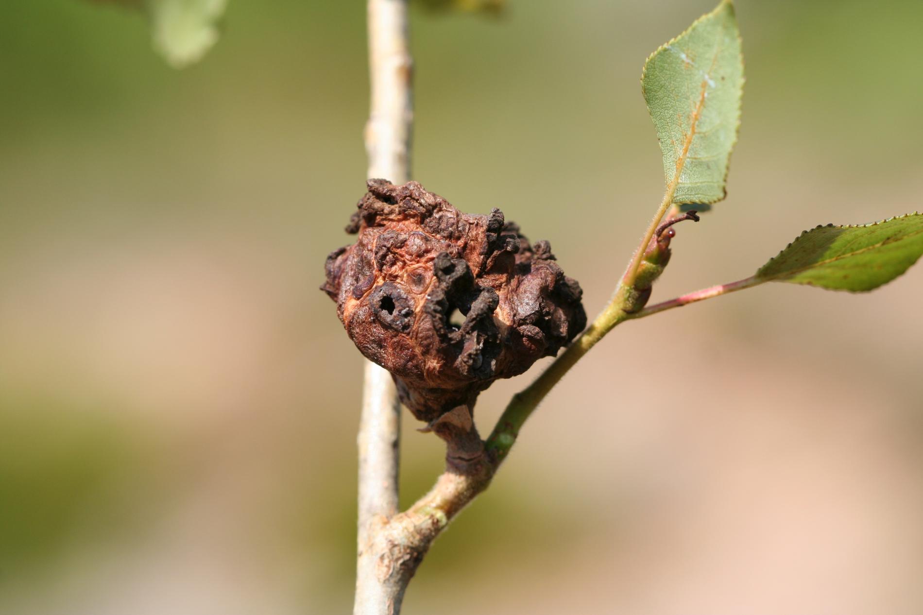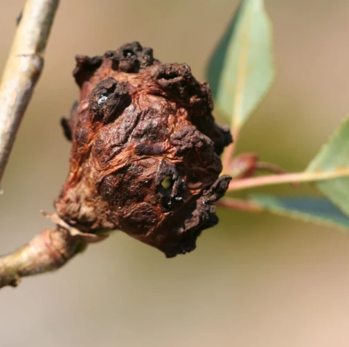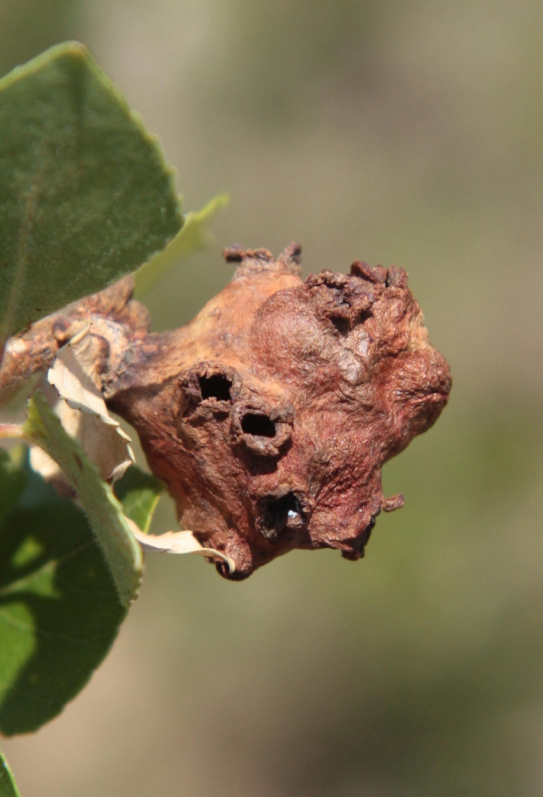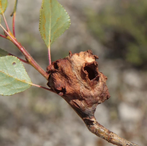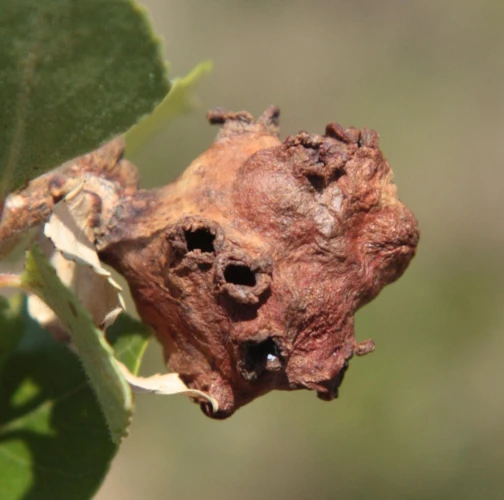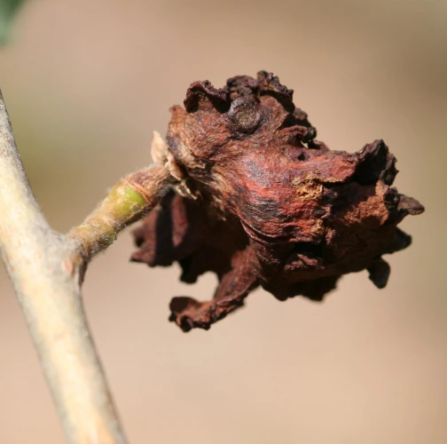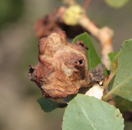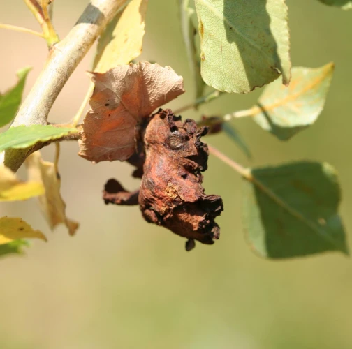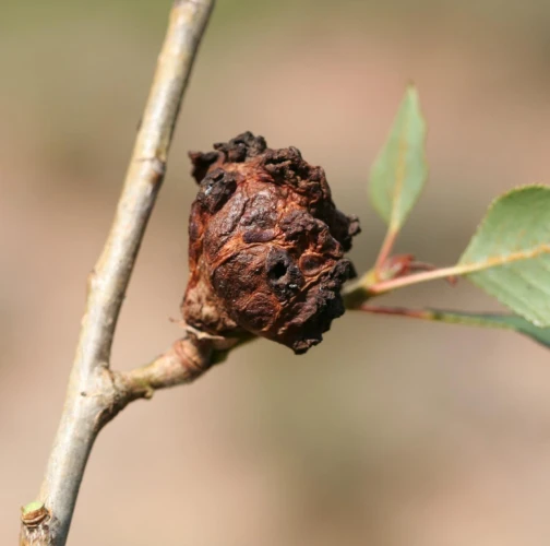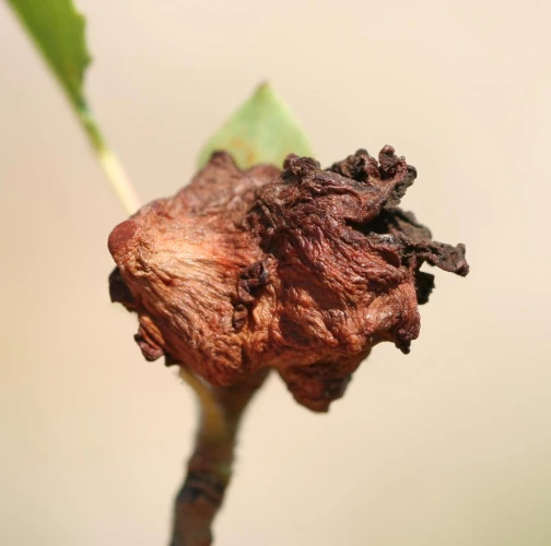 Pľuzgierovitá, tenkostenná, nepravidelne tvarovaná hálka s priemerom 3-4 cm. Zelená, neskôr hnedá až čierna.