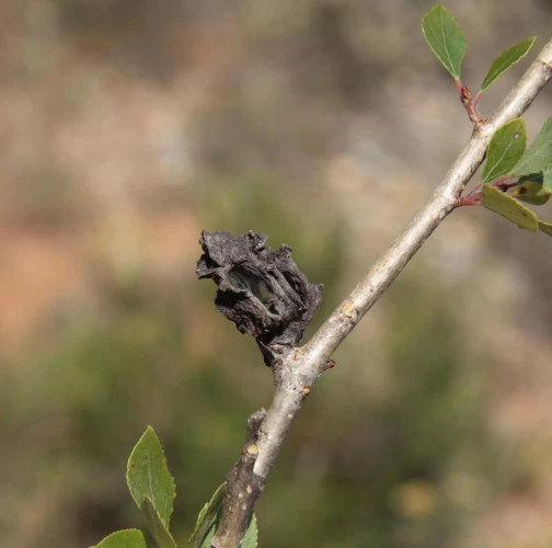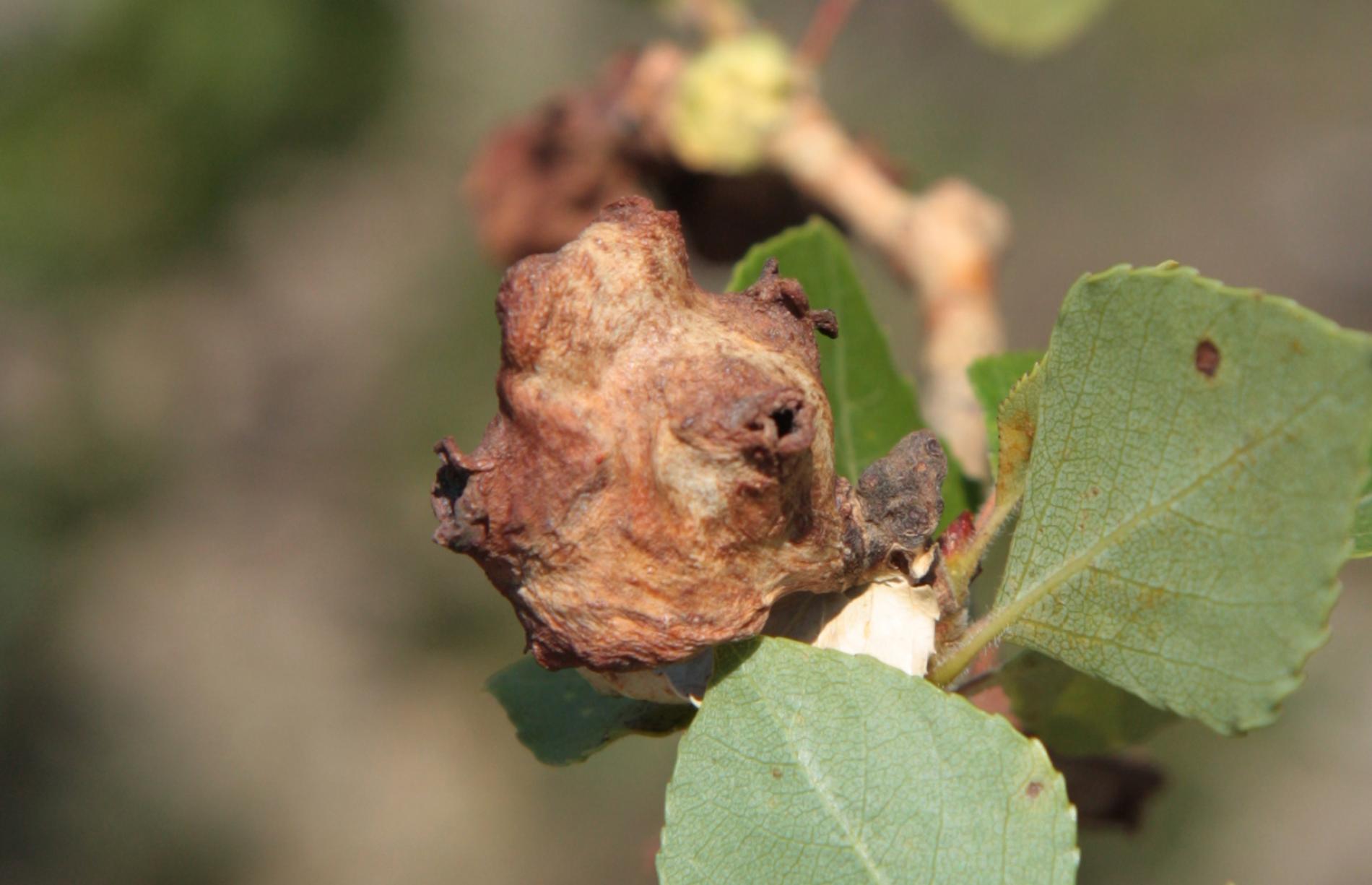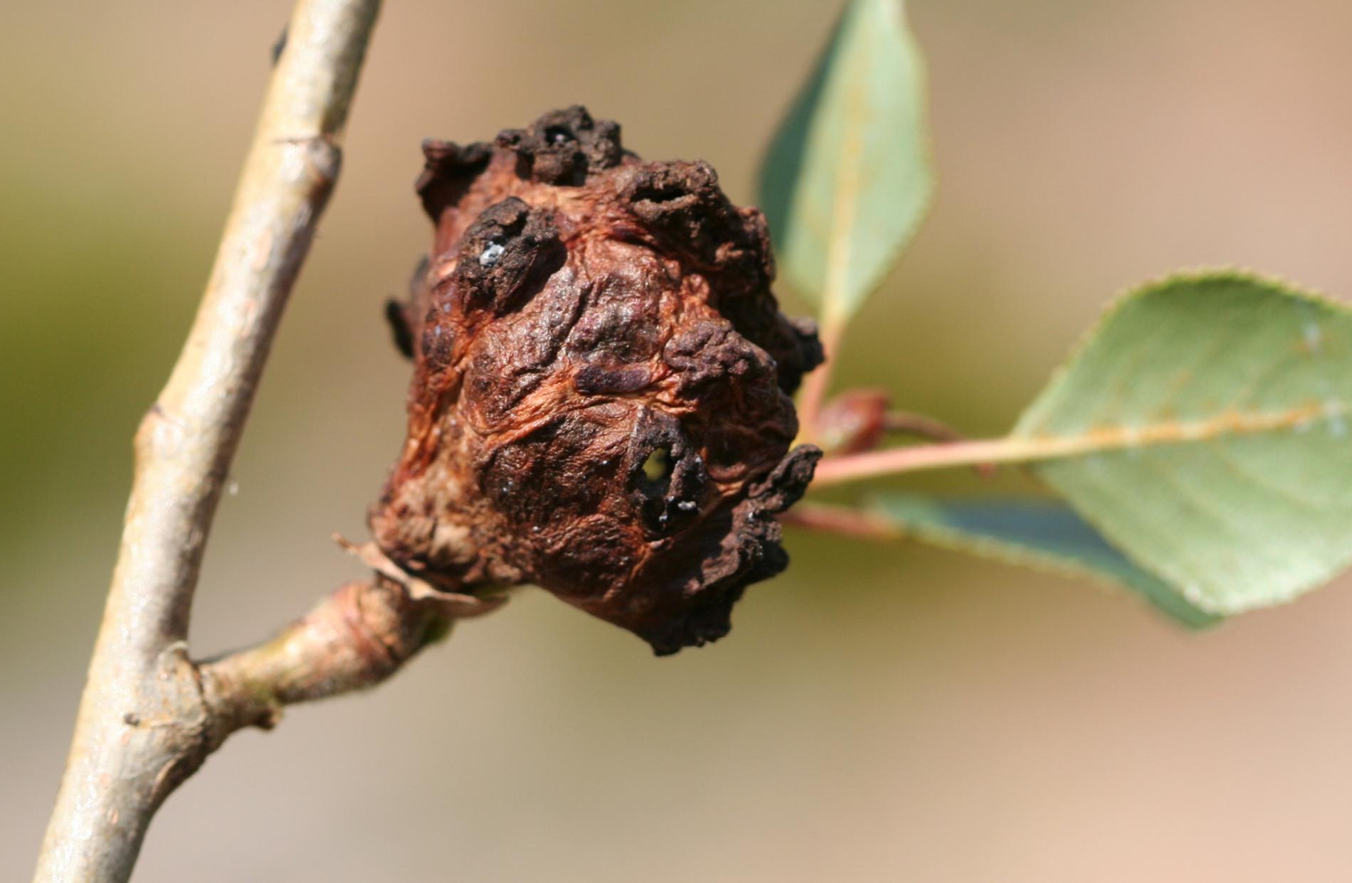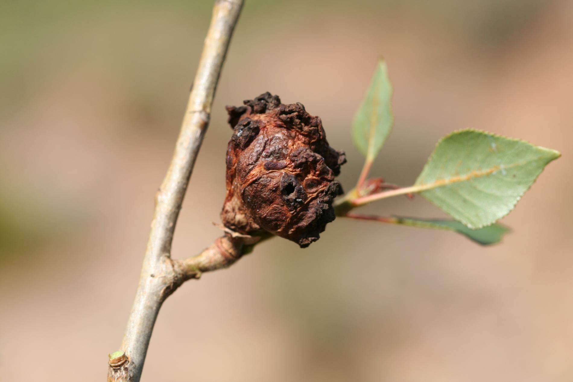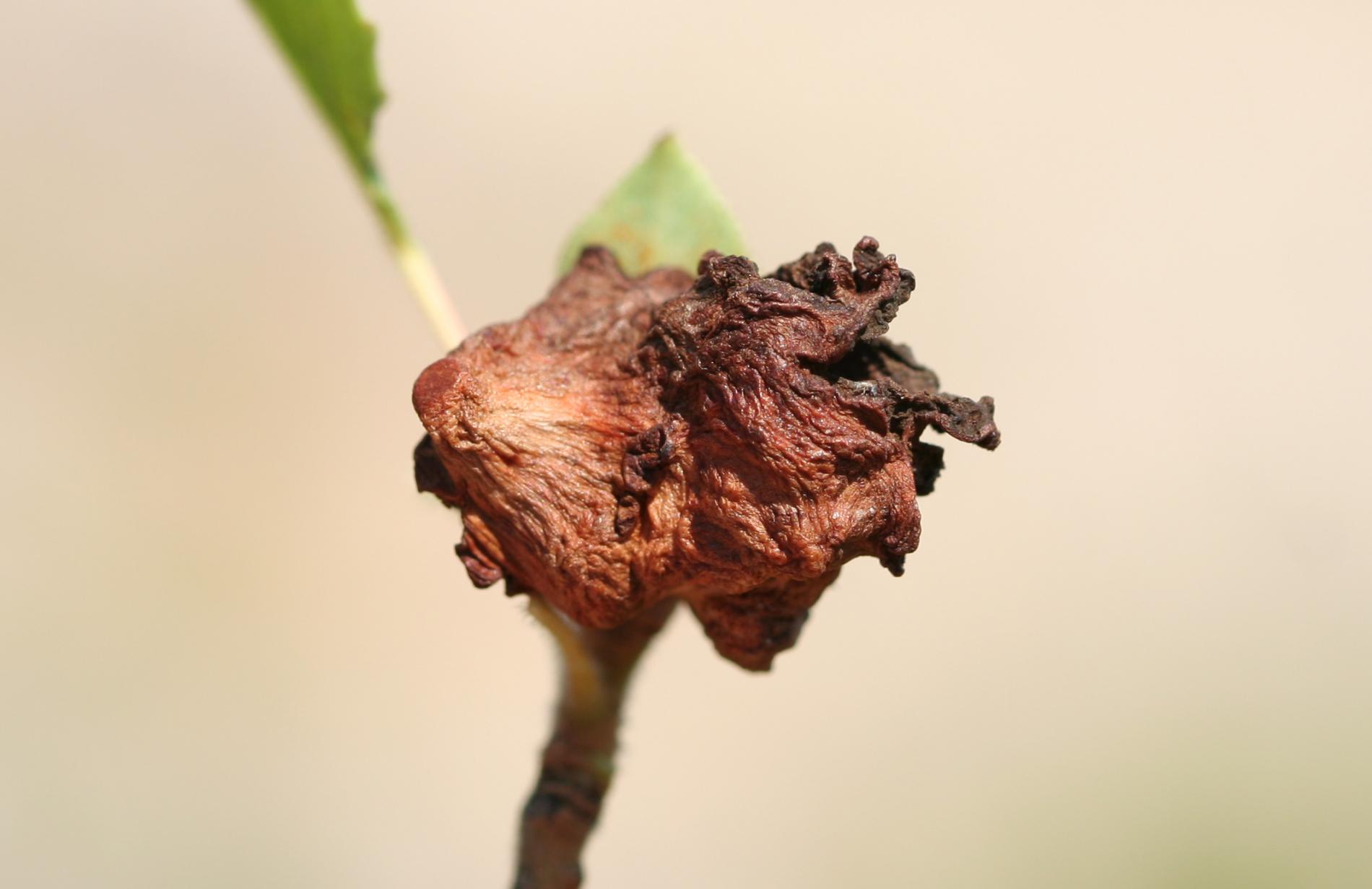 Pľuzgierovitá, tenkostenná, nepravidelne tvarovaná hálka s priemerom 3-4 cm. Zelená, neskôr hnedá až čierna.