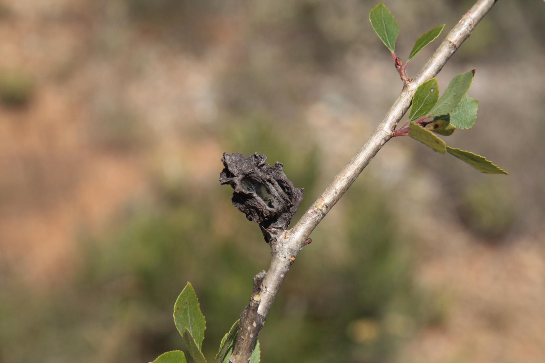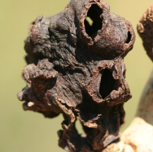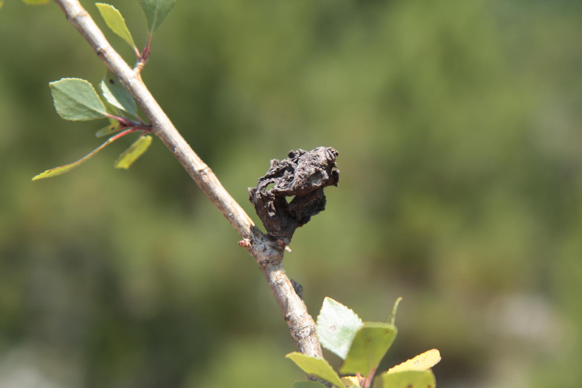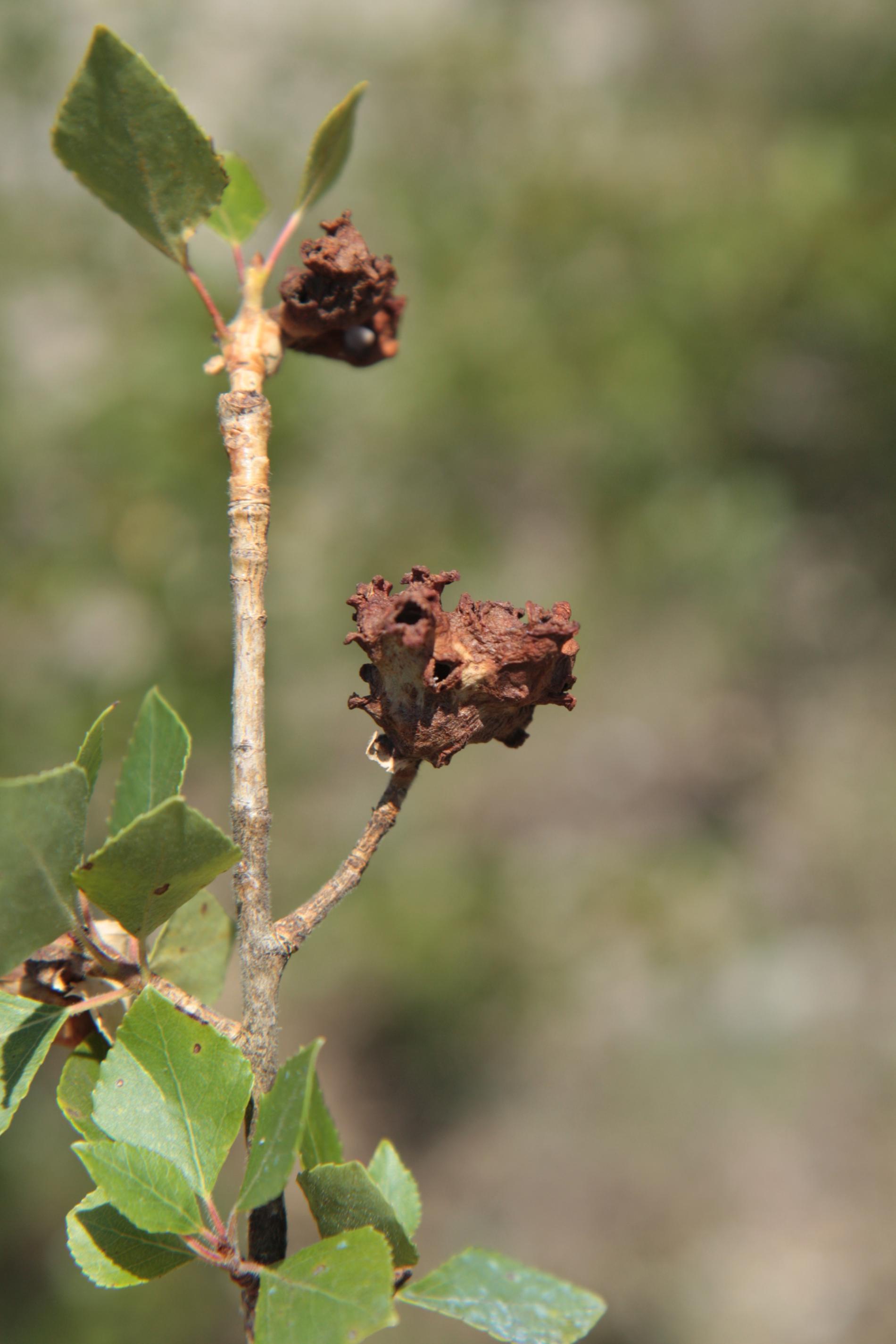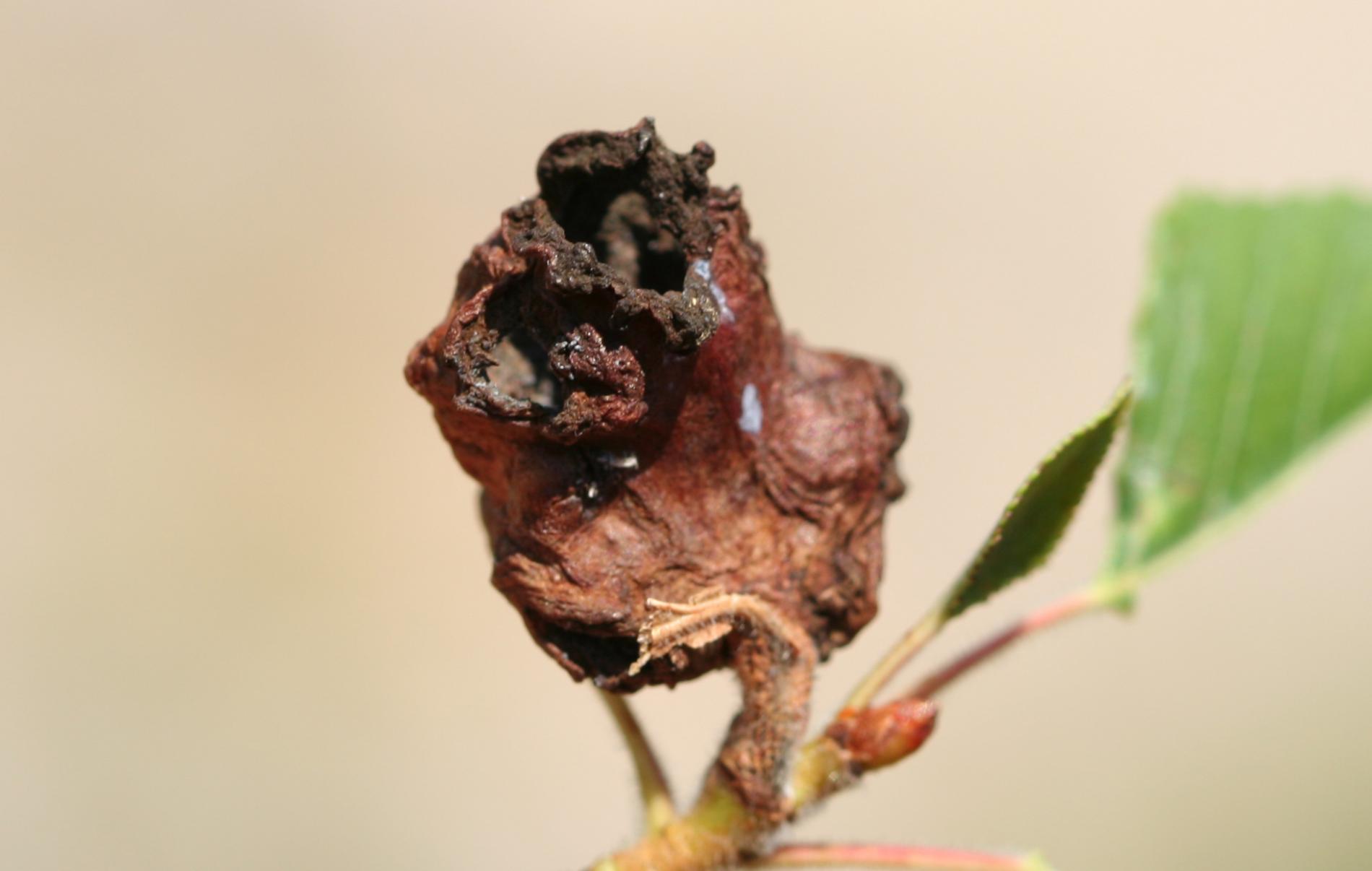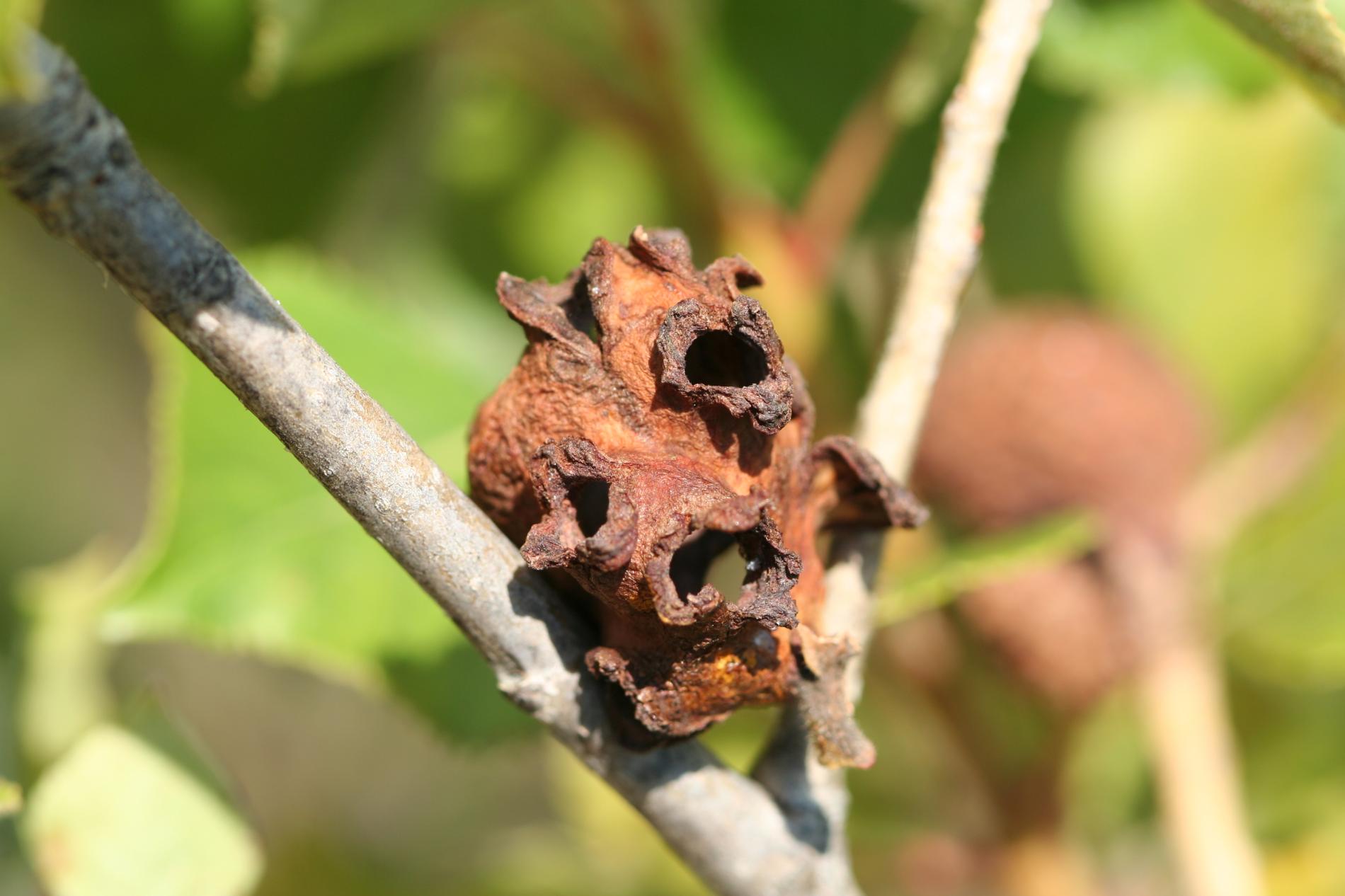 Pľuzgierovitá, tenkostenná, nepravidelne tvarovaná hálka s priemerom 3-4 cm. Zelená, neskôr hnedá až čierna.