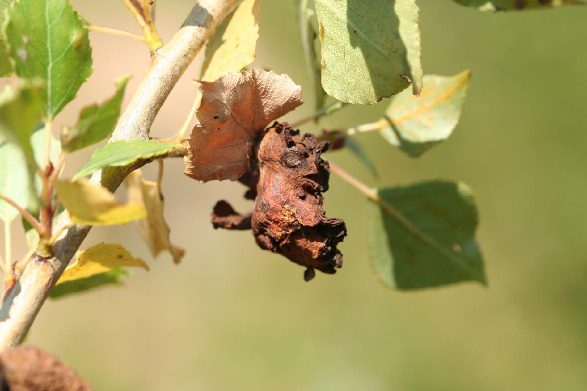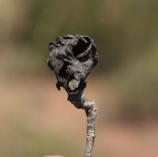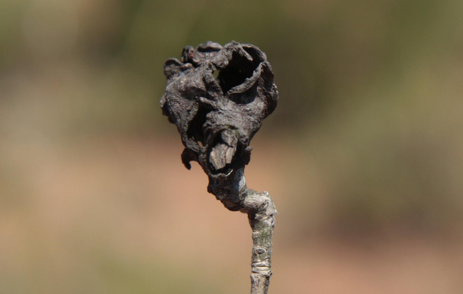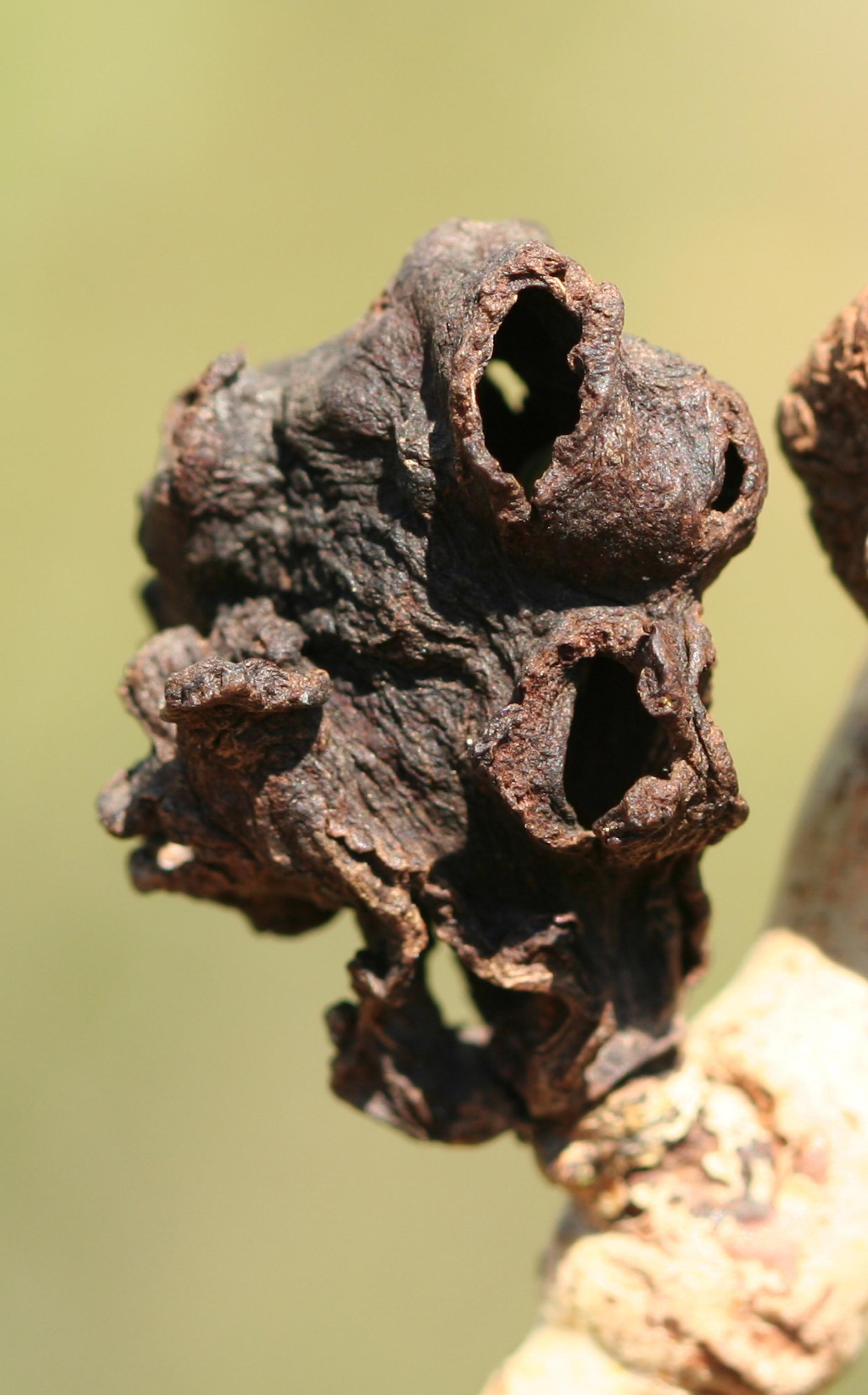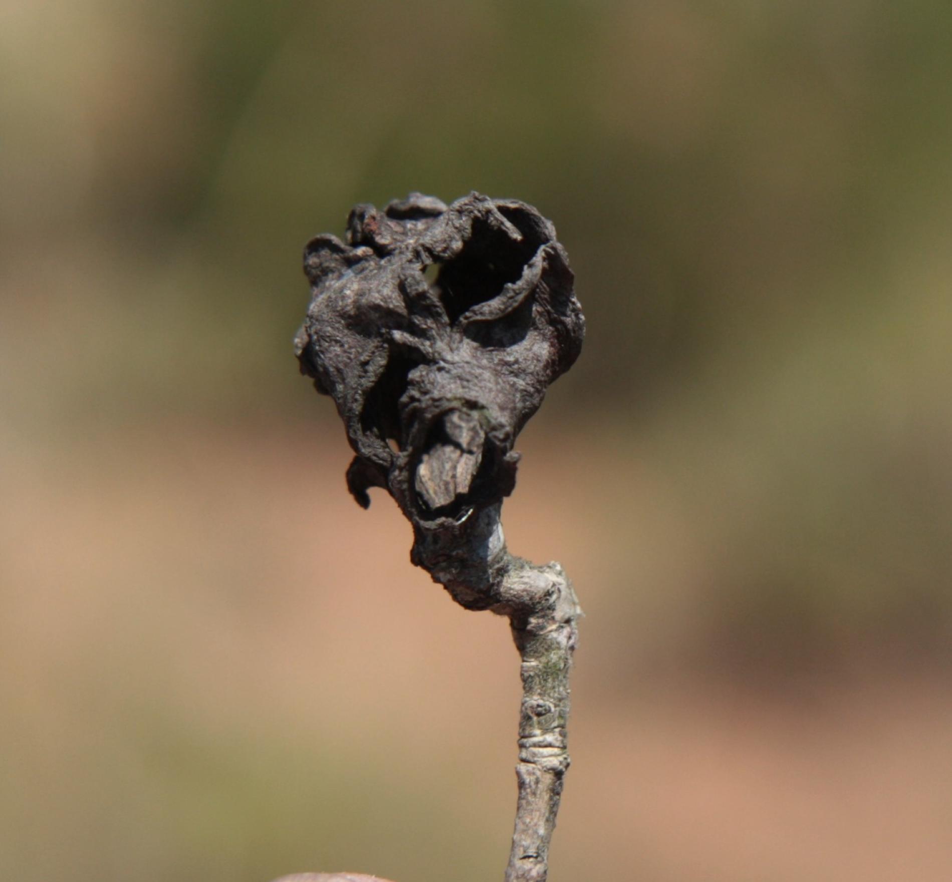 Pľuzgierovitá, tenkostenná, nepravidelne tvarovaná hálka s priemerom 3-4 cm. Zelená, neskôr hnedá až čierna.