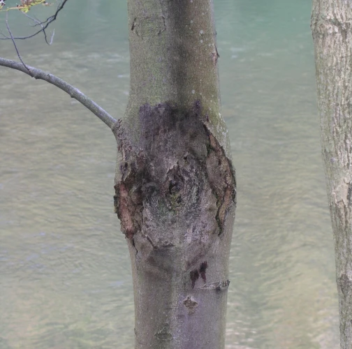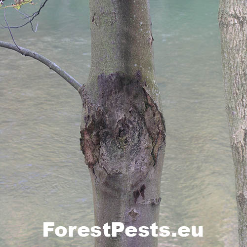 Rakovina na kmeni je veľmi charakteristická, vo vpadnutej strednej časti rakoviny sa vytvárajú čierne hrudky plodníc – peritéciá, z ktorých sa uvoľňujú askospóry a tie infikujú ďalšie kmene
