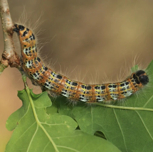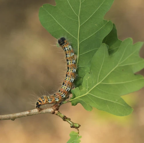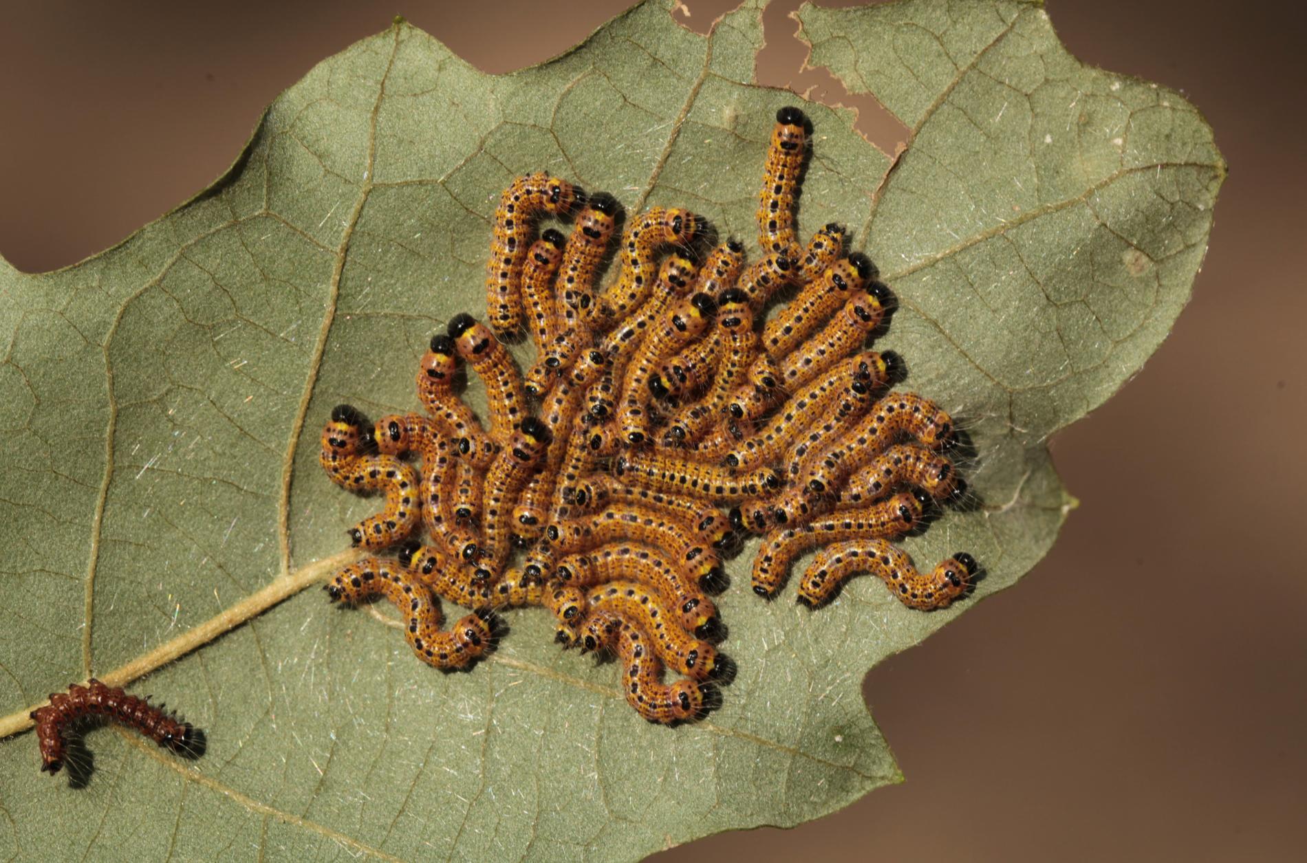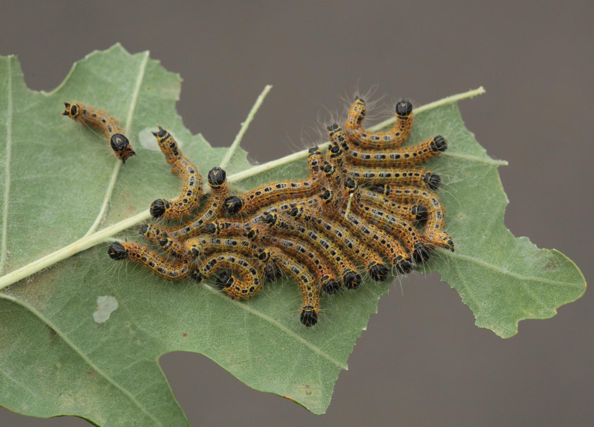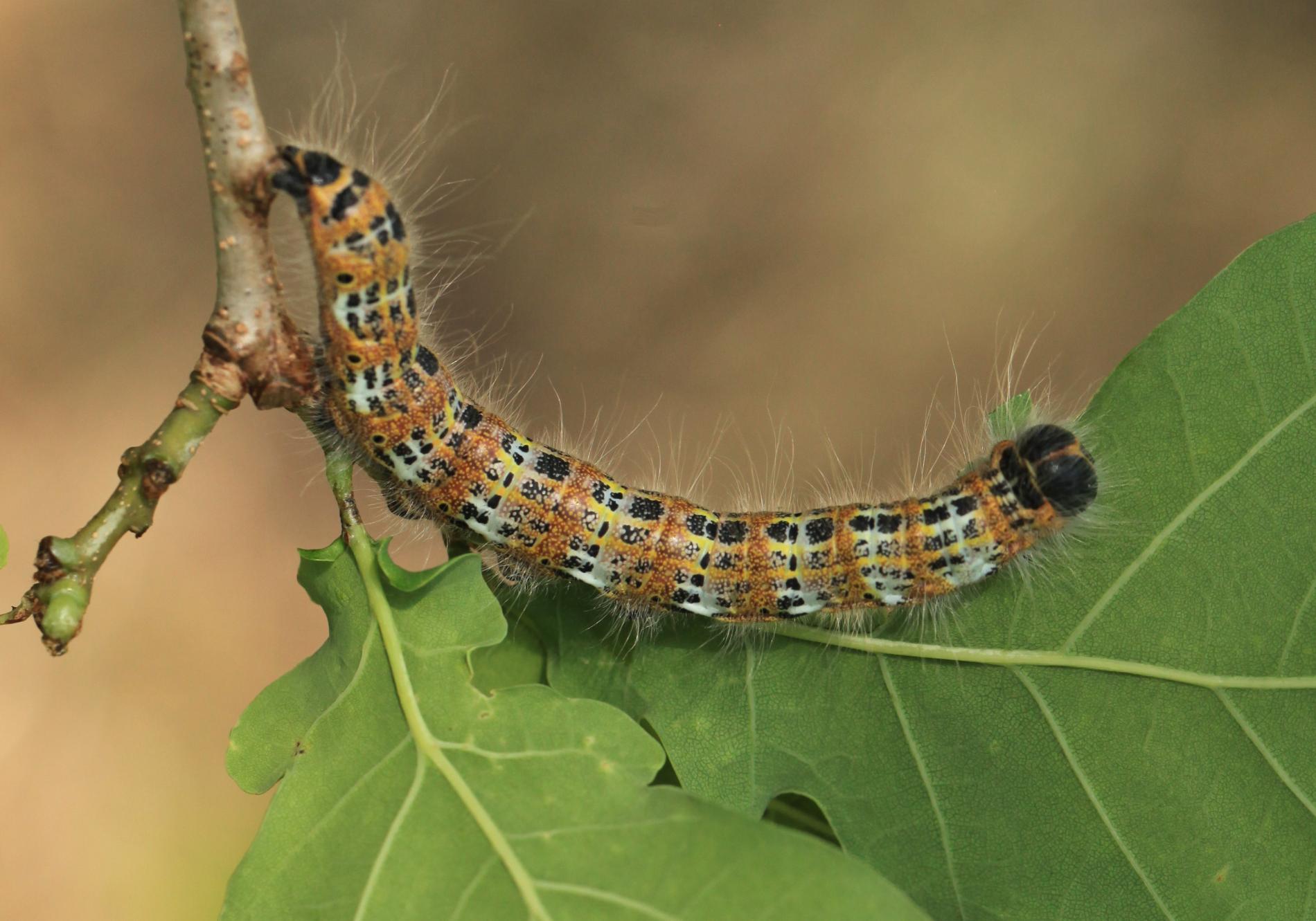 Larvy sú pestro sfarbené s čiernymi, biely a žltými pásmi.