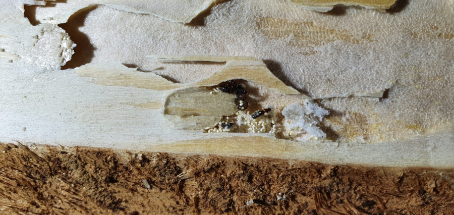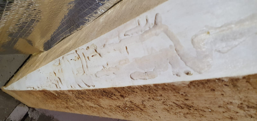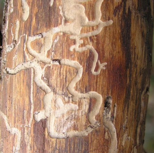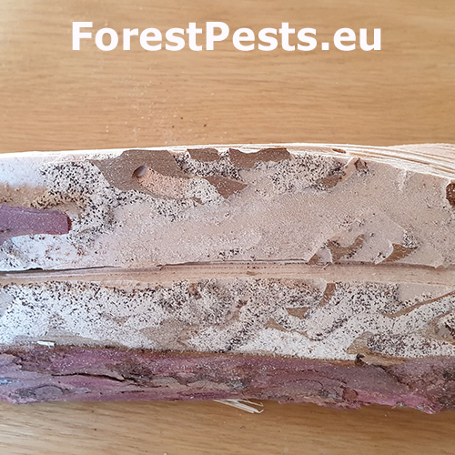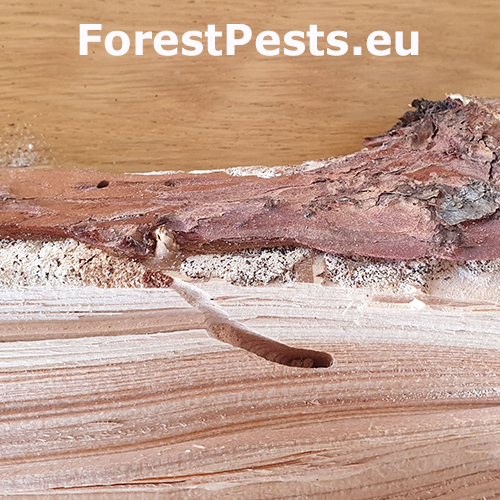 Larvy vyžierajú najskôr pod kôrou chodby zarezané pár milimetrov do dreva a neskôr sa idú kukliť hákovitou chodbou 1 až 4 cm do dreva. Belavá drvina má formu krupice a sú v nej tmavé zrnká trusu. Výletové otvory sú eliptické.
