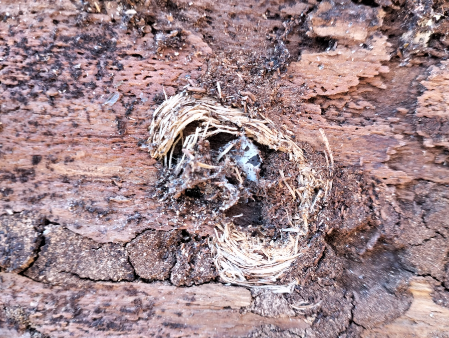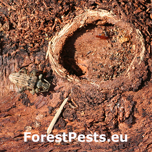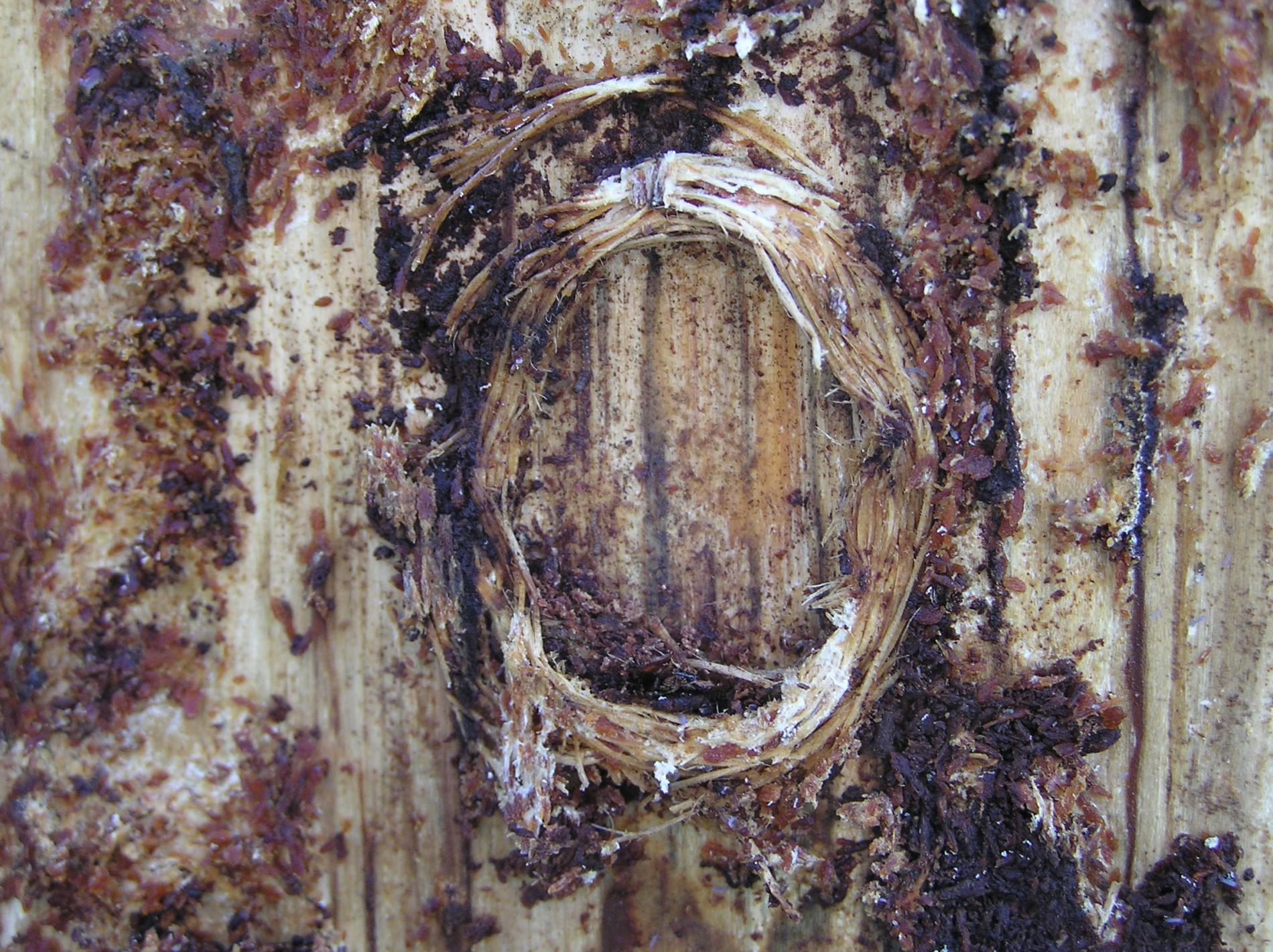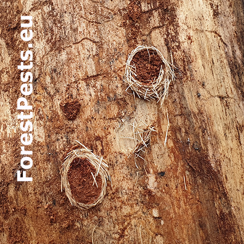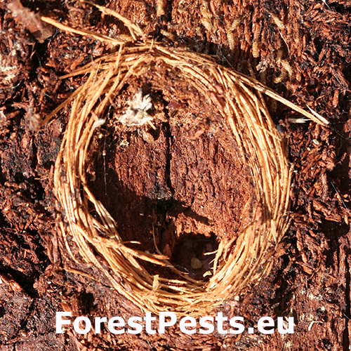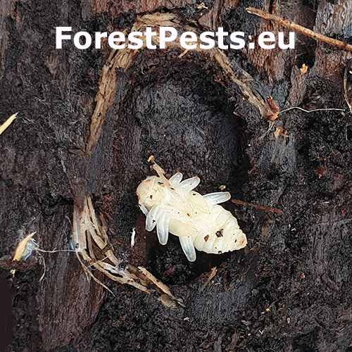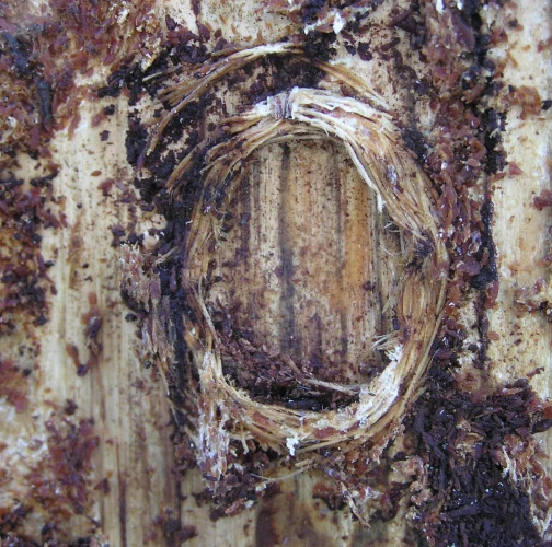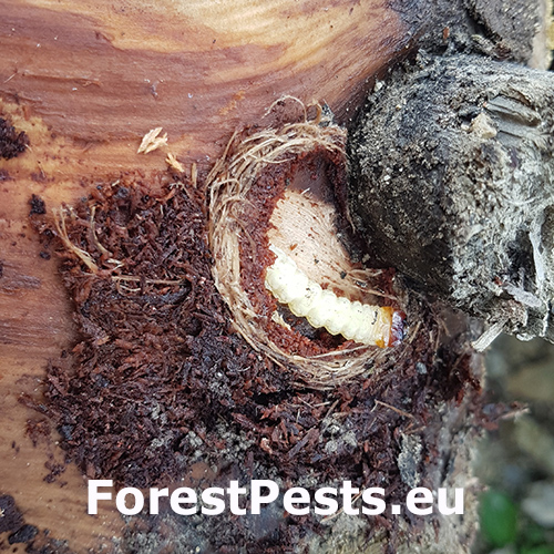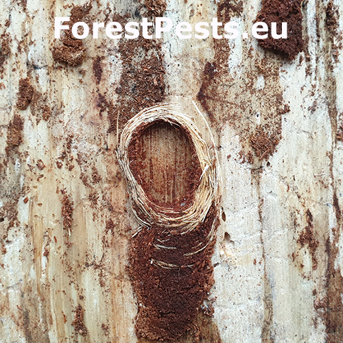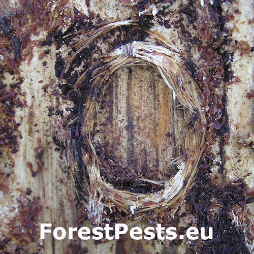 Larvy vyžierajú pod kôrou vlnité chodby, miestami široké až 2 cm. Ak sa larvy vyvíjajú pod tenkou kôrou kuklia sa v dreve, ale zvyčajne žerú pod hrubšou kôrou, kde vytvárajú veľmi typickú kruhovú až eliptickú kuklovú kolísku. Výletové otvory sú oválne.