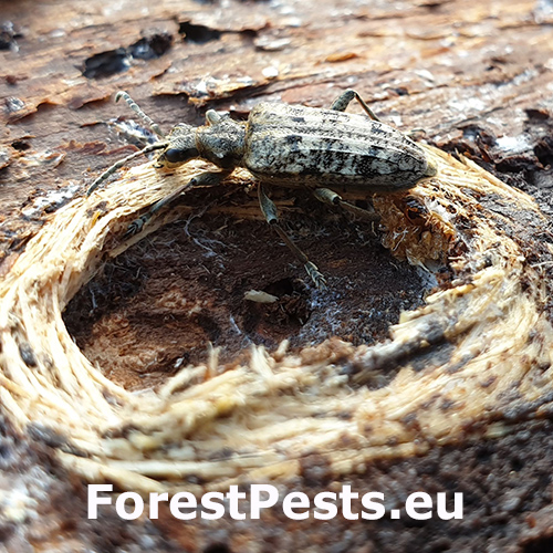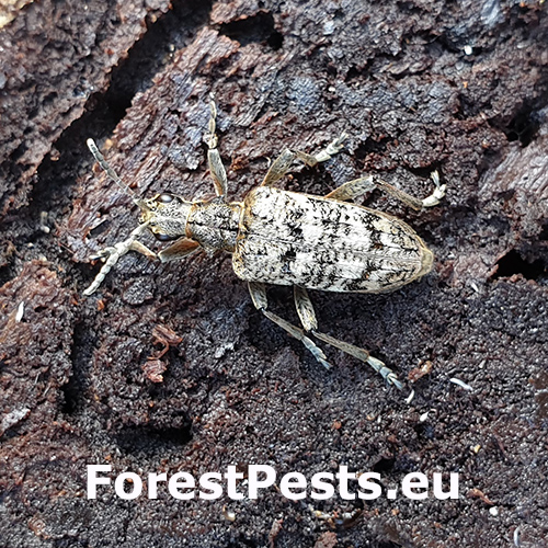 Chrobák veľkosti 10 až 22 mm typického žltohnedého až belavého sfarbenia s dvomi alebo viacerými priečnymi čiernymi pásmi na krovkách. Je veľmi hojný. Napáda najmä ihličnaté pne alebo stojace stromy oslabené nejakým škodlivým činiteľom. Generácia je dvojročná. Tento druh môže fyziologicky technicky poškodzovať oslabené ihličnaté stromy.
