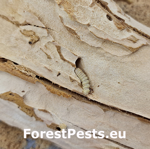 Eliptické výletové otvory, drvina sa doslova sype z napadnuté materiálu.