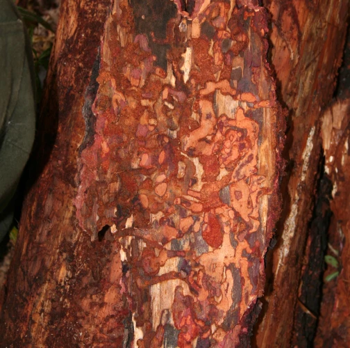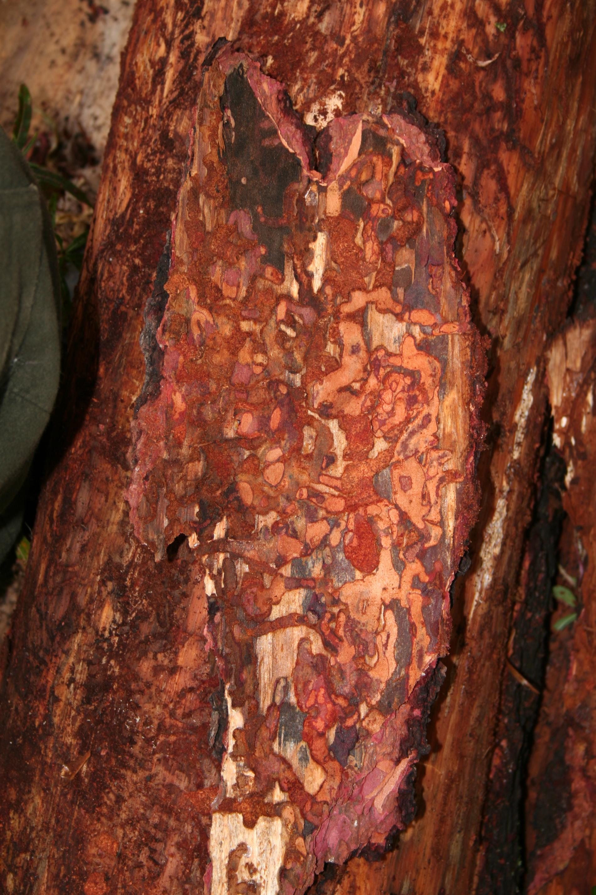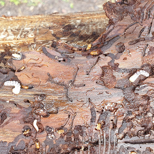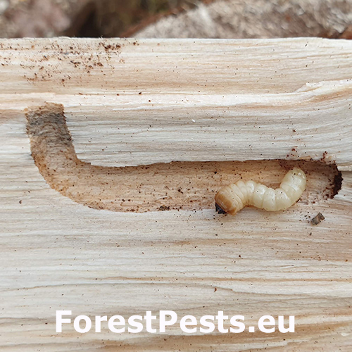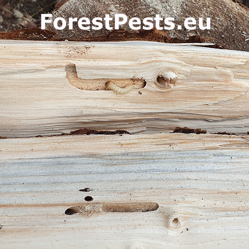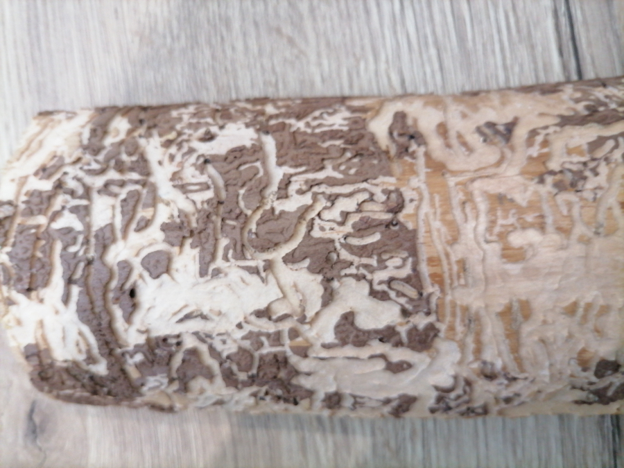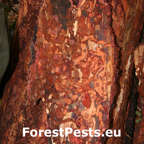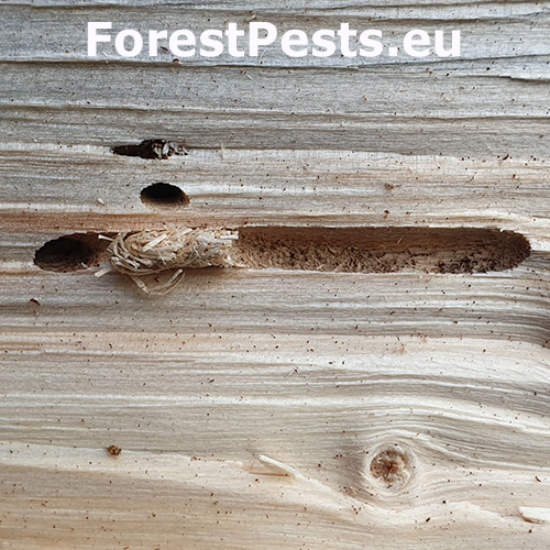 Esovité chodby upchaté drvinou pod kôrou stromov. Šírka chodieb je často aj niekoľko centimetrov.